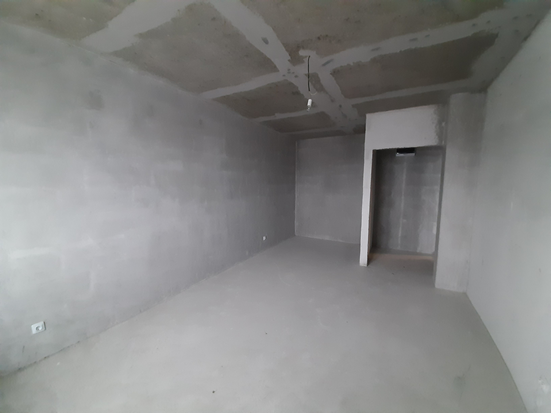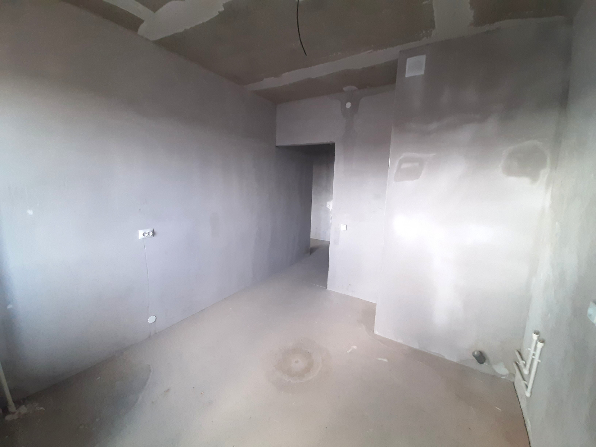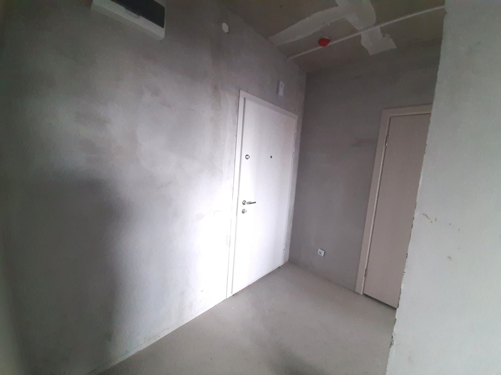 В квартире установлена железная входная дверь, установлена дверь в санузел. Ровный пол и ровные серые стены. Разводка электрики.