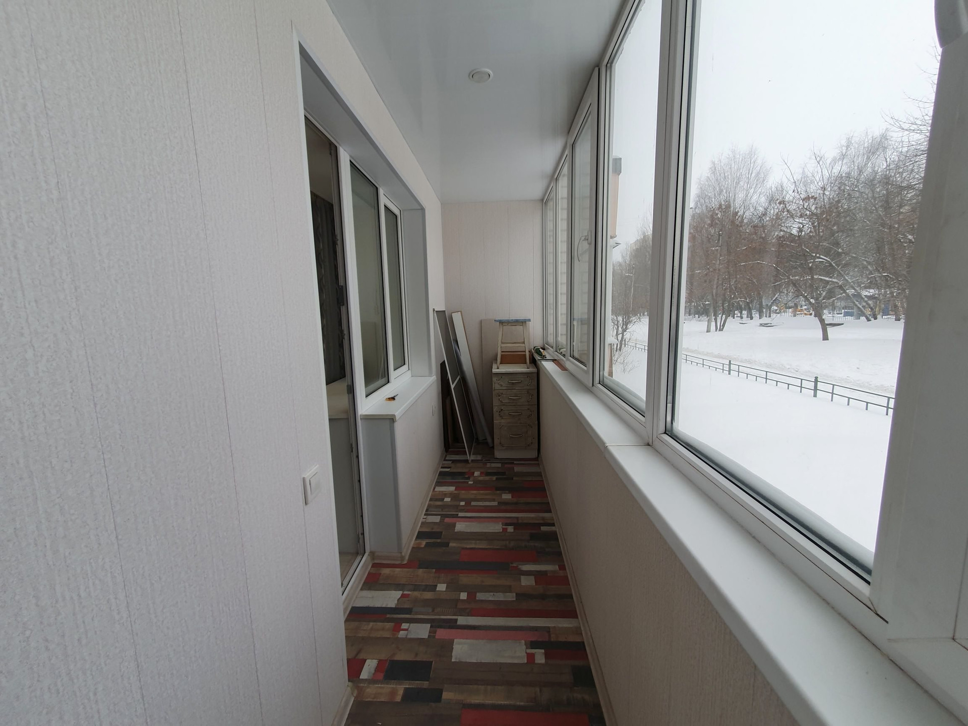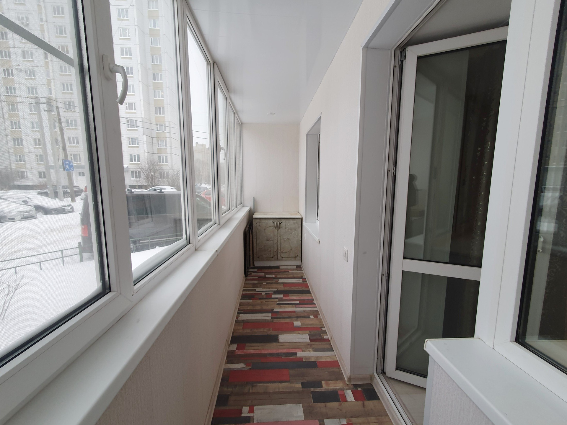 Установлены окна ПВХ, лоджия застеклена. Натяжной потолок по всей квартире. На полу - ламинат. Санузел - плитка.