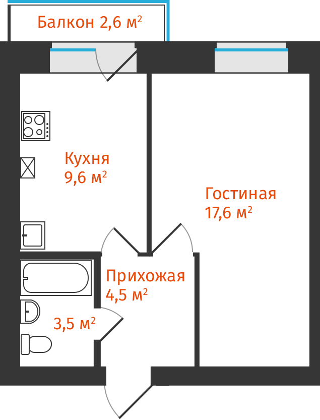 Общая площадь 34.4 м2