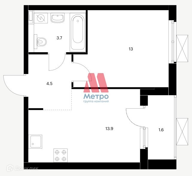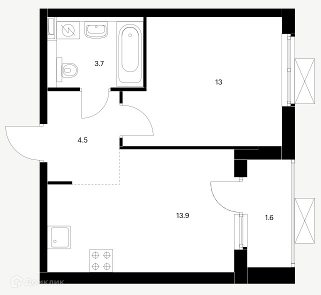 - Кухня-гостинная - 13,9 кв.м., комната - 13 кв.м.,