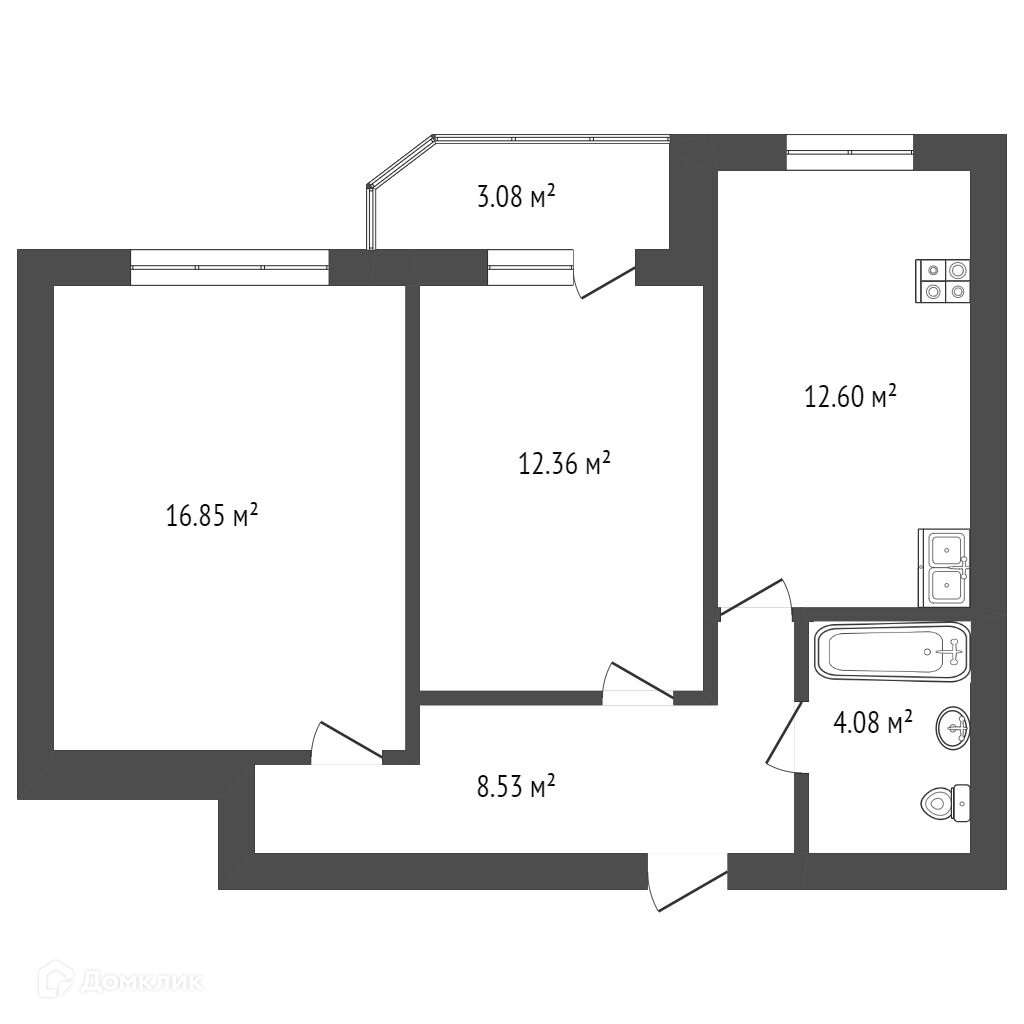 Общая площадь квартиры 57,5 кв.м., комната 1- 16,85 кв.м., комната 2- 12,36 кв.м. кухня 12,6 кв.м., санузел совмещённый, застеклённая лоджия с выходом в комнату .