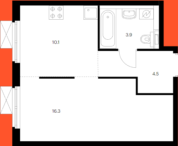 НЕ угловая, в середине дома. Удобная планировка, вид из окон на парк, светлая, теплая, все продумано для будущих жильцов. Площадь квартиры 34,8 м², большая кухня 10,1 м², комната 16,3 м², удобный коридор, с местом под шкаф 4,5 м², санузел 3,9 м².