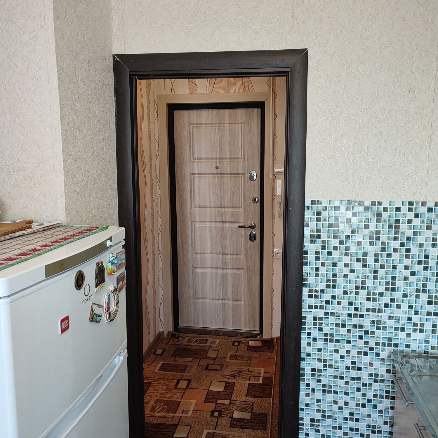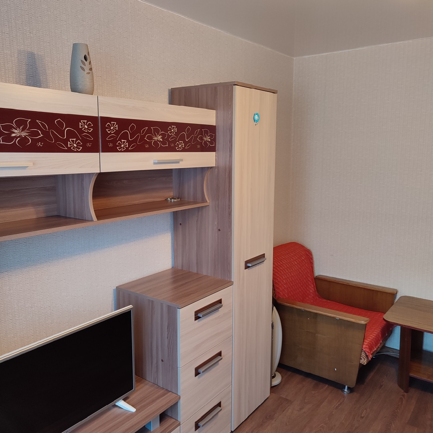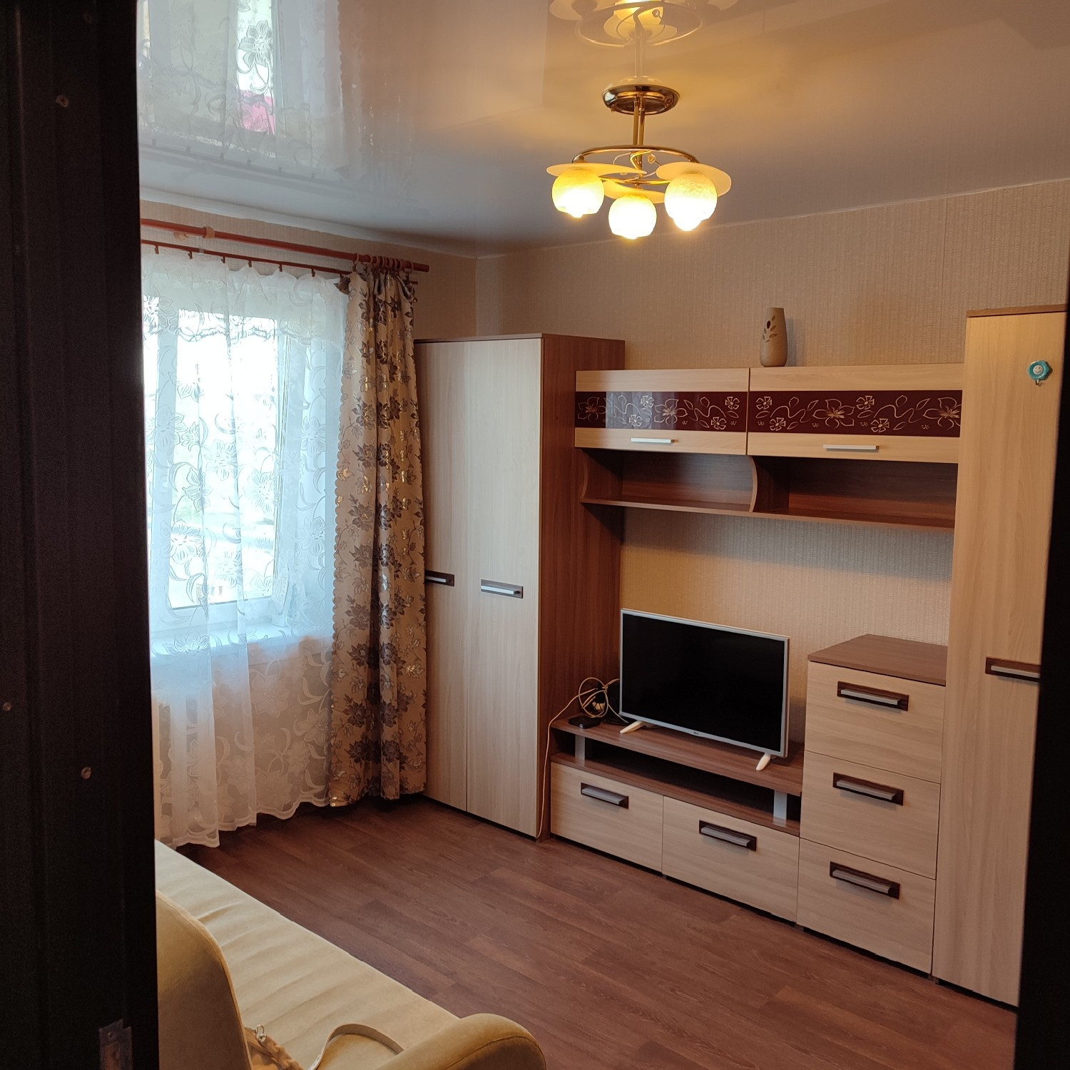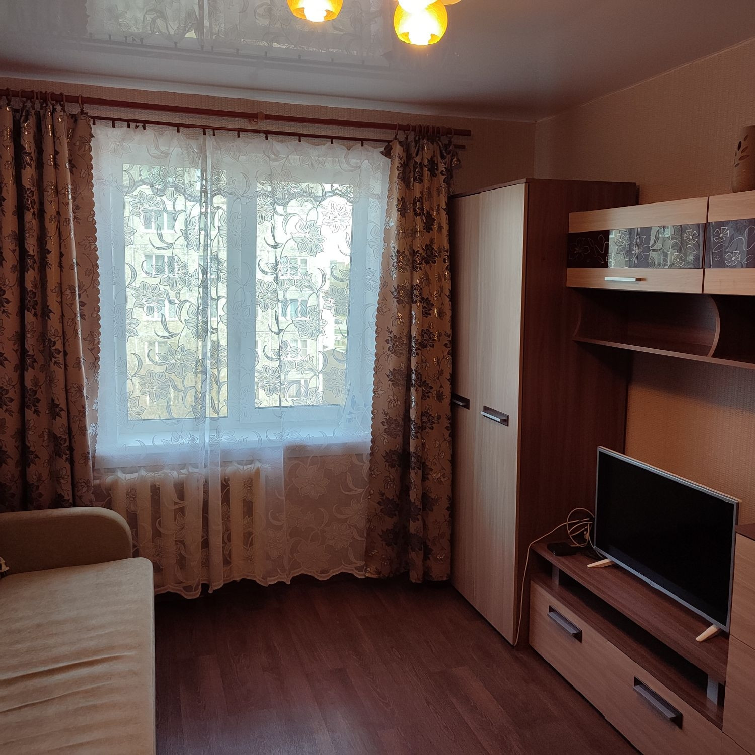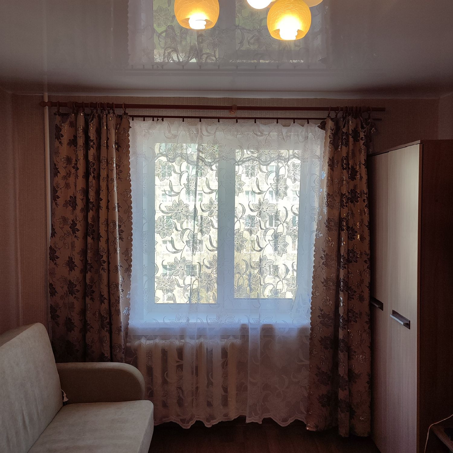 На полу линолеум, потолки натяжные, окна ПВХ, современные межкомнатные двери, отличная входная дверь, с/у совмещен, установлены счетчики на воду, есть маленькая кладовка.