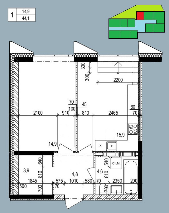 Общая площадь 44.1 м2