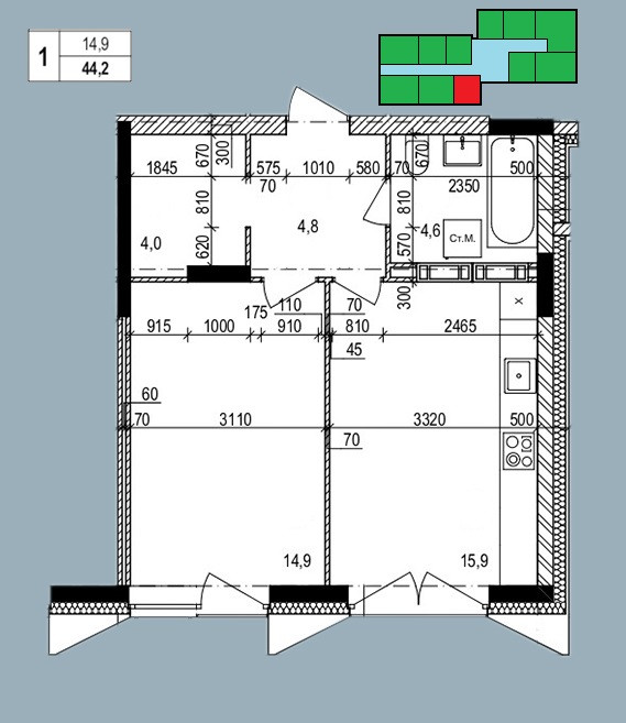 Общая площадь 44.2 м2