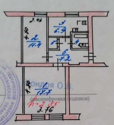 Площадь 47,2, комнаты 11,4 и 17,7 раздельные, кухня 6,9, санузел совмещен, есть кладовка, квартира отличной планировки, высота потолков 3 метра, расположение окон на обе стороны, светлая, сухая, требует капитального ремонта.