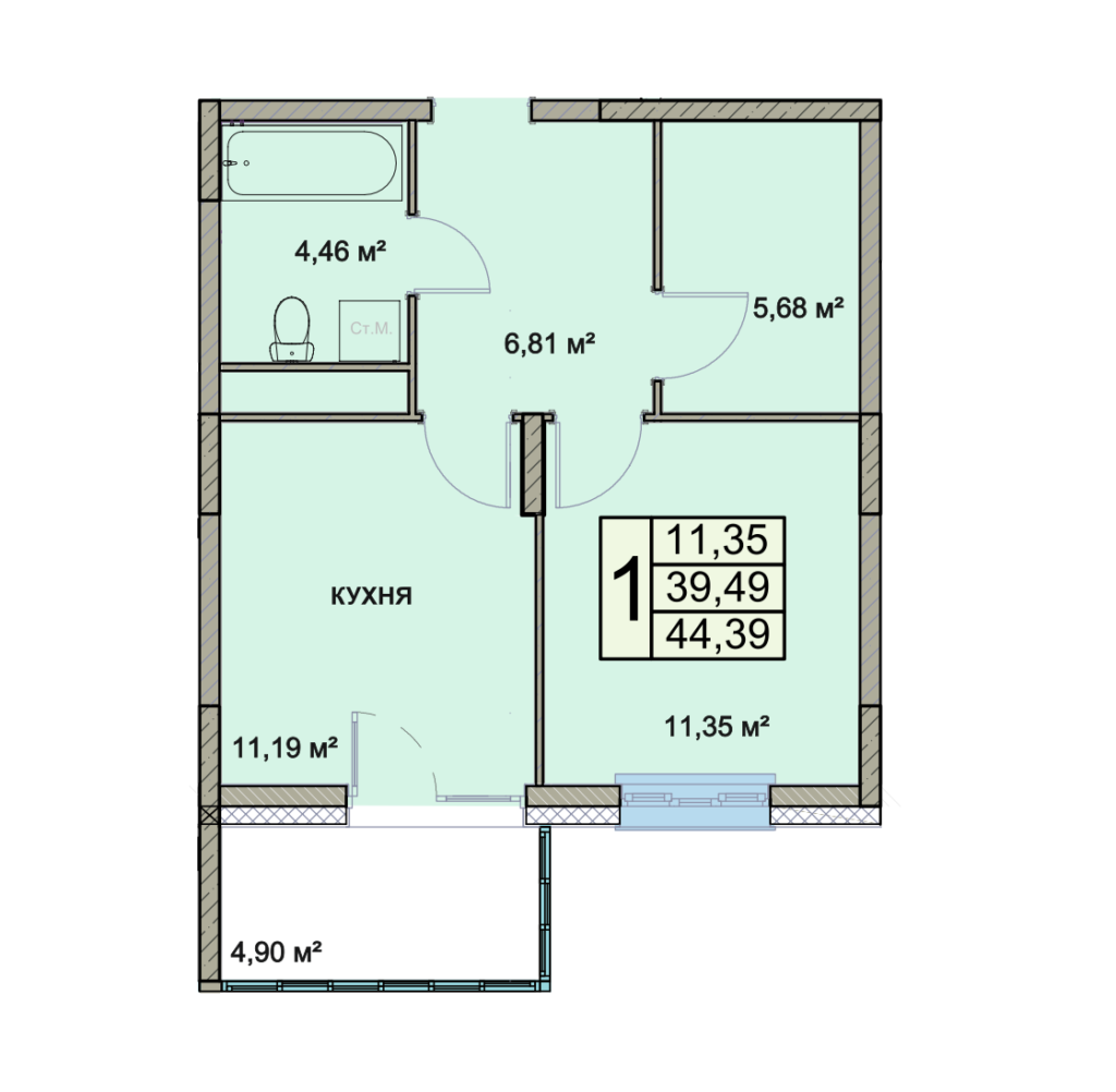 Общая площадь 44.4 м2