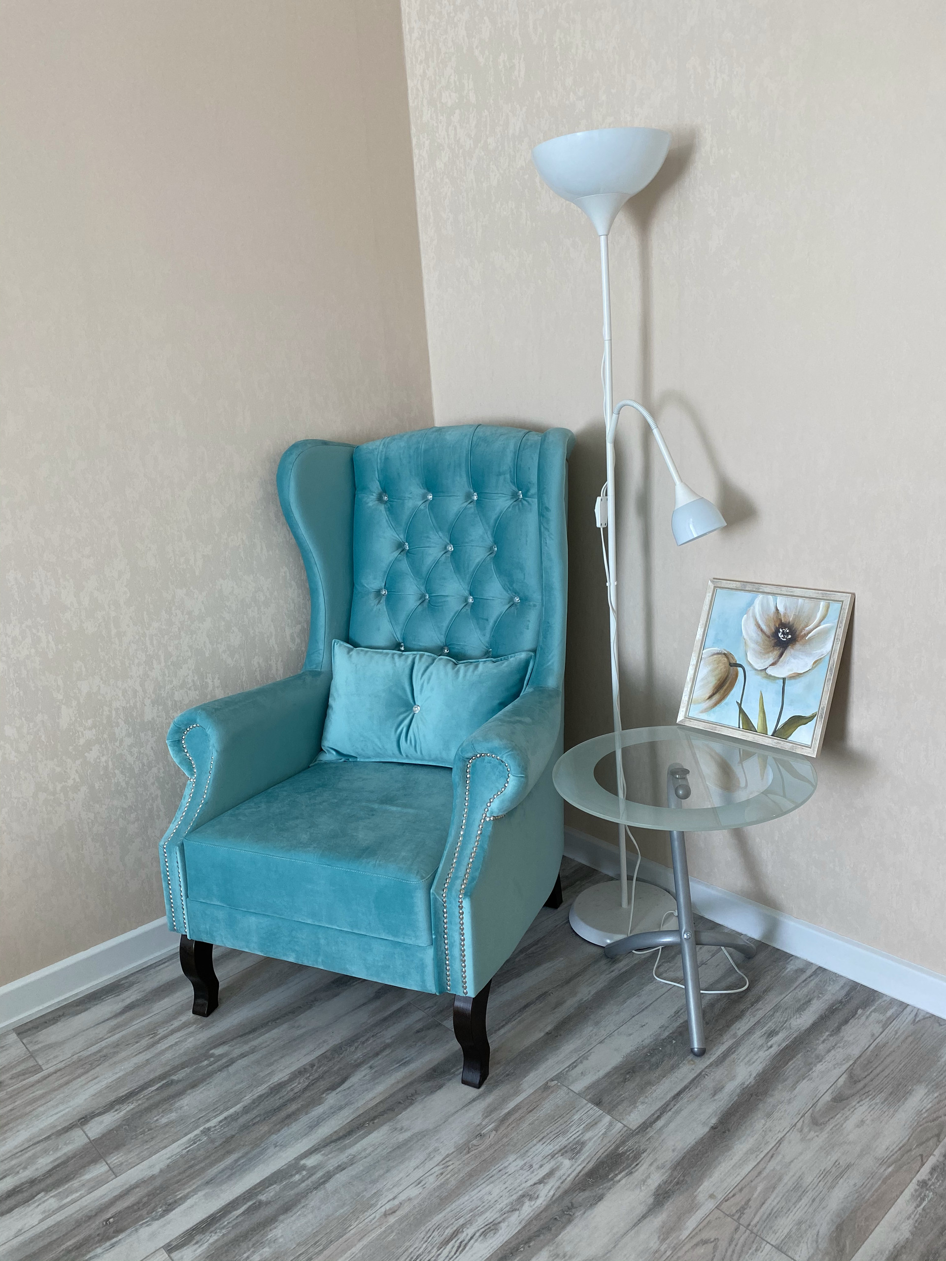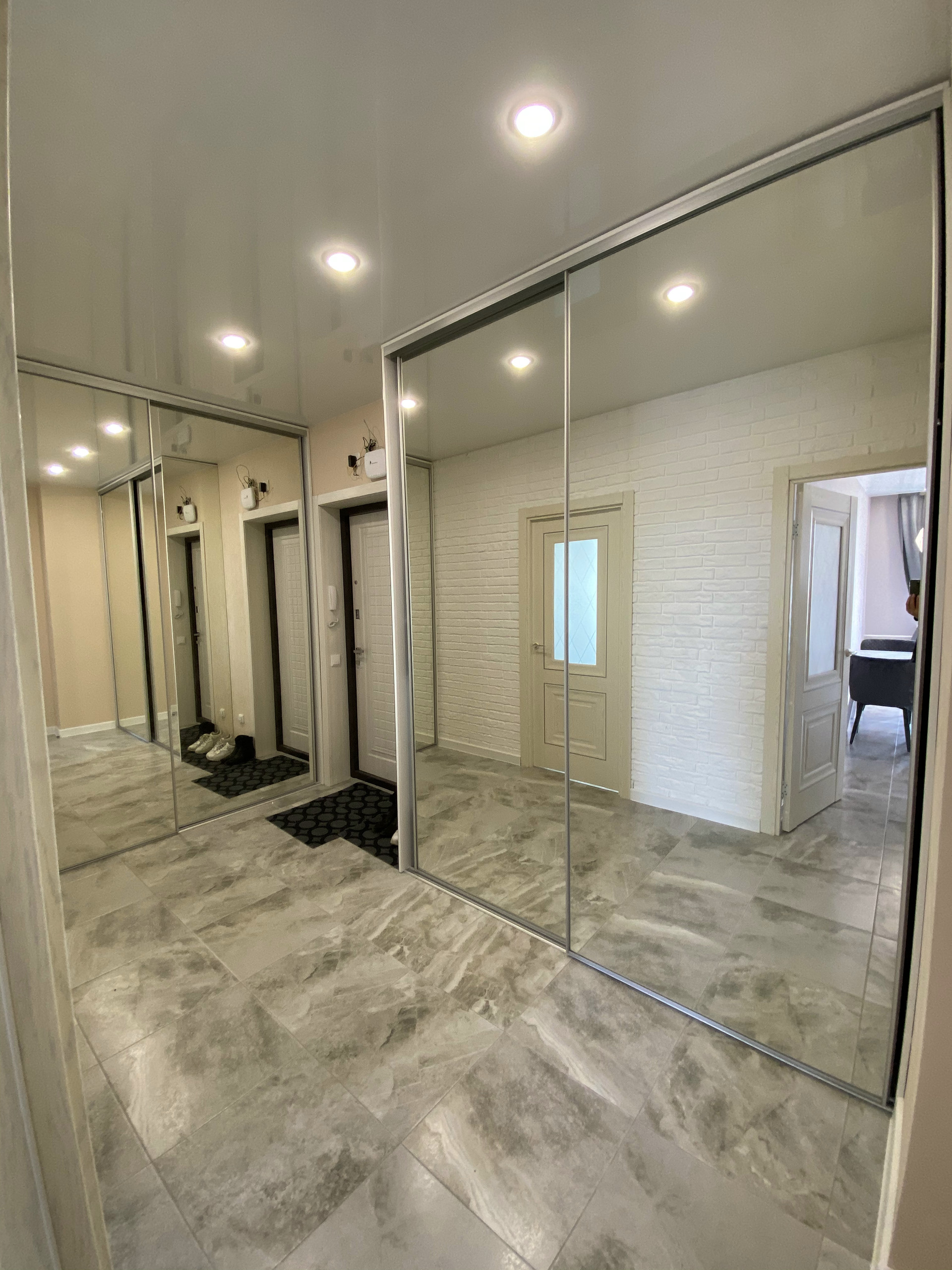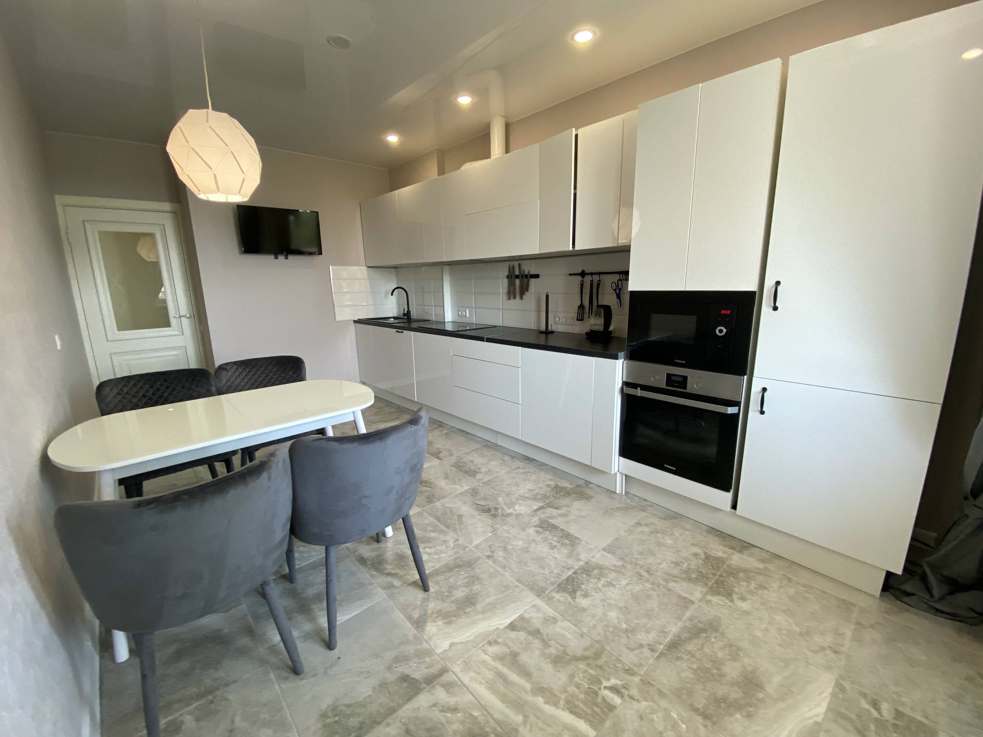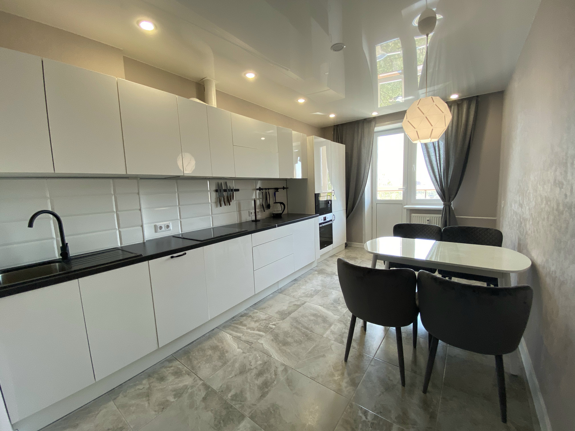 - Полы ламинат и плитка, натяжной потолок с точечной подсветкой