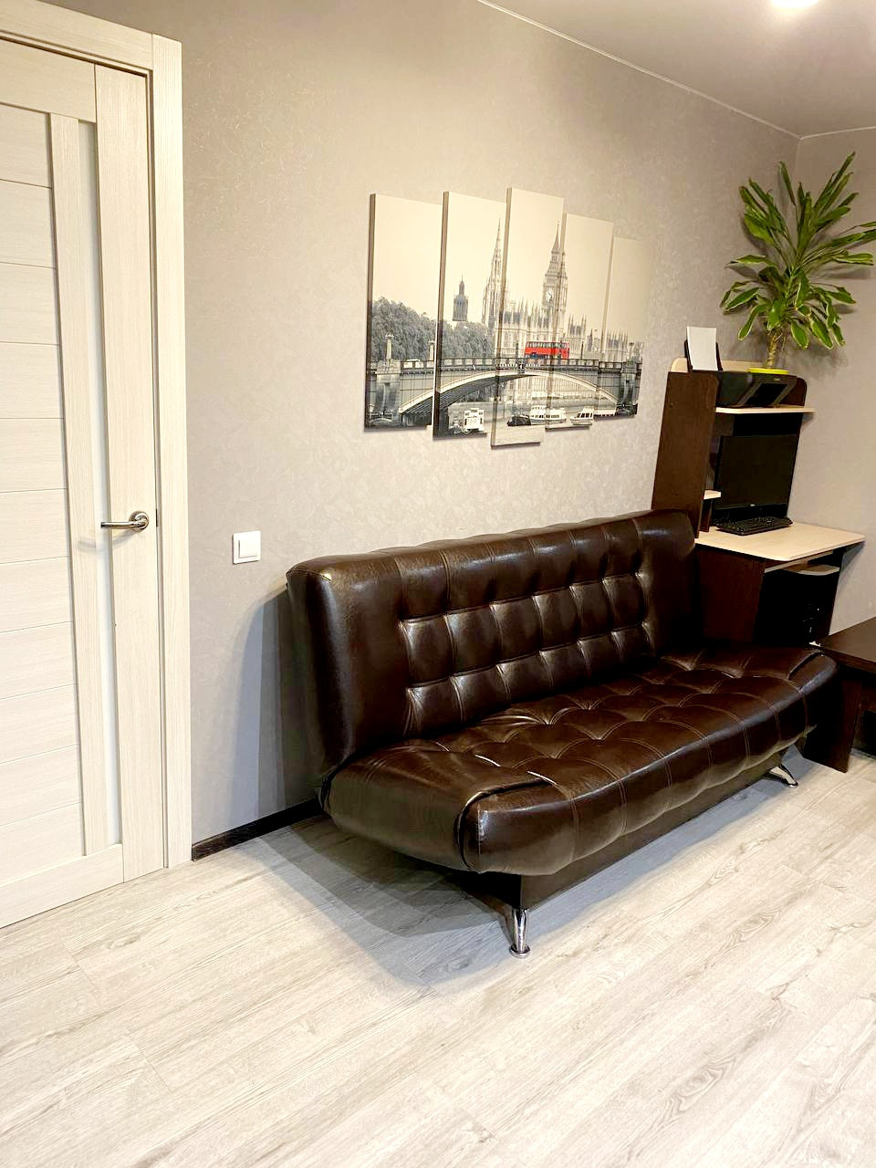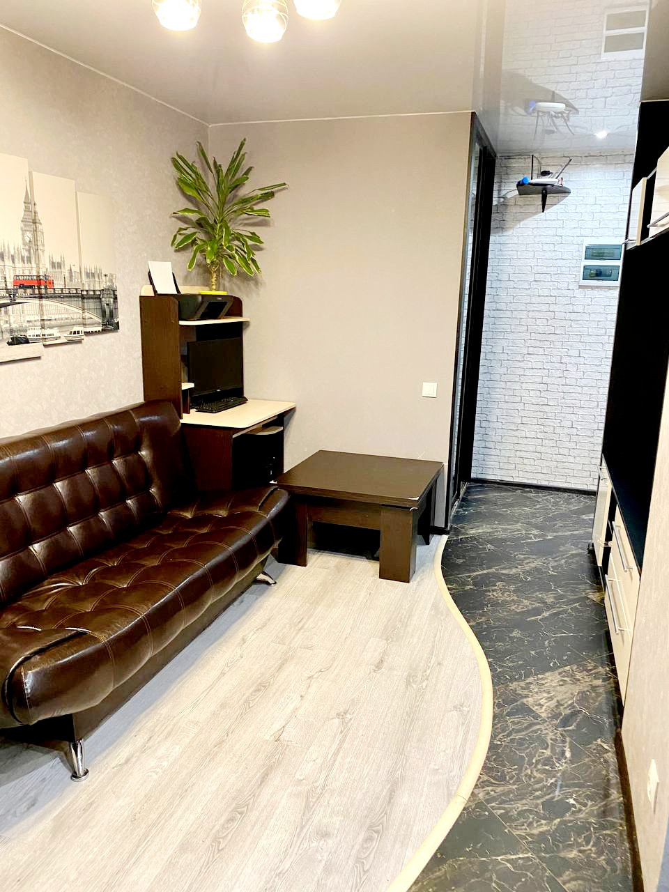 На полу ламинат и плитка.