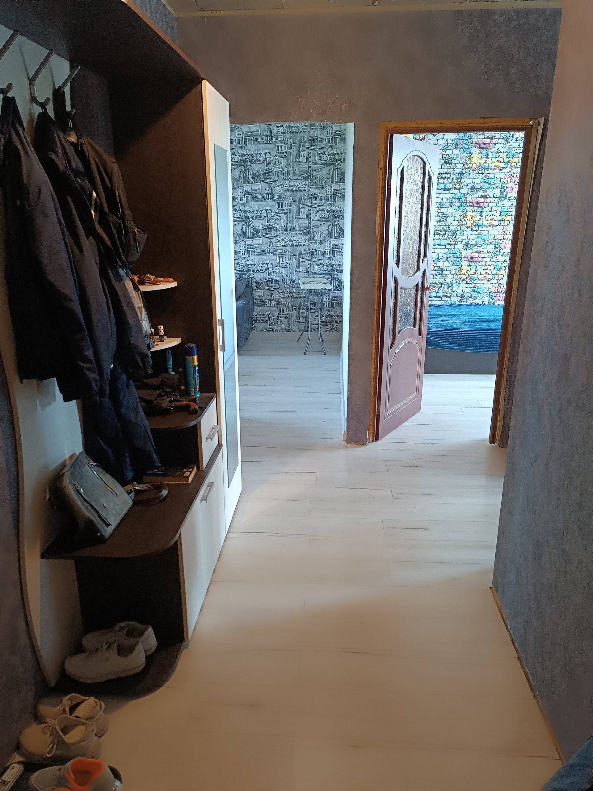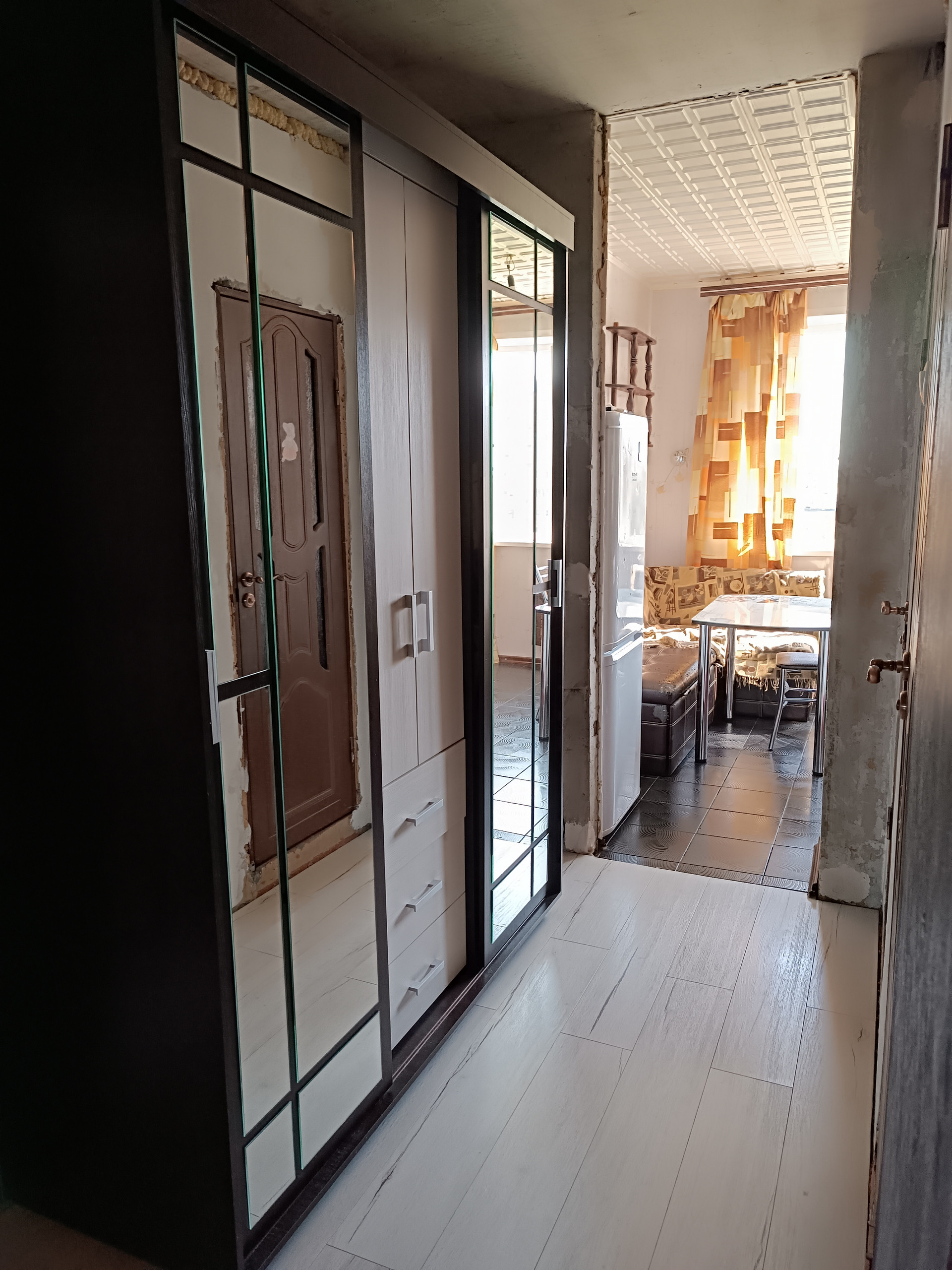 Пол в коридоре и комнатах - ламинат, в кухне - новая плитка.
