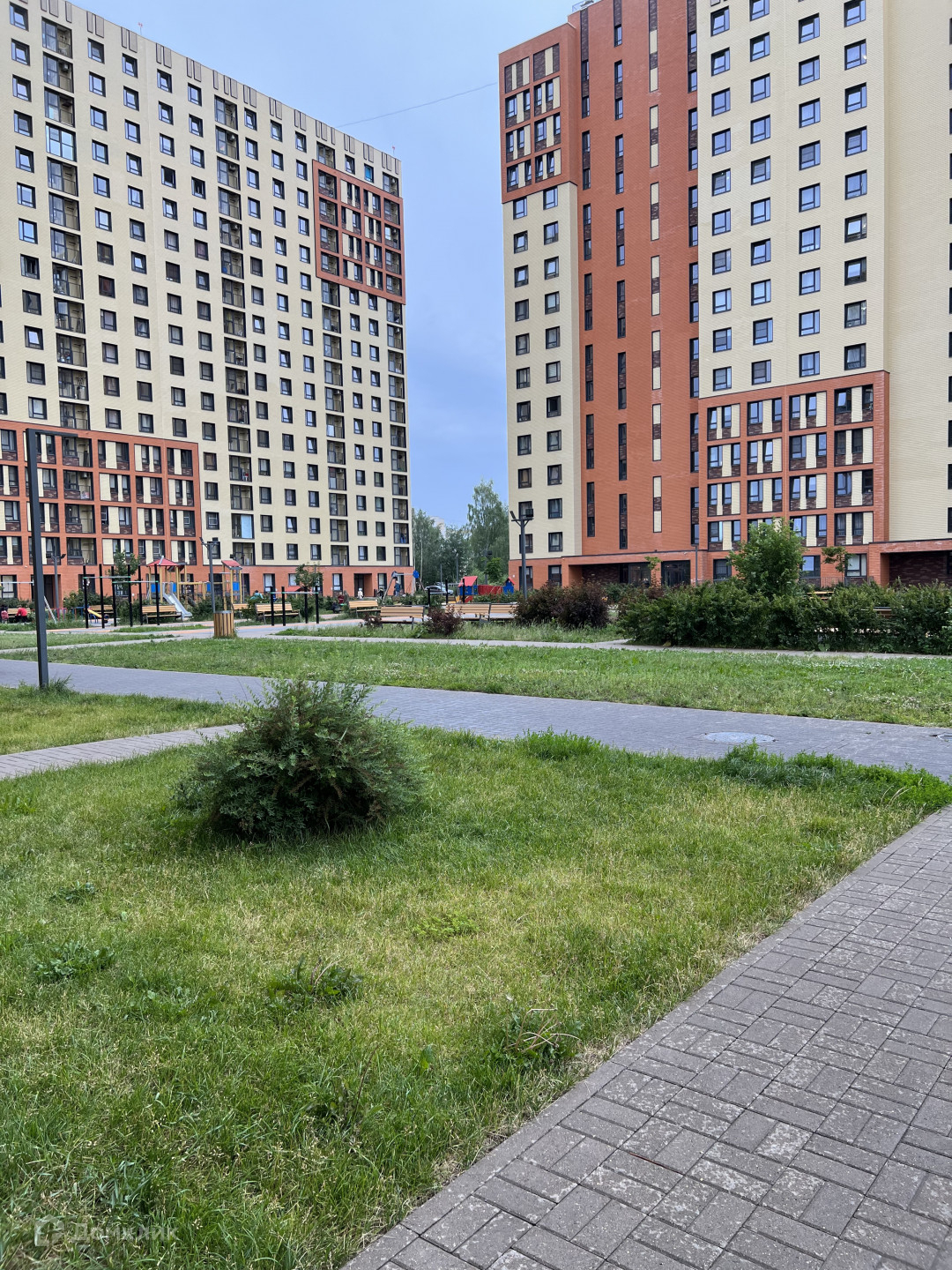 Красивый вид из окна во двор, где обустроена новая детская площадка