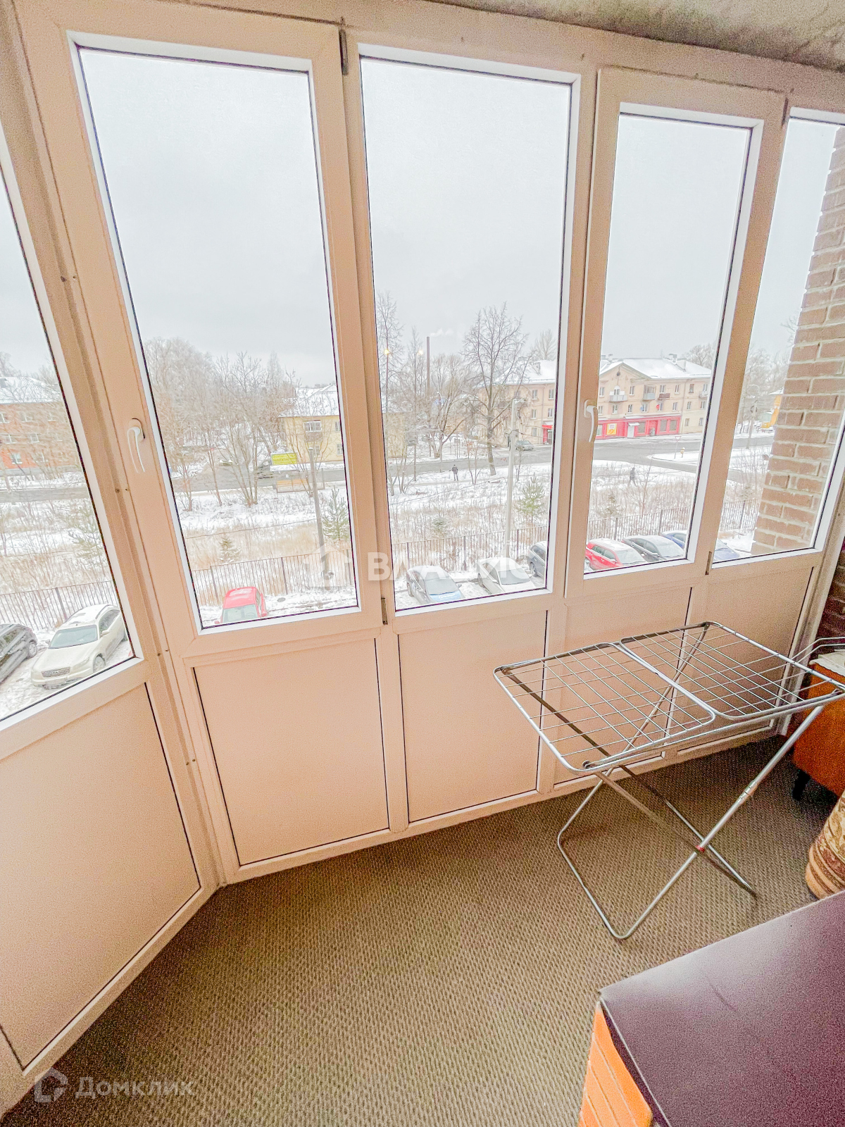 Большая застеклённая лоджия в форме пятиугольника, на ней стоит сушилка для одежды.