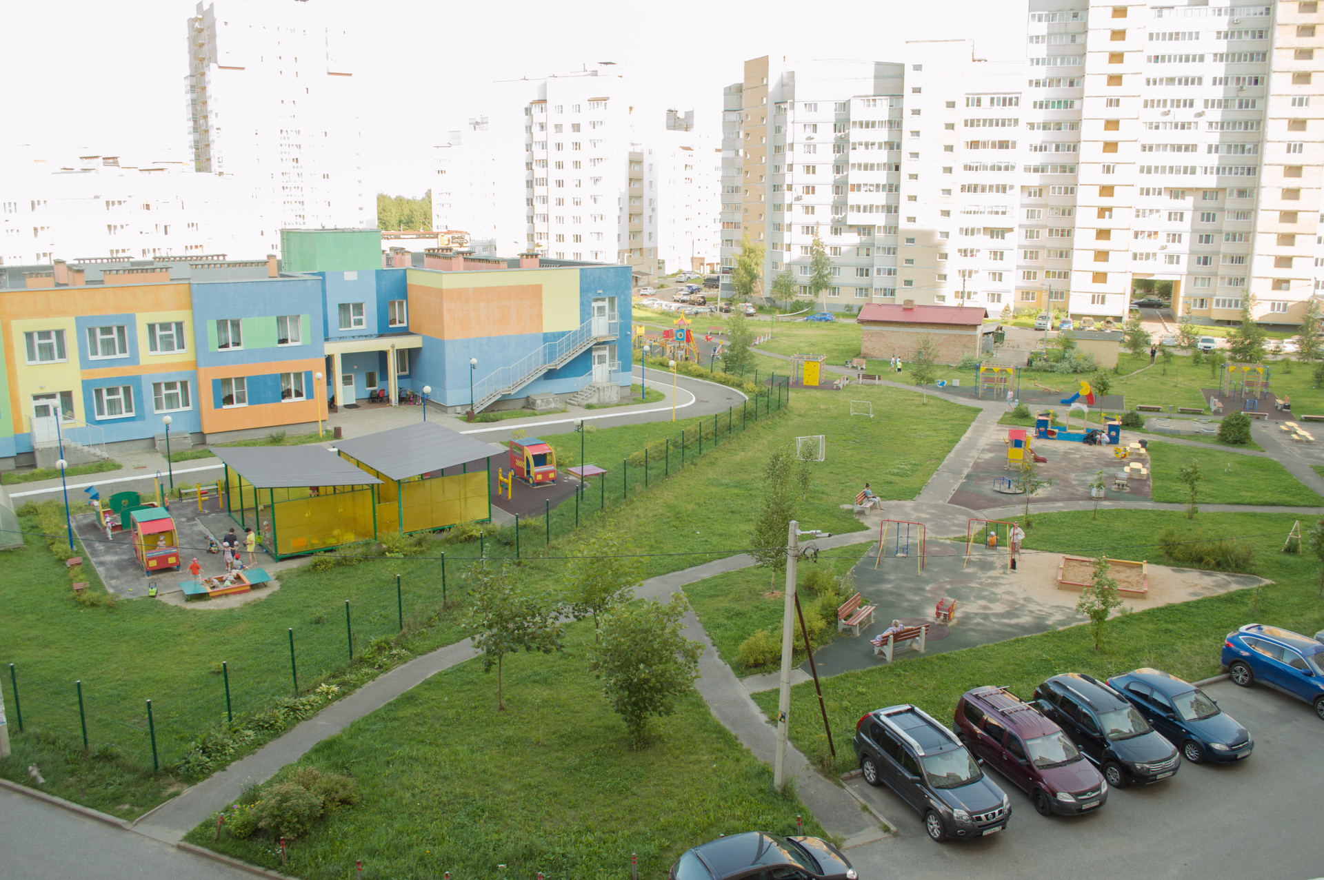 Окна выходят на две стороны: во двор с видом на детскую площадку, детский садик и парковку; и на улицу Черноплодную, в другую сторону от проспекта Фрунзе.