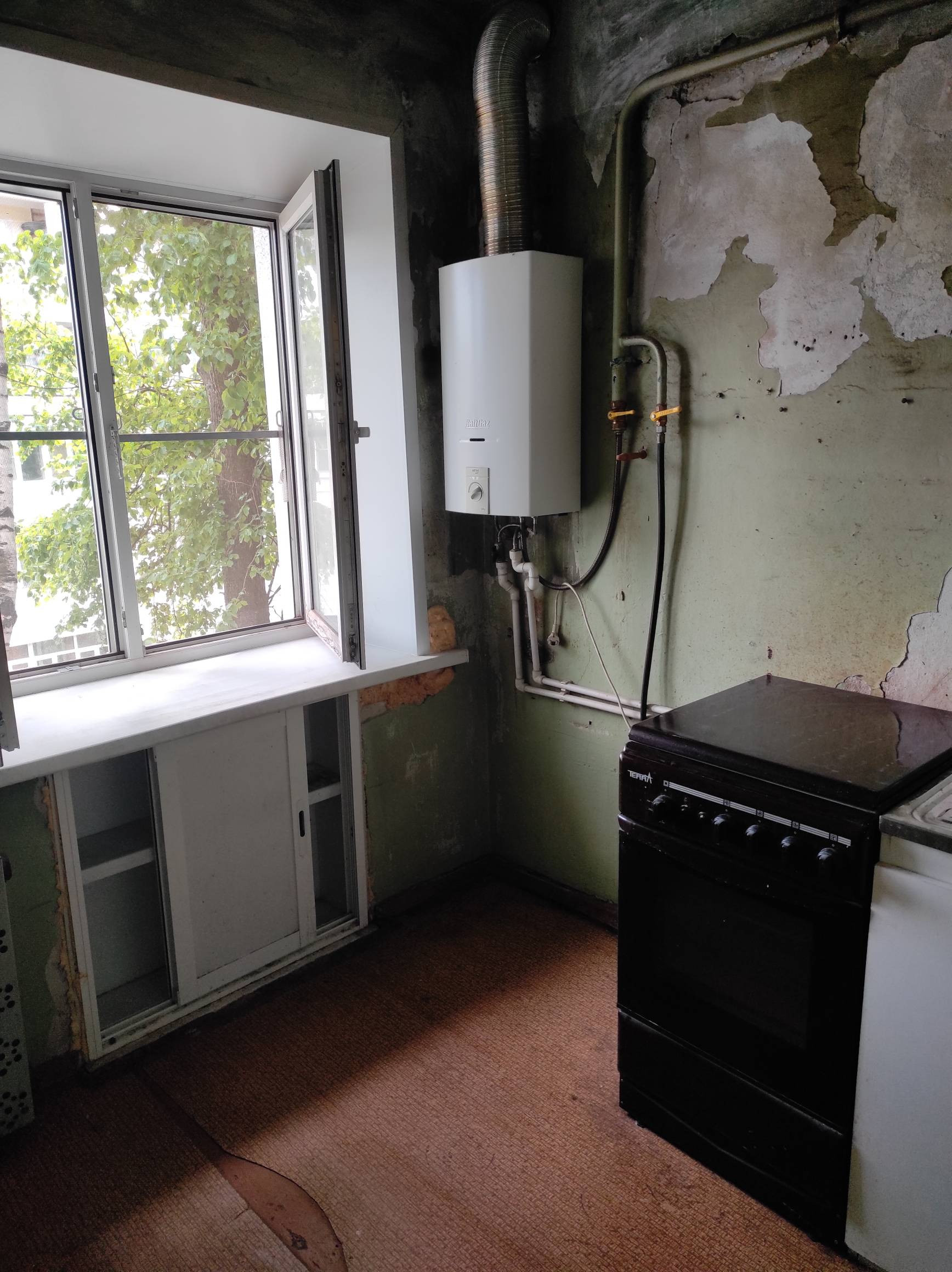 Санузел совмещен, балкон, окна ПВХ, газовая колонка. Квартира требует ремонта. Огороженная территория.