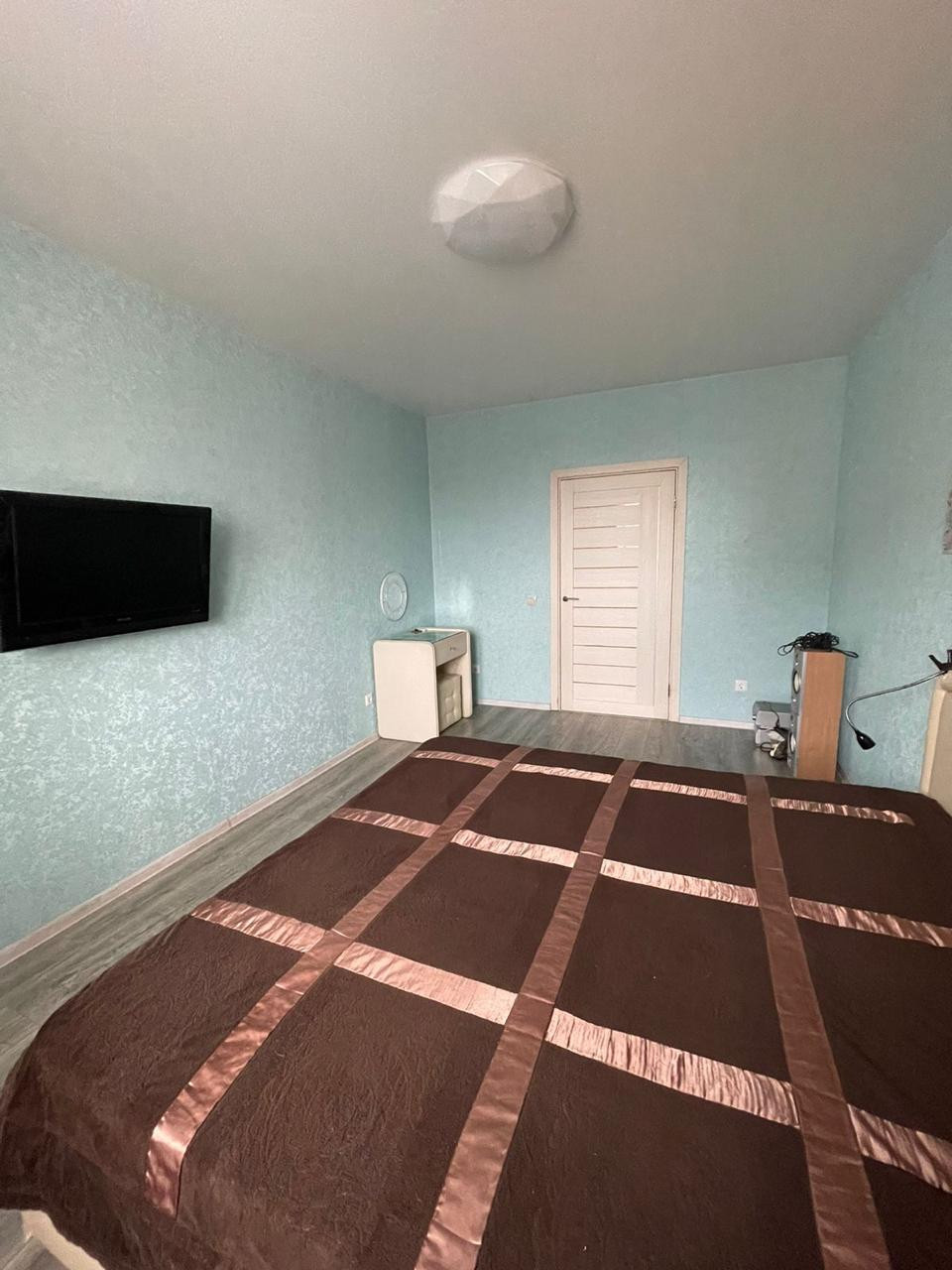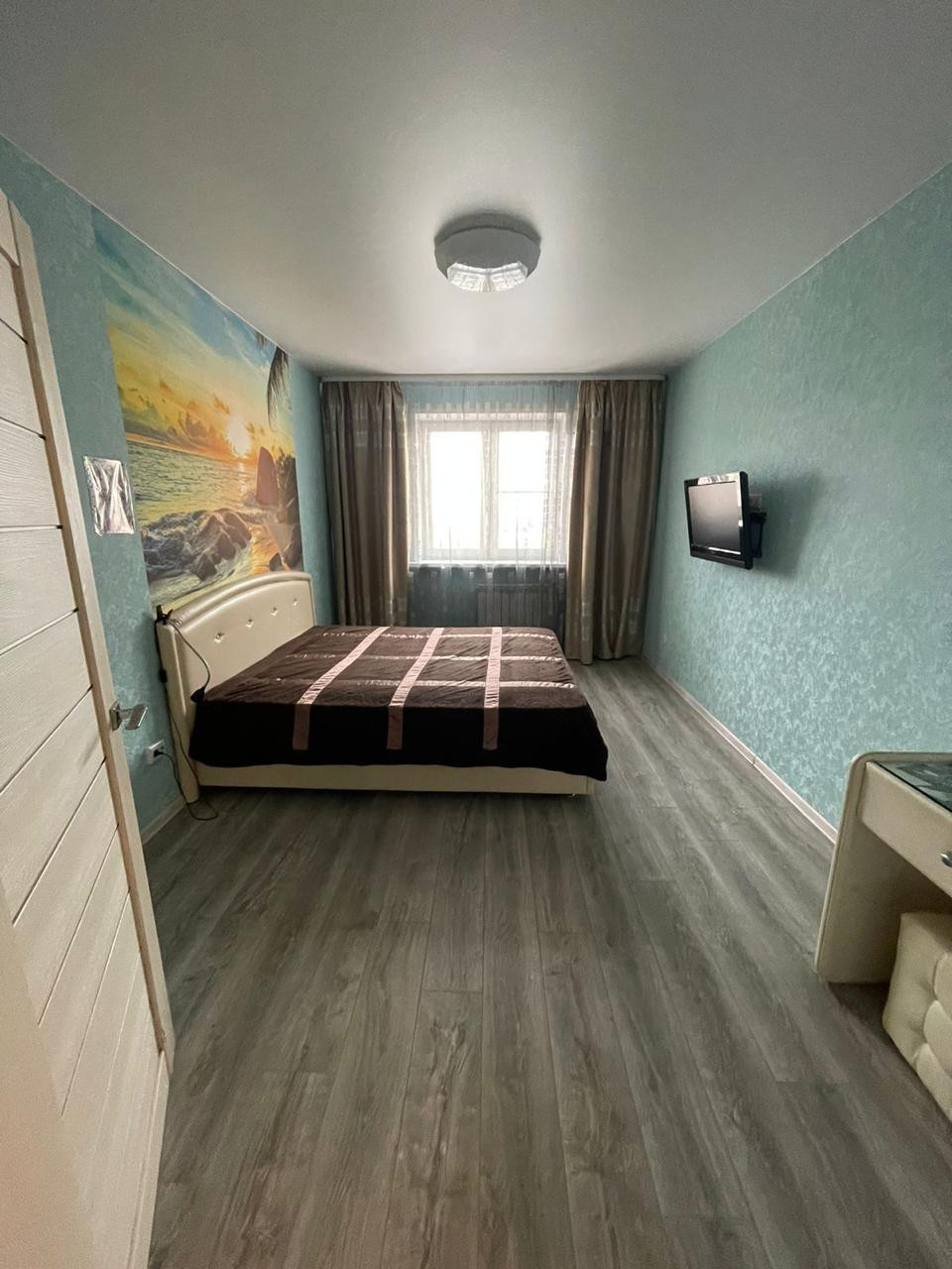 Остается 2-х спальная кровать(1.8 на 2 м) с матрасом в комплекте. ТВ на стене. На полу ламинат. Карниз и шторы.