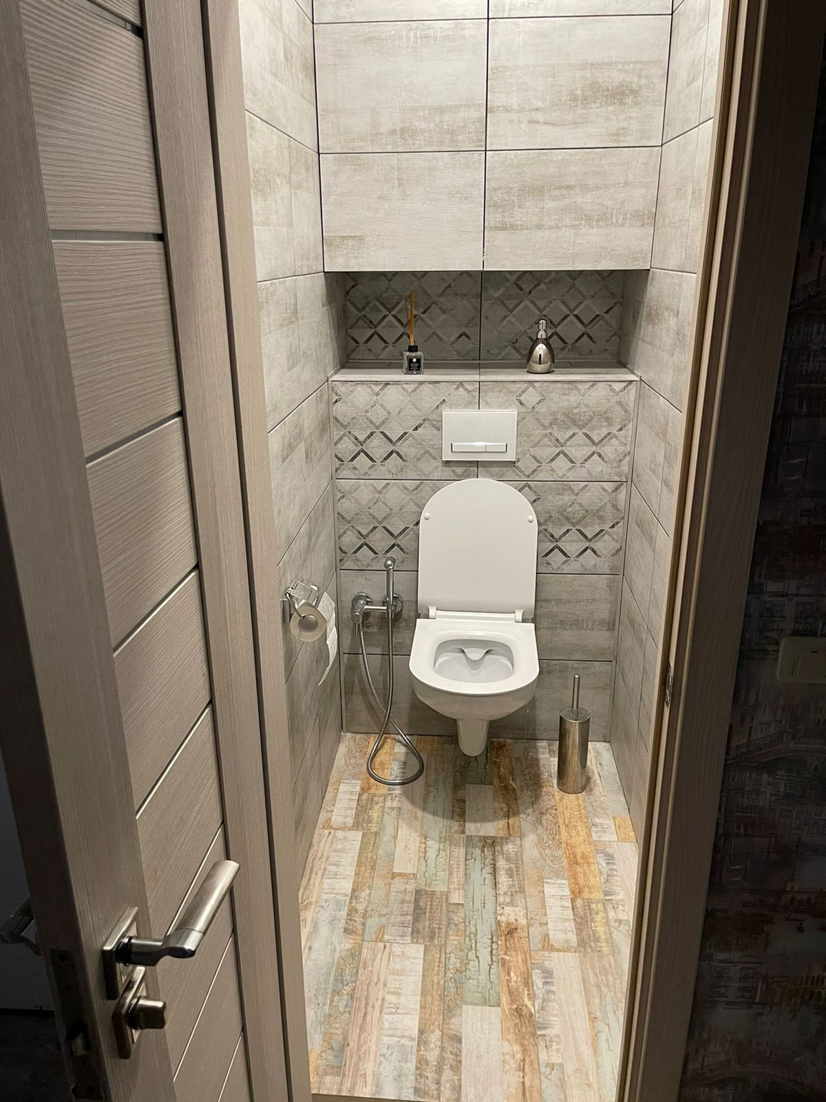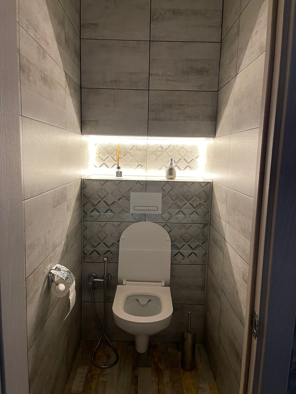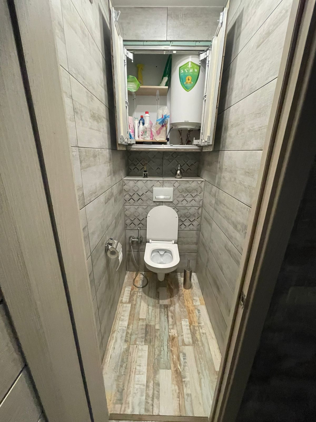 Все в керамограните. Установлен Эл.теплый пол. Установлен закрывающийся шкаф для хранения хоз. материалов. Так же в данный шкаф вмонтирован дополнительный электрический котел на 100 л.