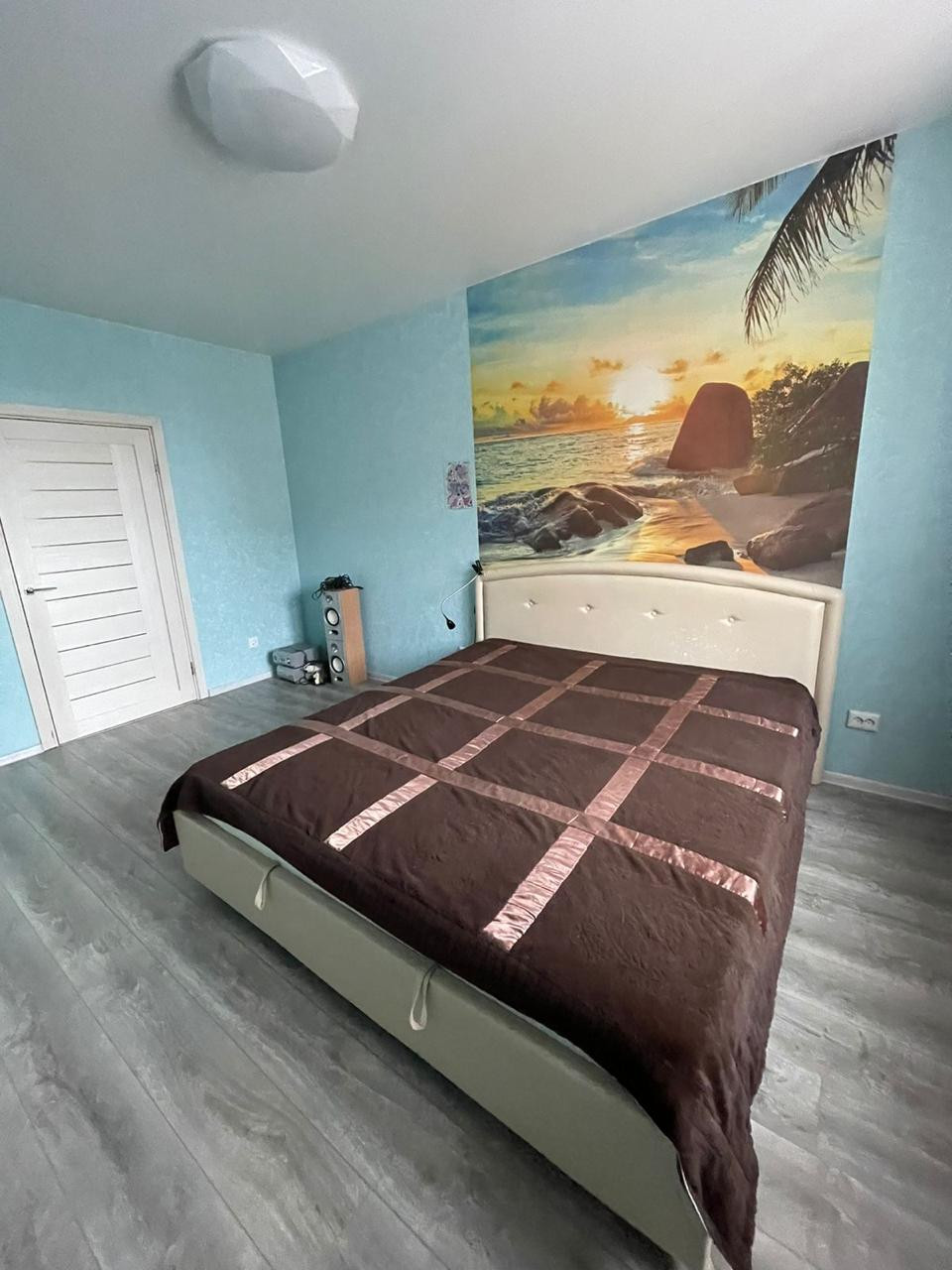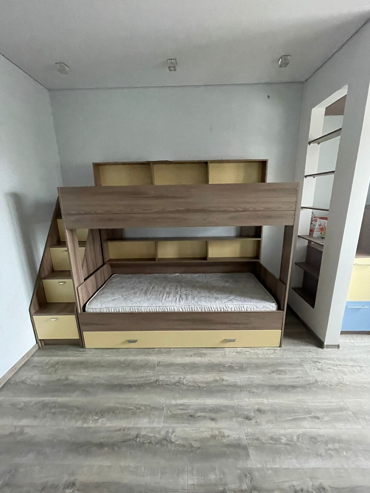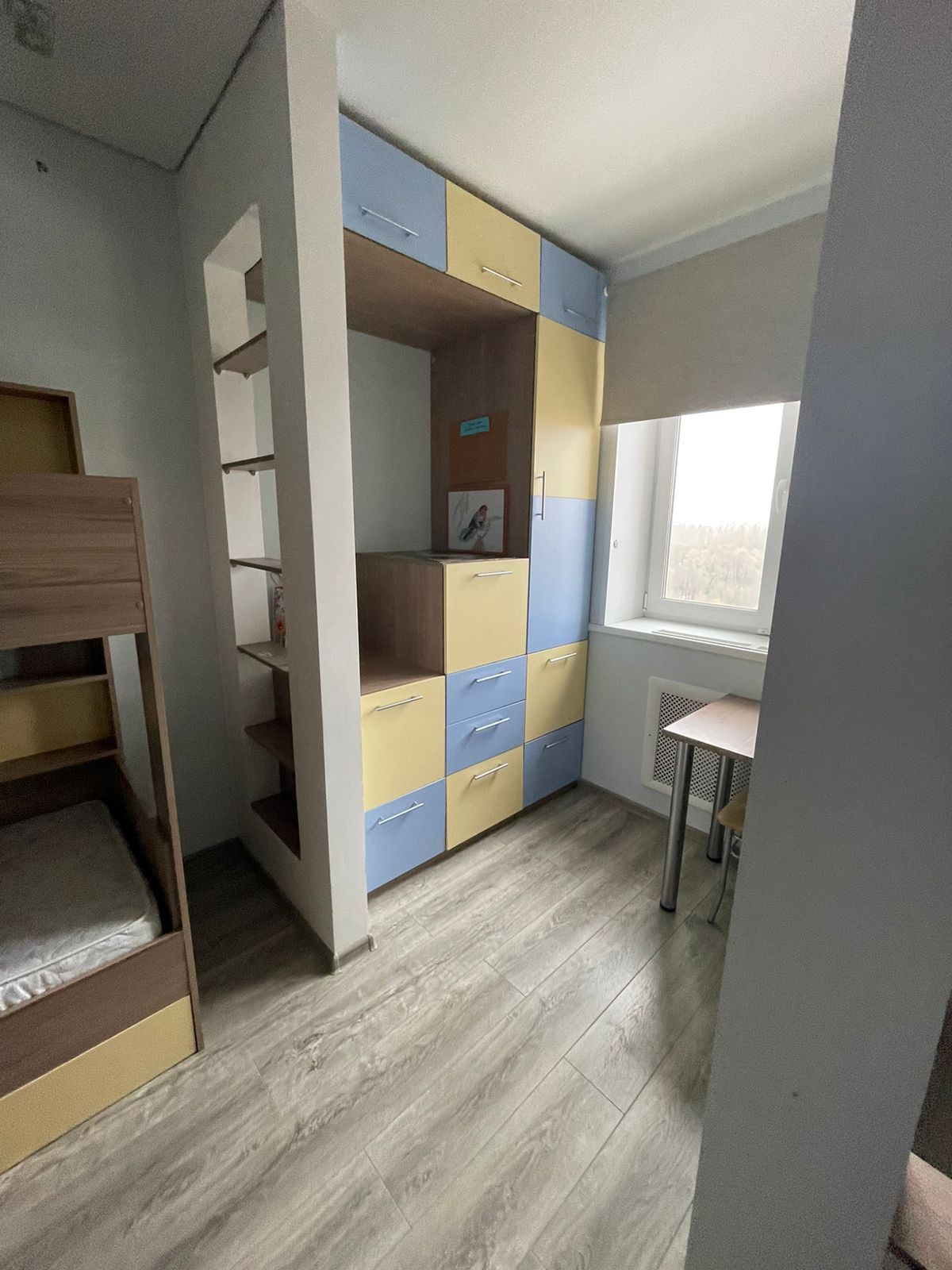Остается 2-х этажная 2-х спальная кровать(с матрасами в комплекте). Установлена дополнительная шумоизоляция от соседей. Шторка. На полу ламинат.