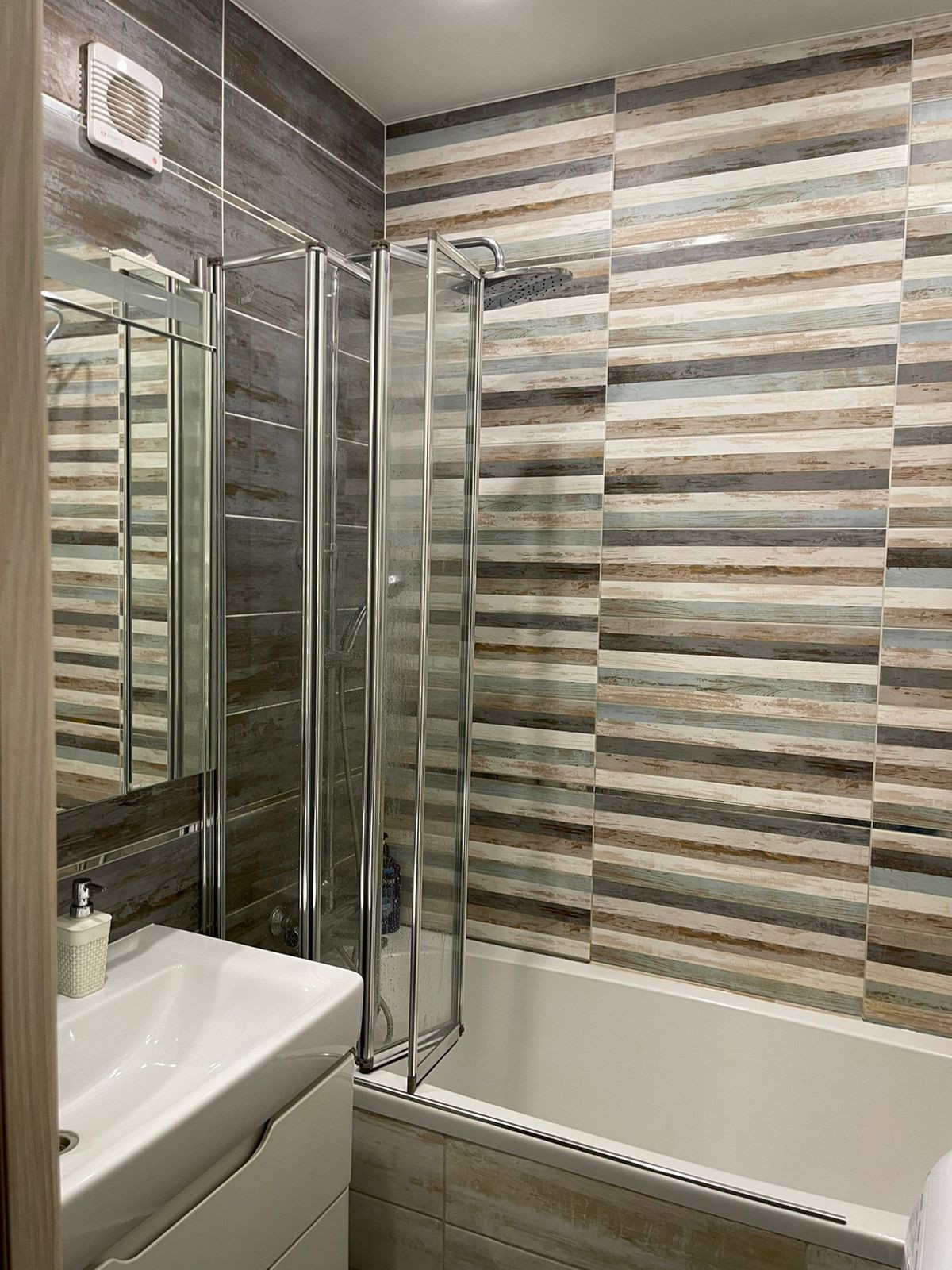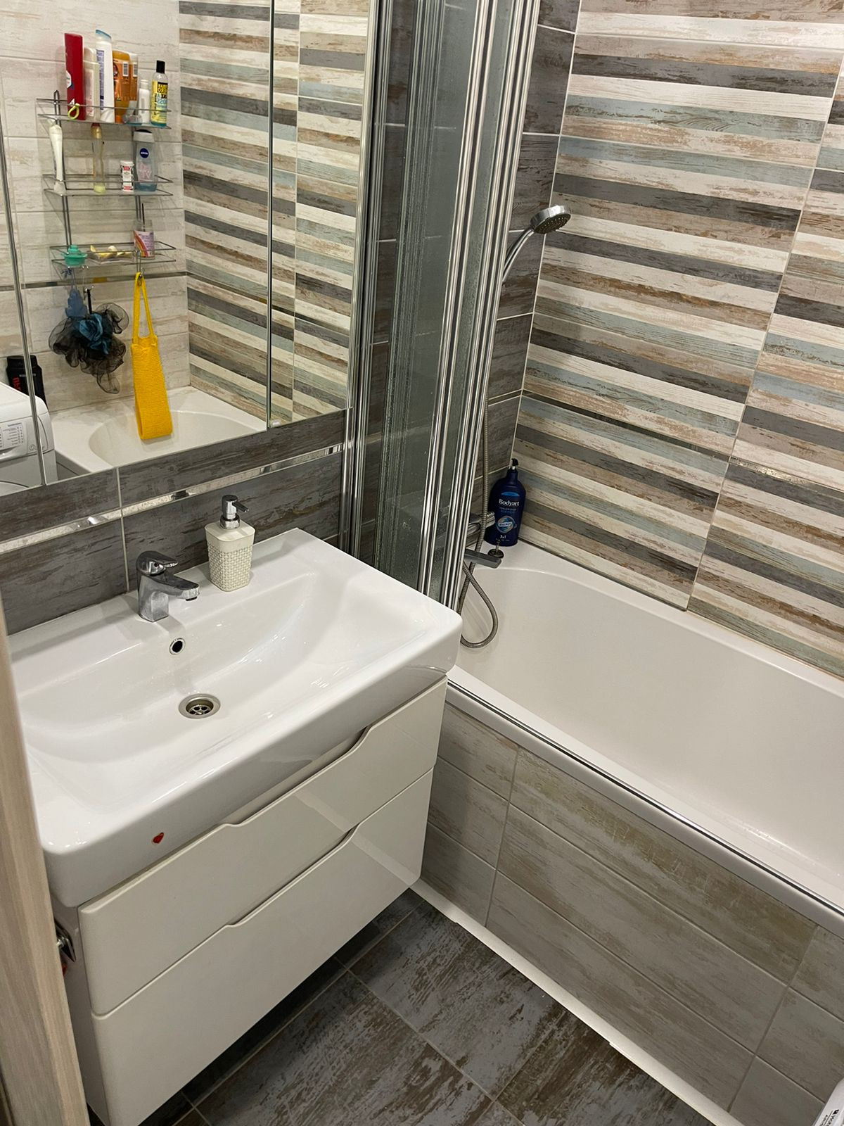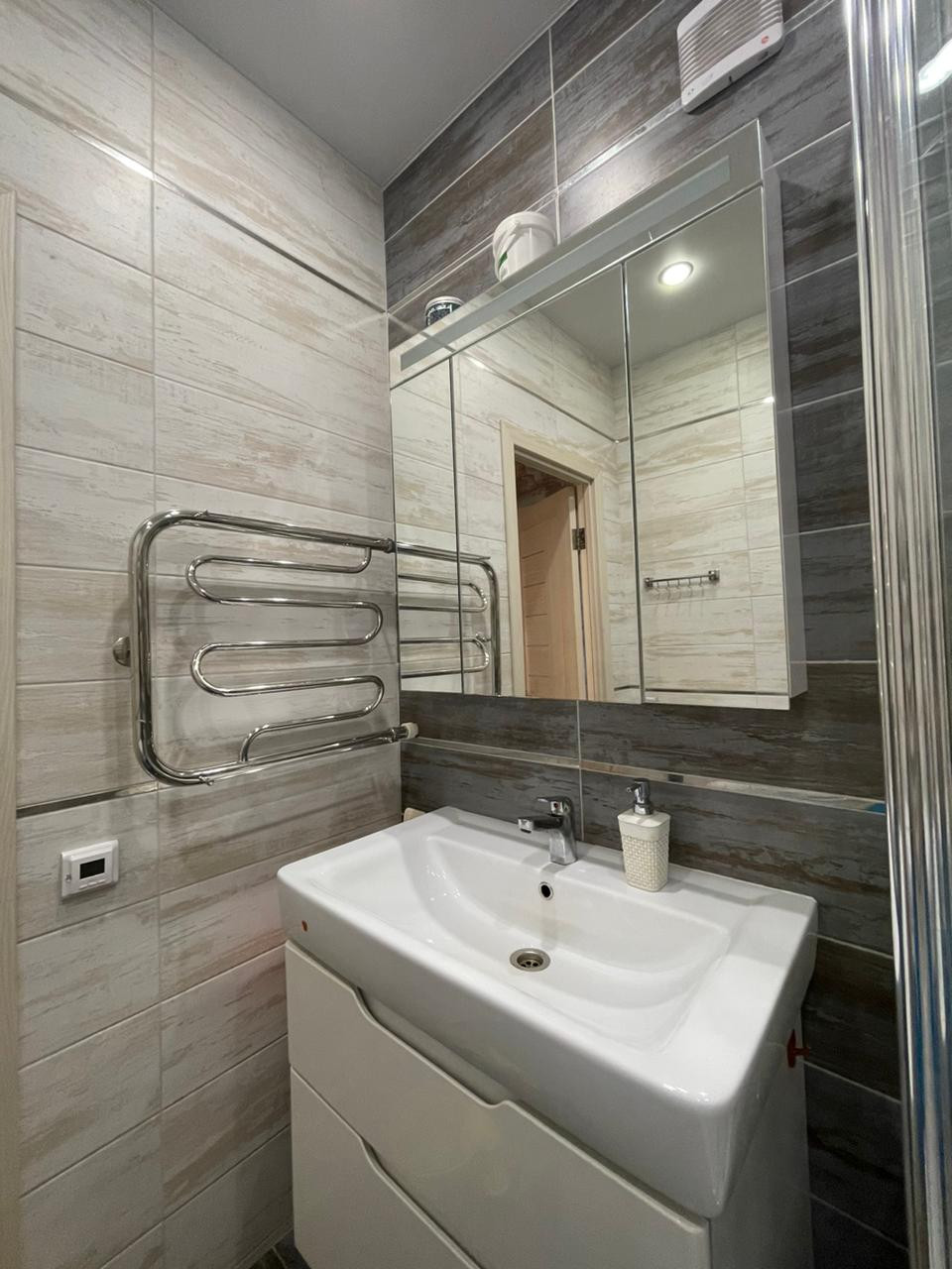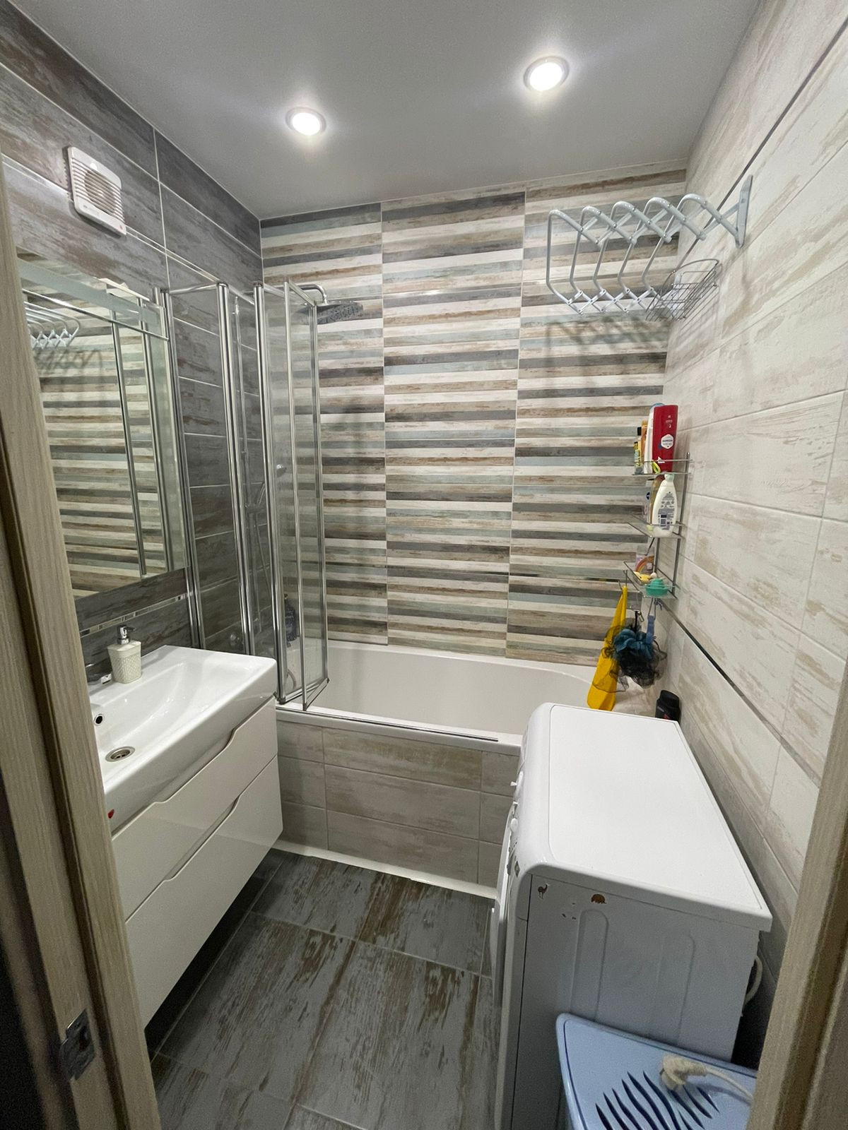 Все в керамограните. Установлен Эл.теплый пол. Установлена новая акриловая ванна. Шкафы для хранения банных и прочих принадлежностей. Установлена стиральная машинка(остается).