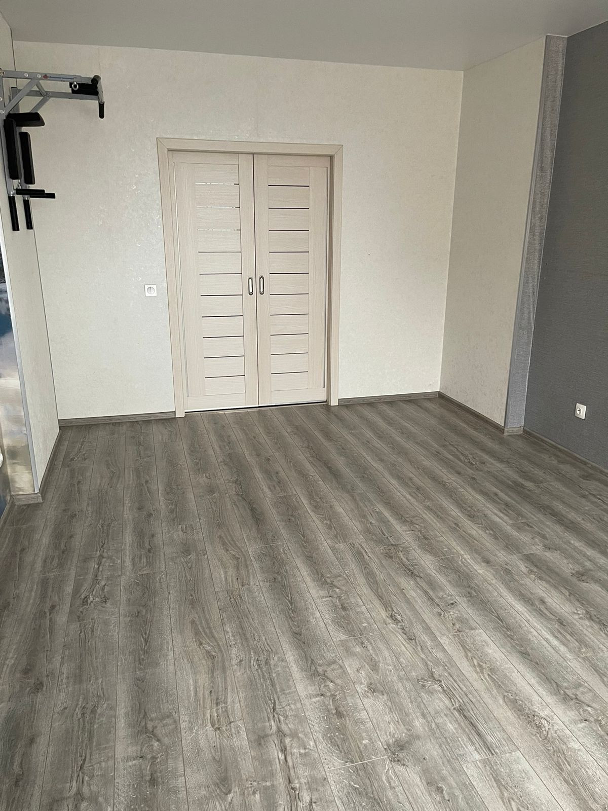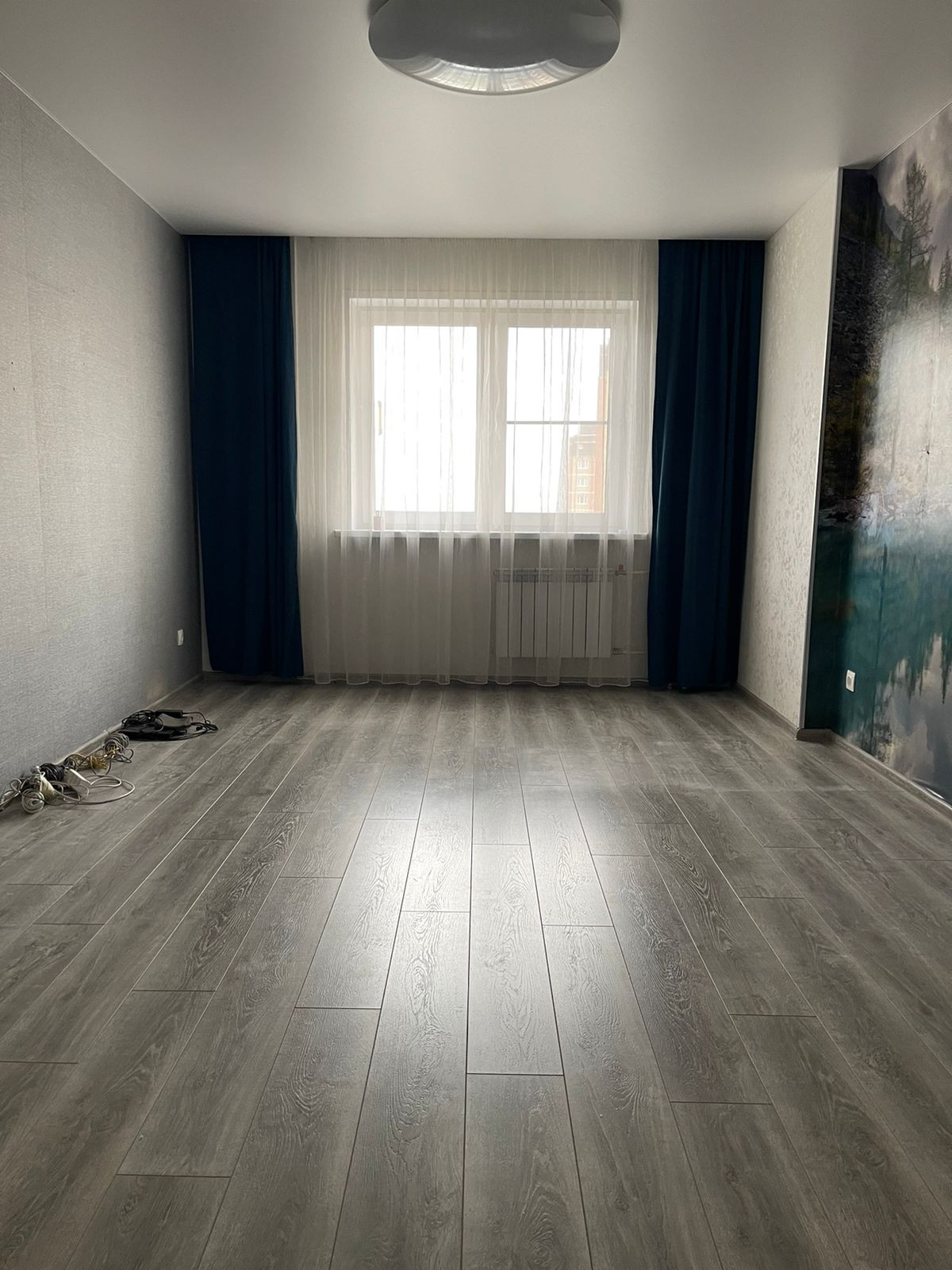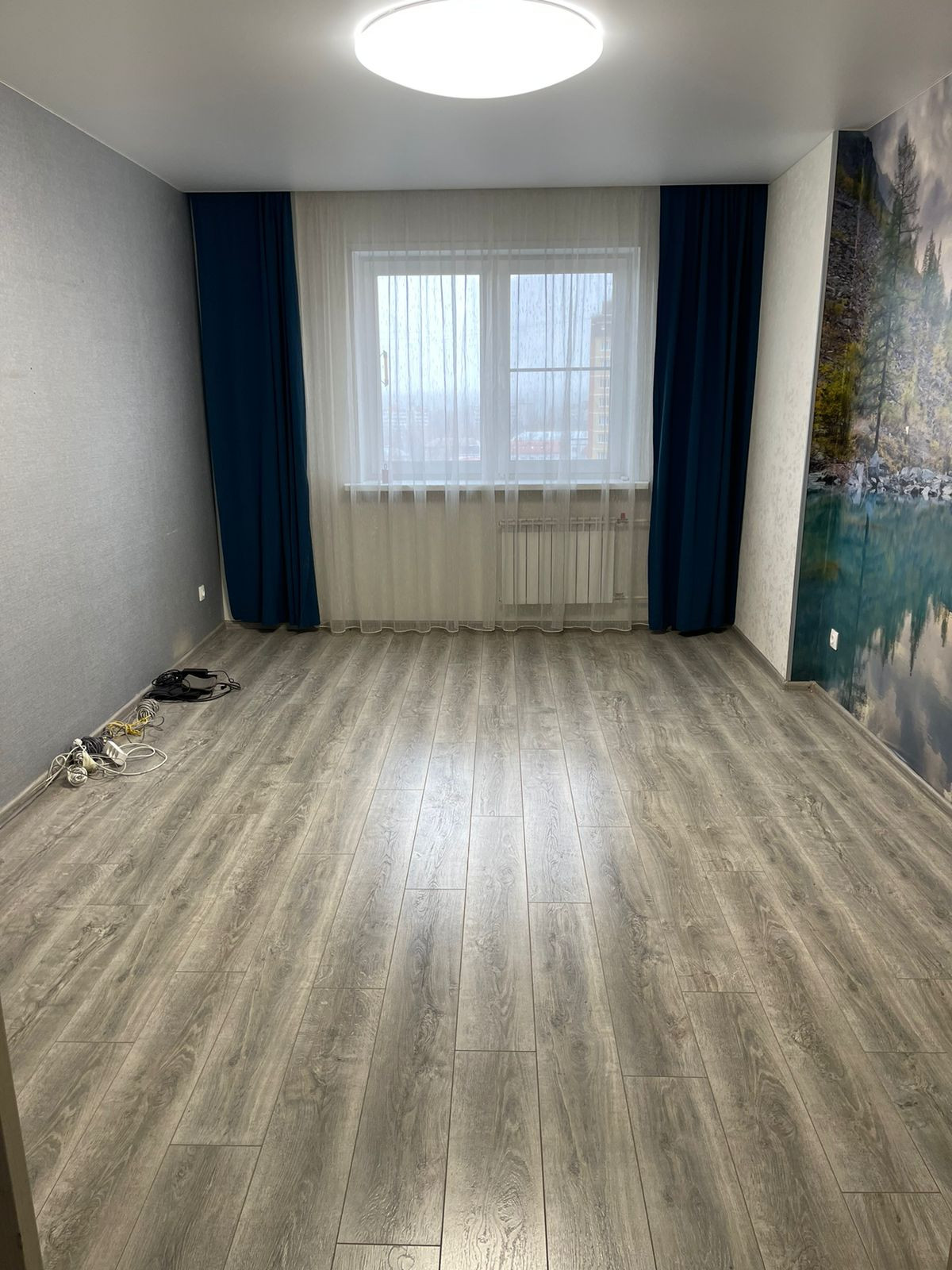 На полу ламинат. Карниз и шторы. Освобождена от мебели.