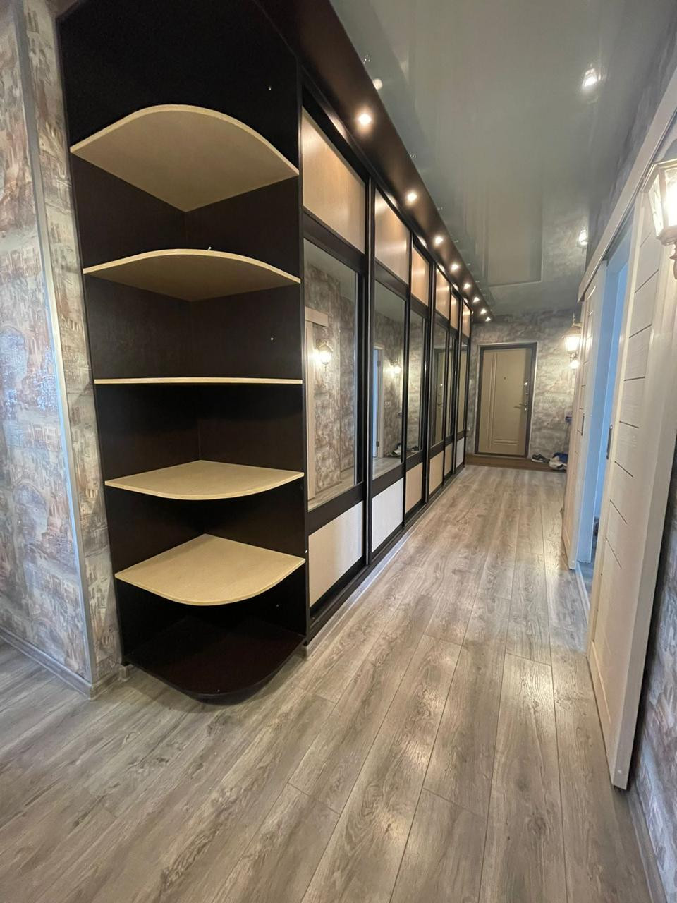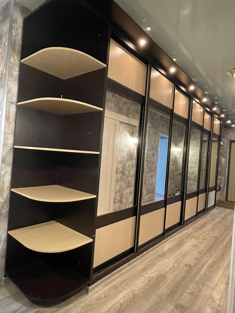 Установлен на заказ огромный шкаф купе, в который можно уместить абсолютно все вещи. За счет чего экономится очень много места в целом в квартире.