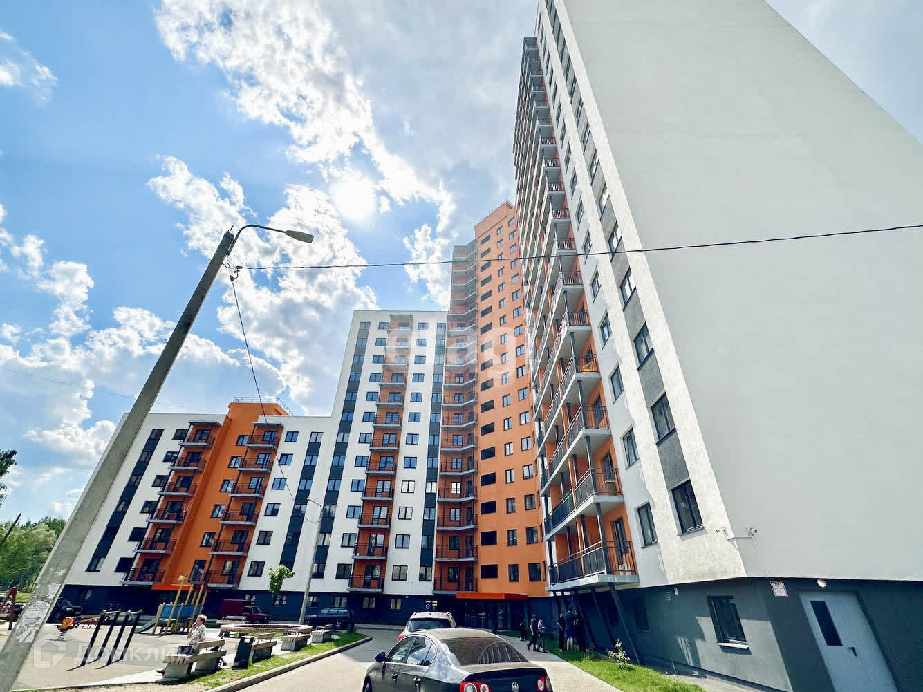 Новый современный дом 2022 года постройки, благоустроенная придомовая территория с детской игровой площадкой и местами для парковки автомобилей.