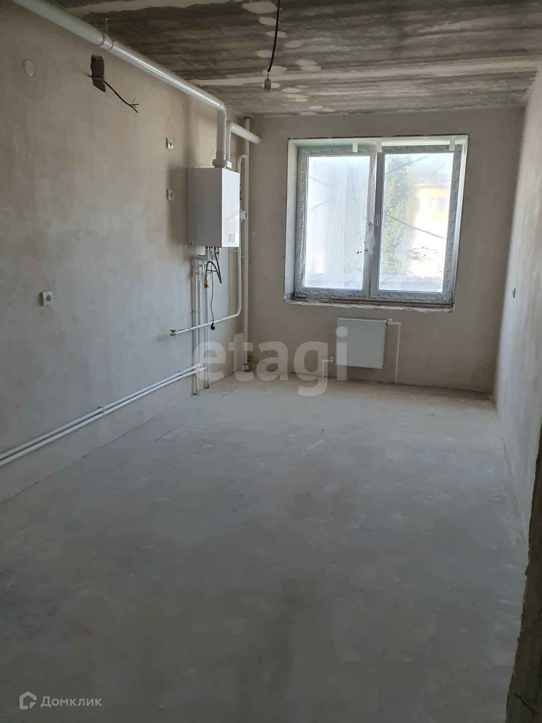 Квартира сдается с предчистовой отделкой: на полу цементная стяжка, стены оштукатурены, сделана разводка электричества, установлена входная дверь, двухконтурный газовый котел.