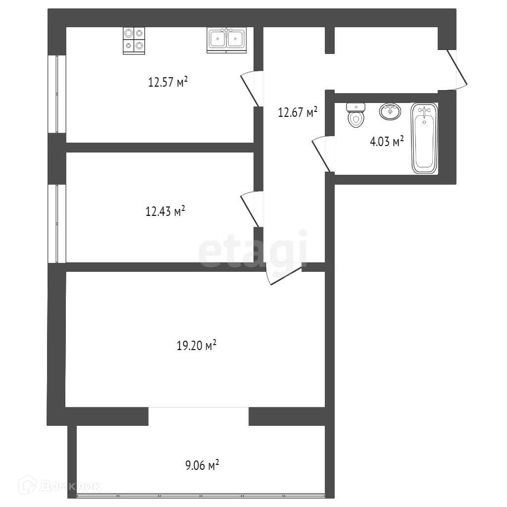 Общая площадь 60.7 м² Просторная кухня 13.0 м²