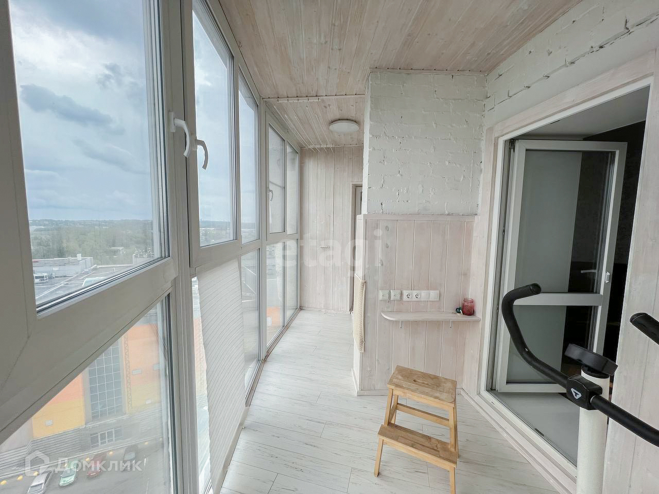 Весь балкон остеклён панорамным остеклением, которое помогает держать комфортную температуру в холодное время года.