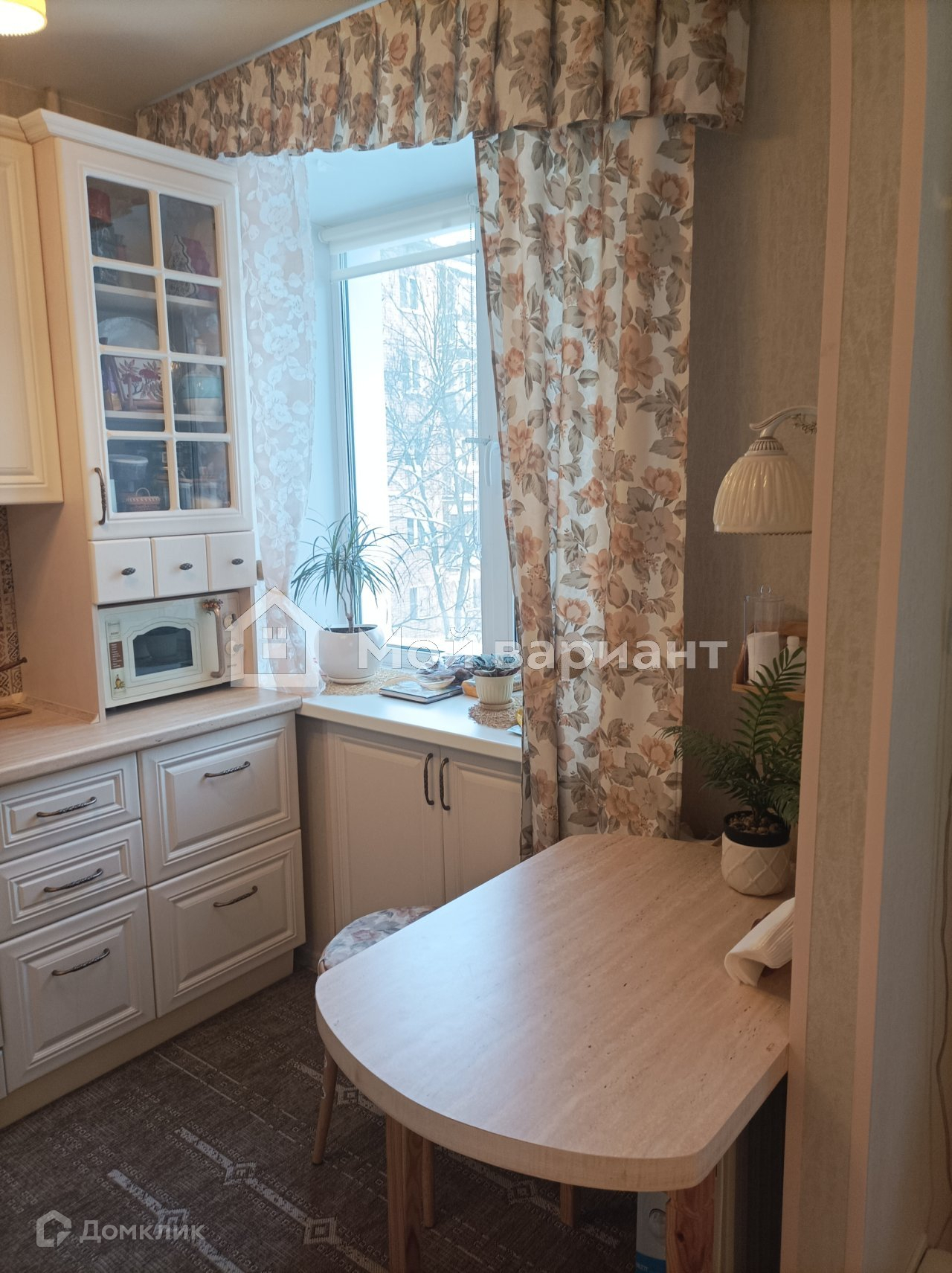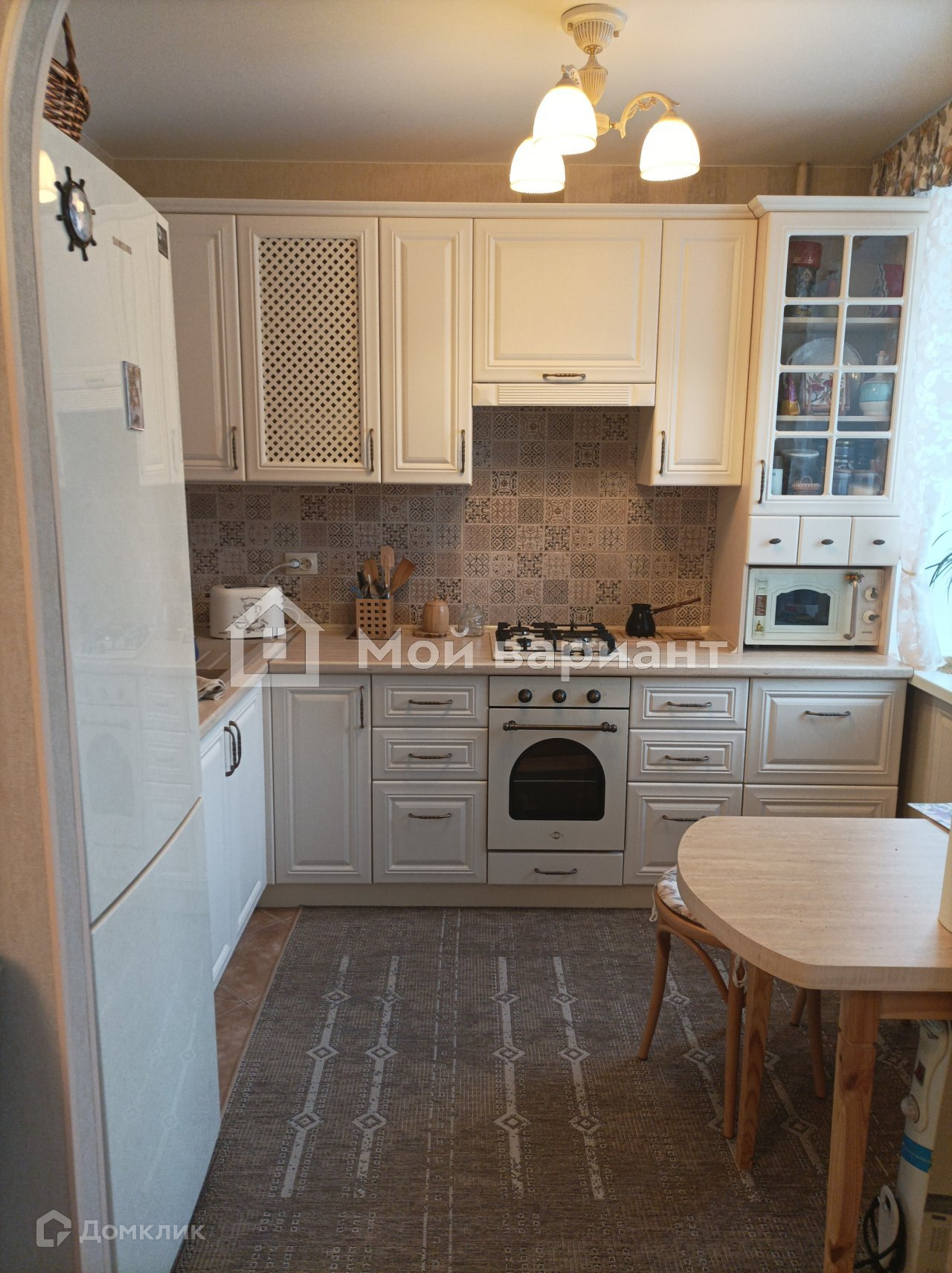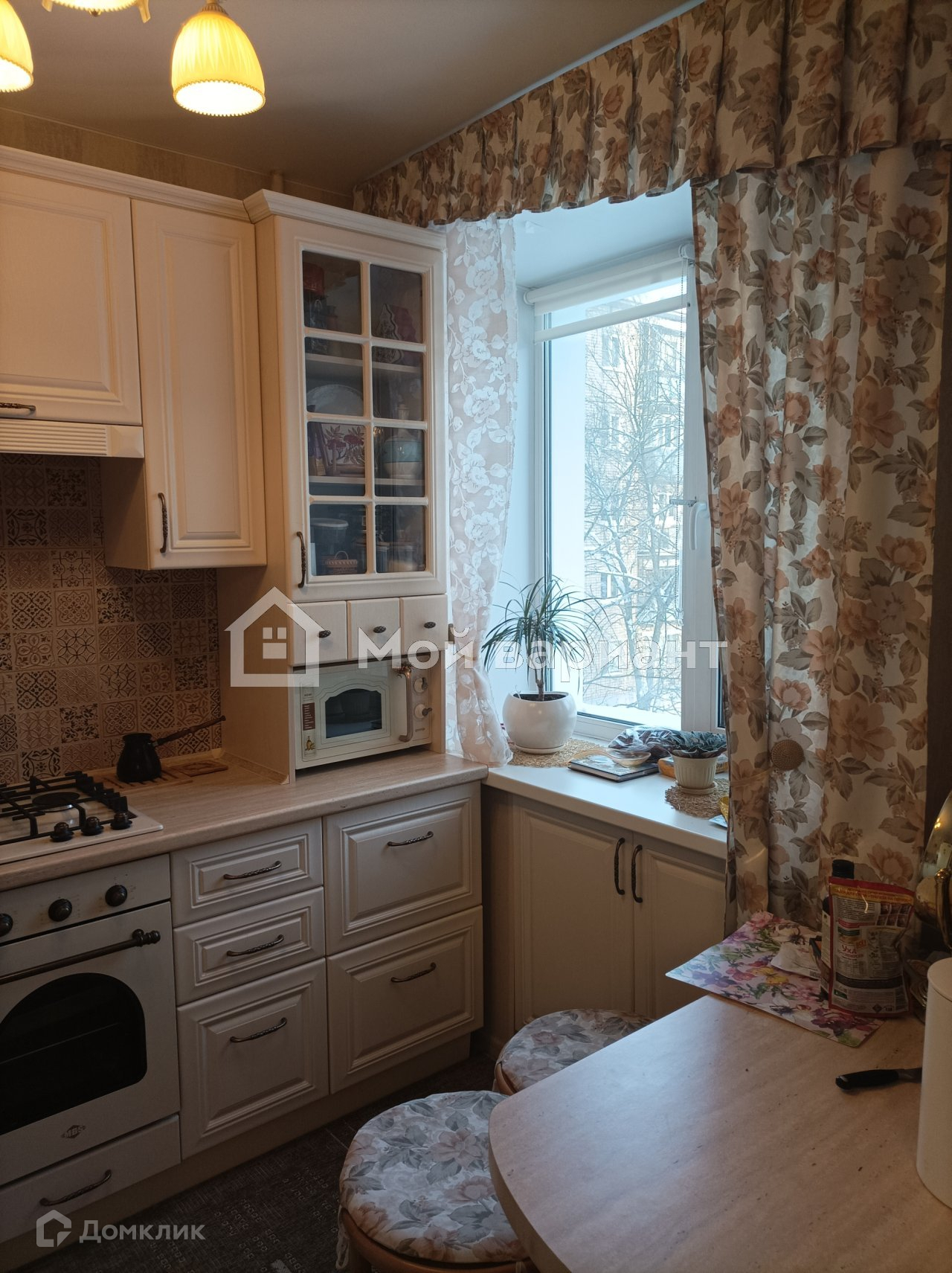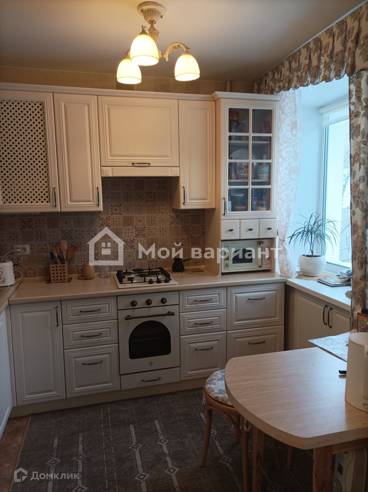 На кухне кафельный фартук, на полу тоже кафель. Мебель и техника не входят в стоимость квартиры.