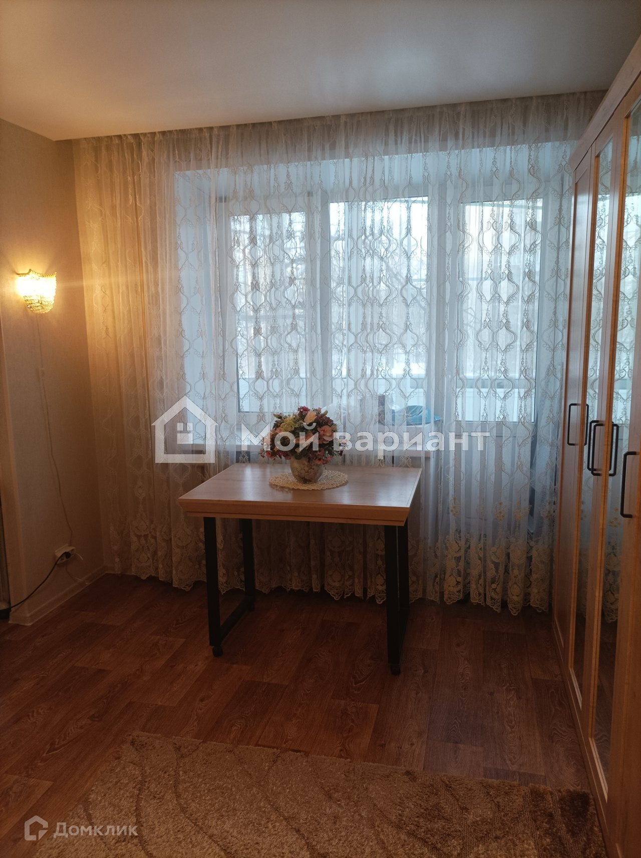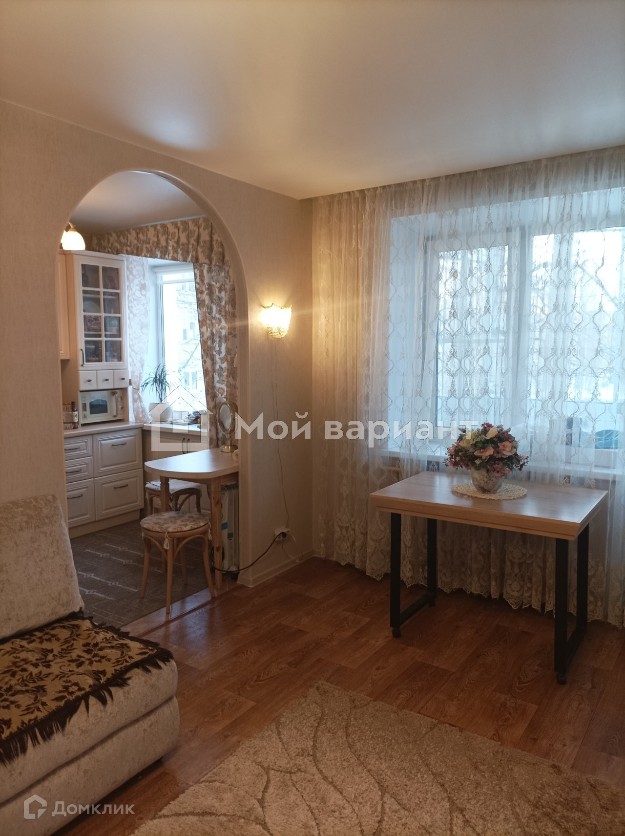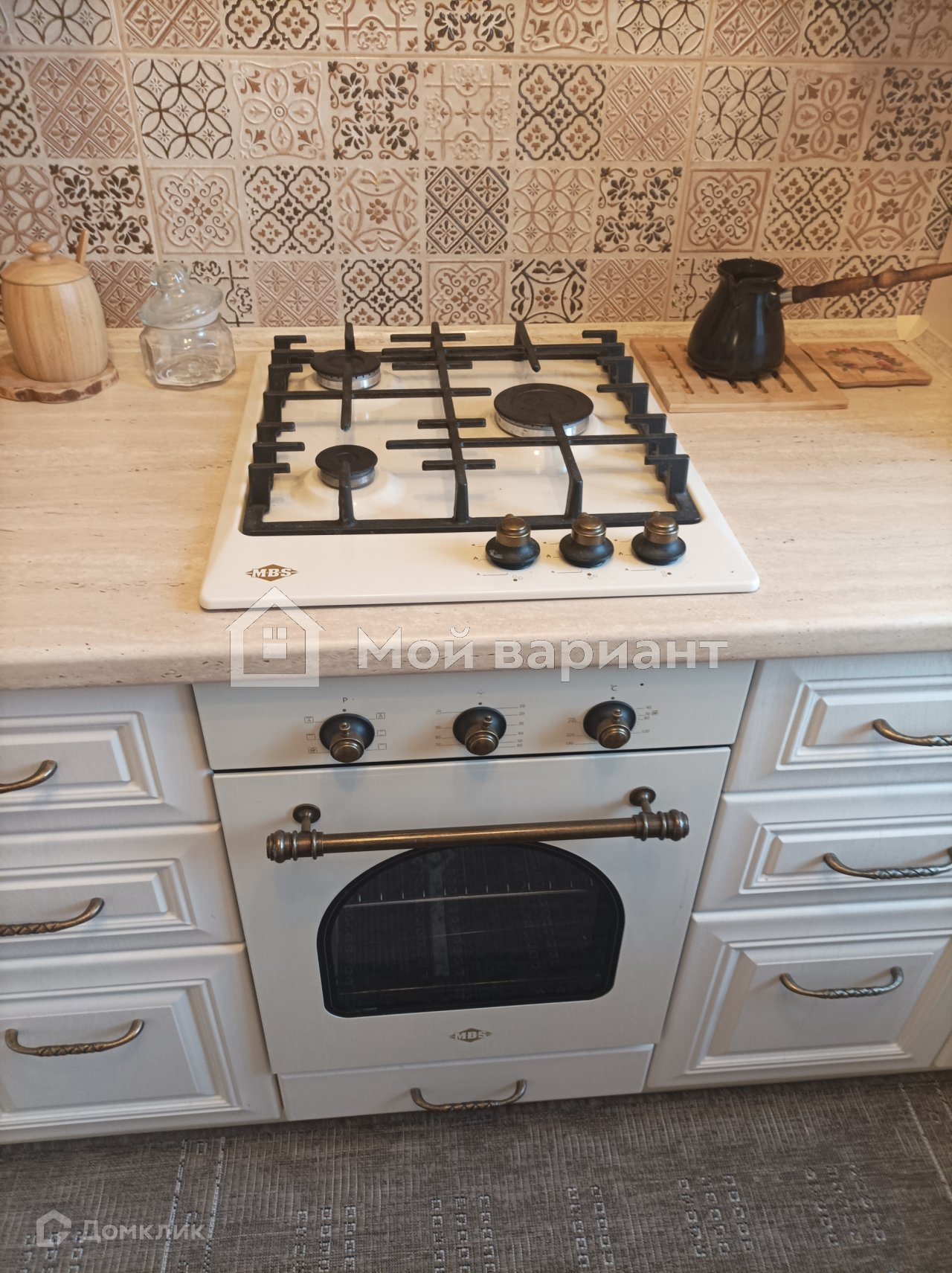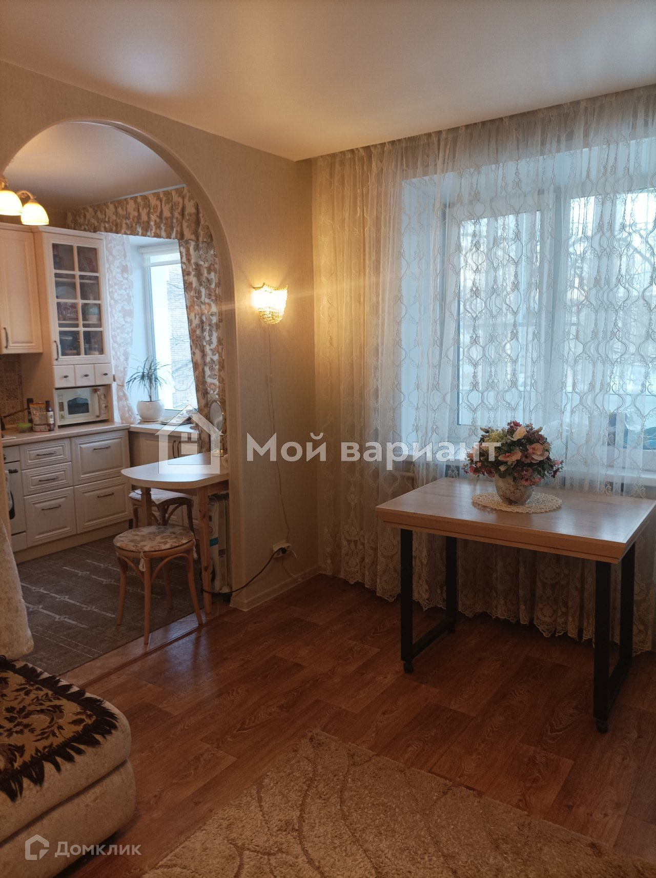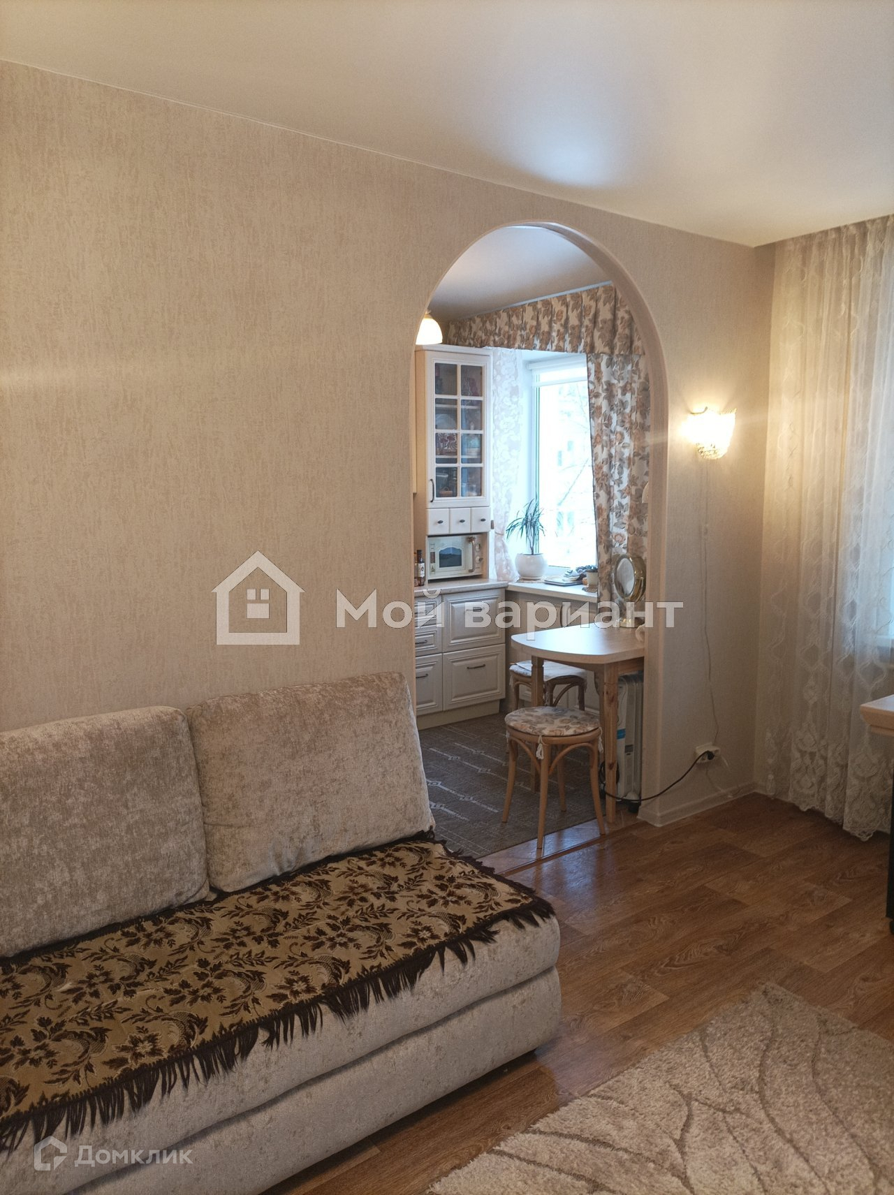 На кухне кафельный фартук, на полу тоже кафель. Мебель и техника не входят в стоимость квартиры.