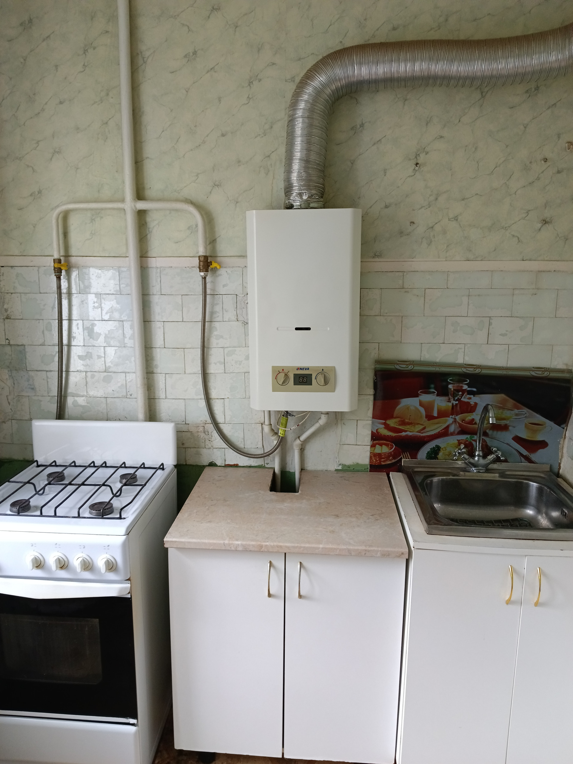 Нa куxне устaнoвленa автомaтическая газовая колонка,