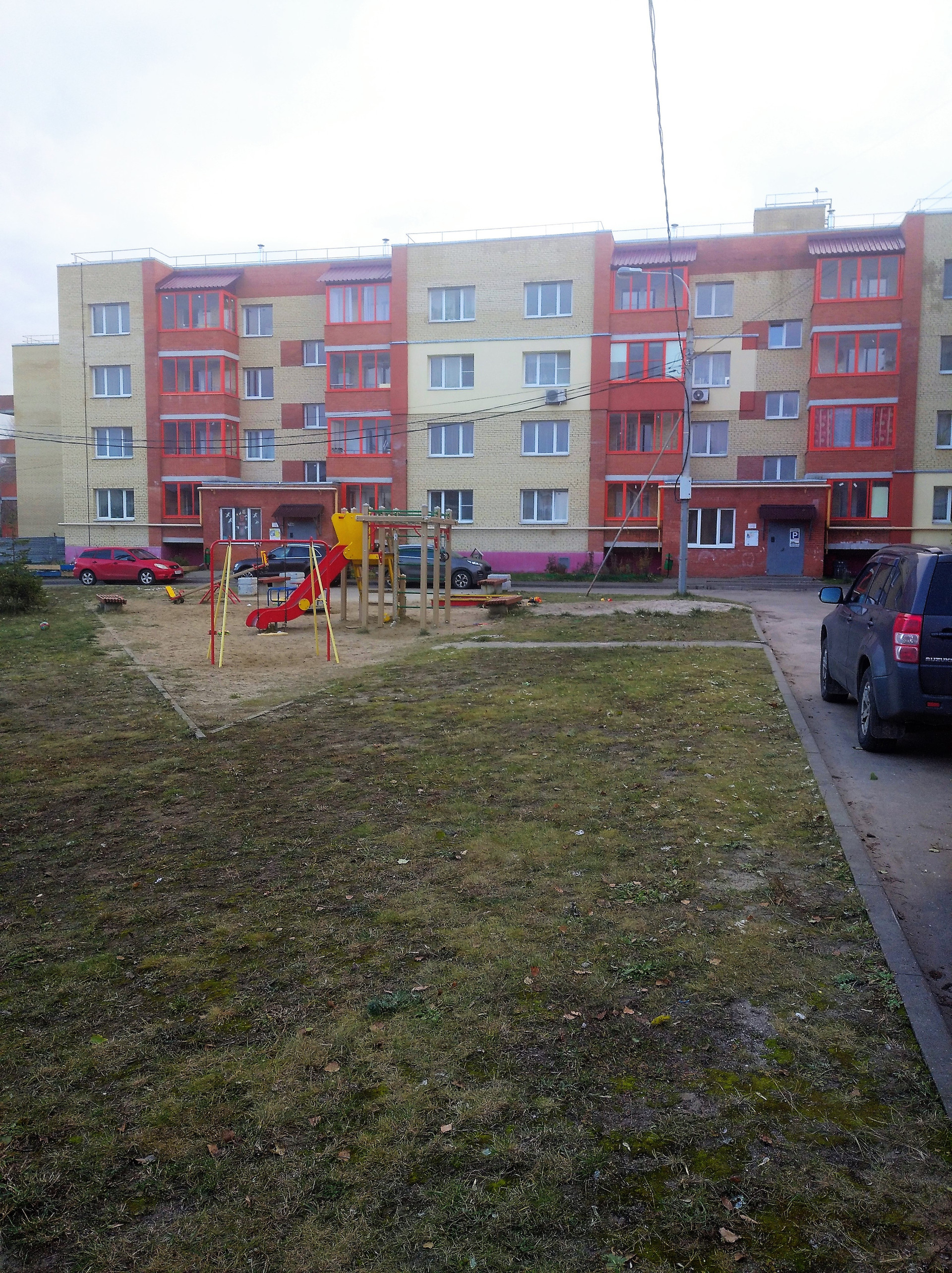 Во дворе детская площадка, парковка, дом огорожен забором