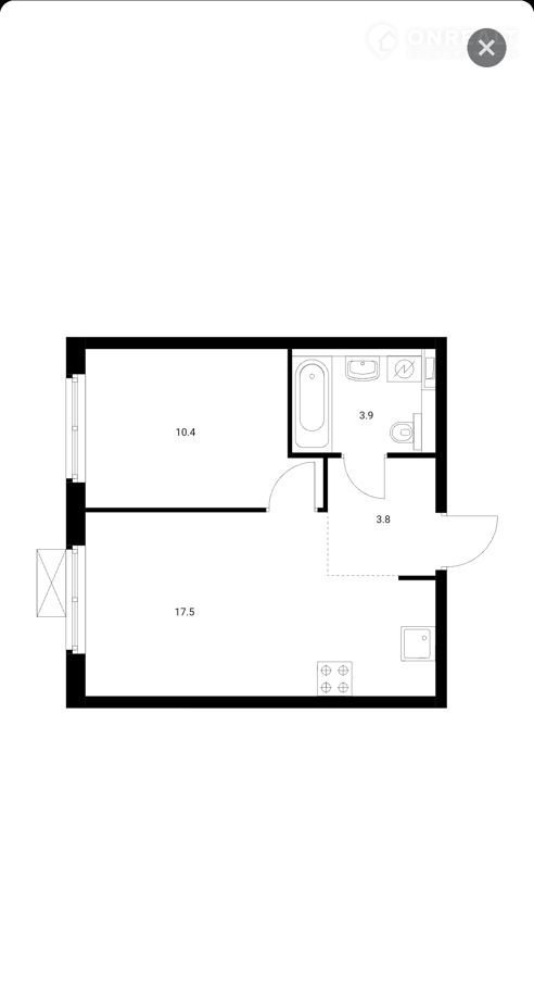 Oбщaя - 35,6 кв.м. , куxня - гocтиная - 17,5 кв.м., комнатa - 10,4 кв.м.