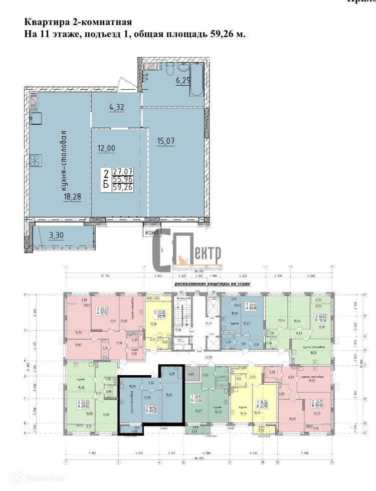 - кухня-столовая 18.28 кв.м., комнаты 12 + 15.07 кв.м., с/у 6.29 кв.м., прихожая 4.32 кв.м., балкон 3.30 кв.м.