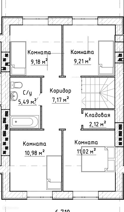 • ЧЕТЫРЕ изолированные жилые комнаты на втором этаже, площадь которых составляет 9,18; 9,21; 10,98; 11,02 кв.м.,  гардеробная и санузел.