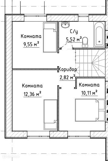 • ТРИ изолированные жилые комнаты на втором этаже, площадь которых составляет 9.55;12.36;10.11 кв.м. и санузел.