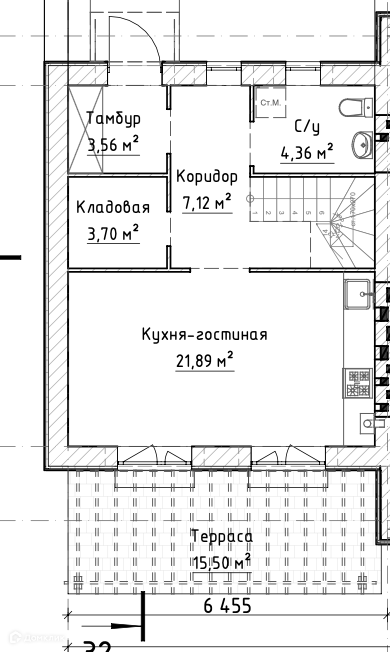 • Просторная кухня-гостиная на первом этаже, площадь которой составляет 21,89 кв.м., гардеробная, тамбур и санузел.