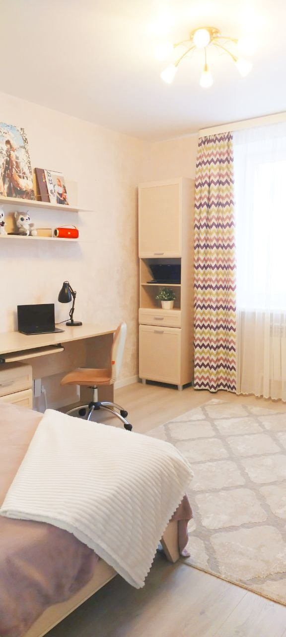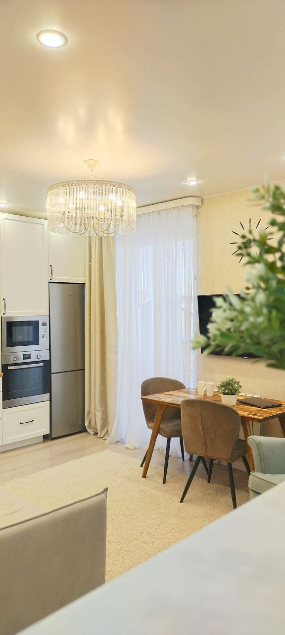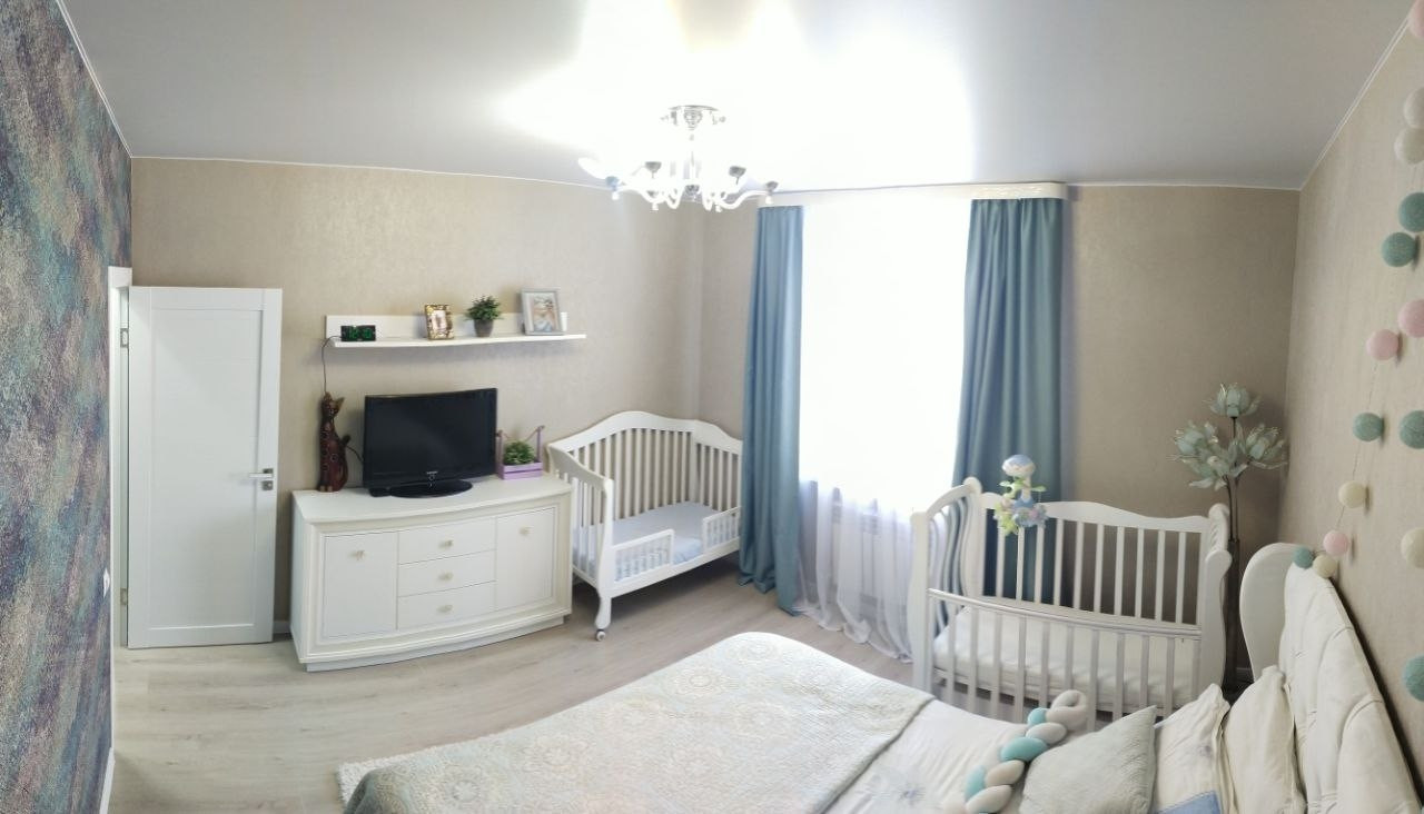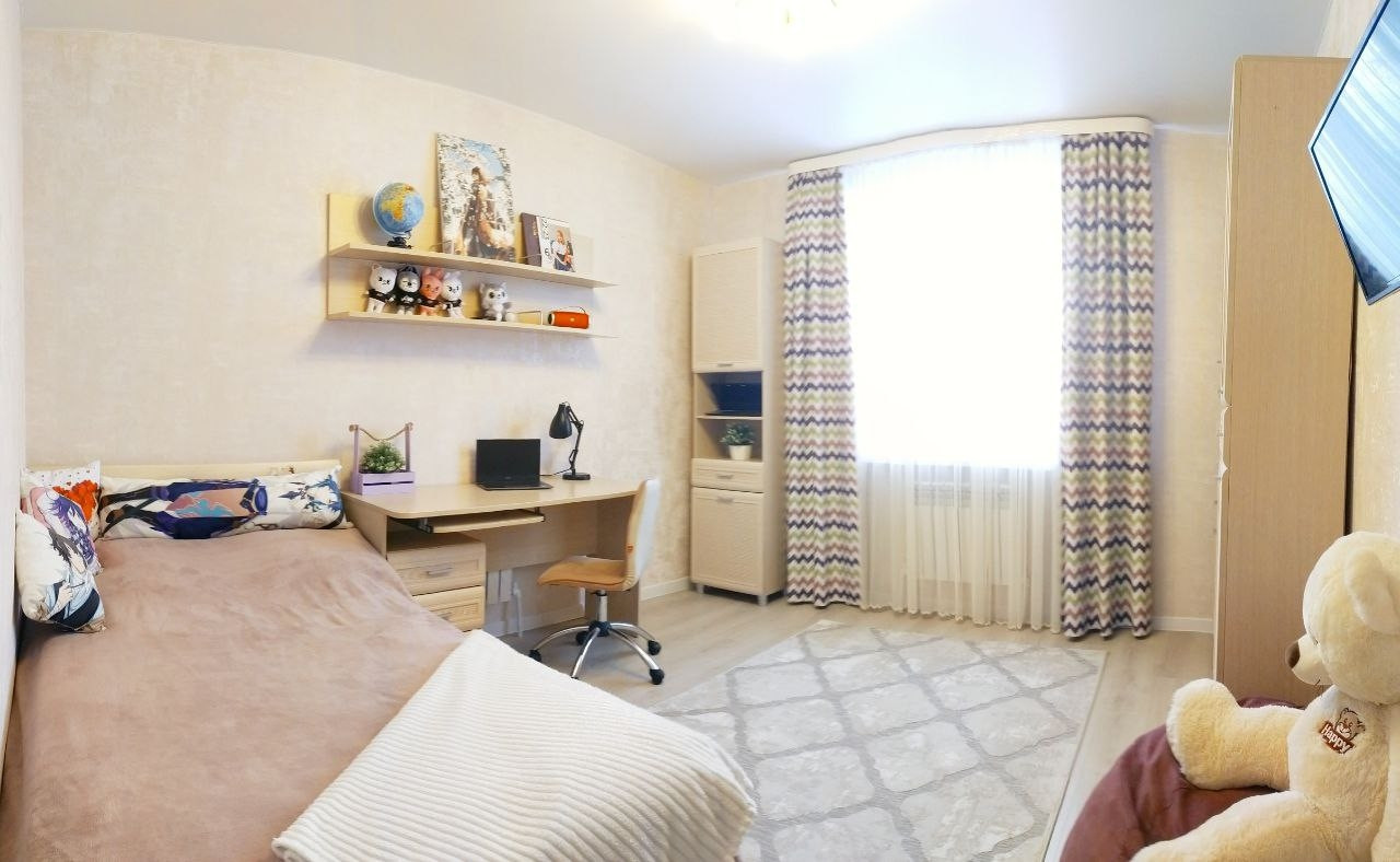 Кухня-гостиная 19 кв.м. с двумя окнами и панорамным остеклением, с выходом на балкон.  Из окон открывается вид на площадь Богоявления, Успенский кафедральный собор. Спальня 15 кв.м. и детская 14 кв.м. Санузел совмещённый 4 кв. м.
