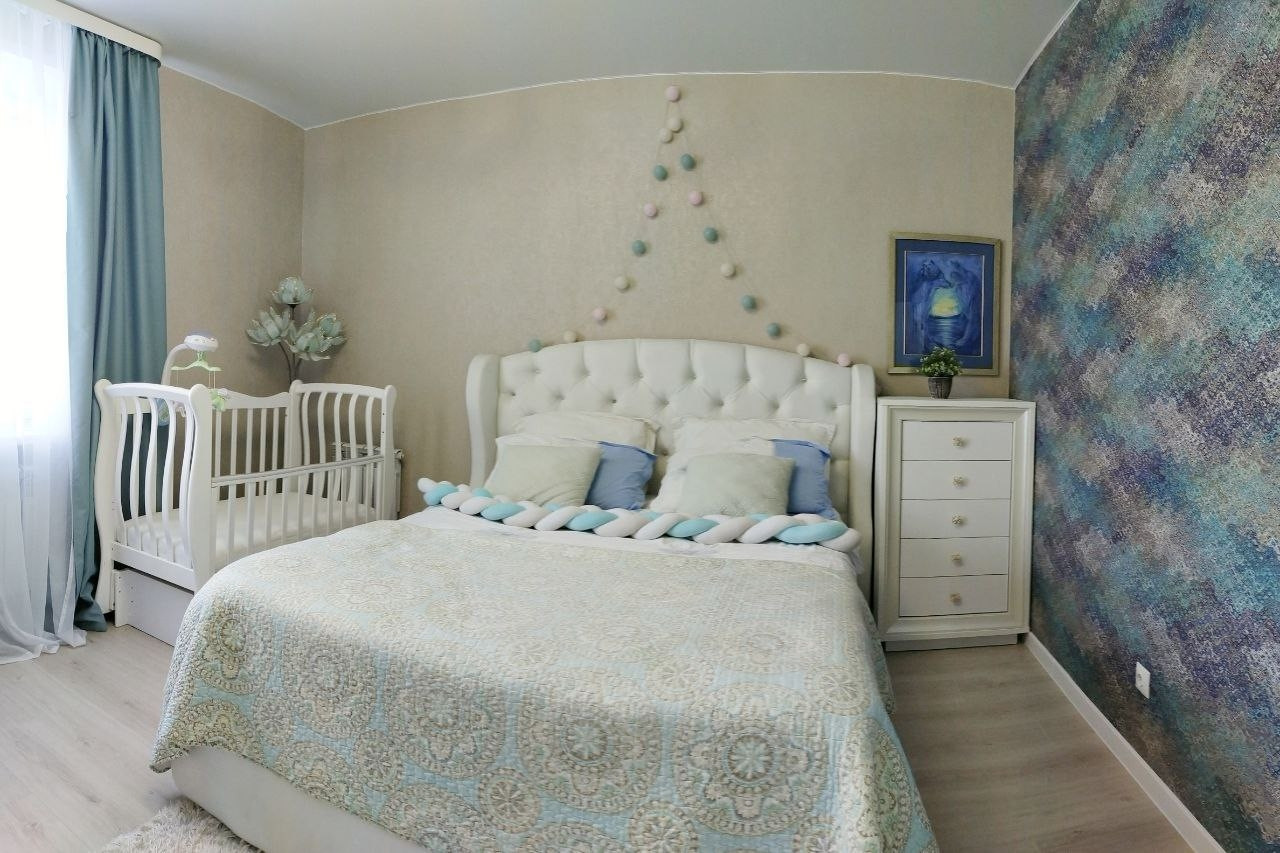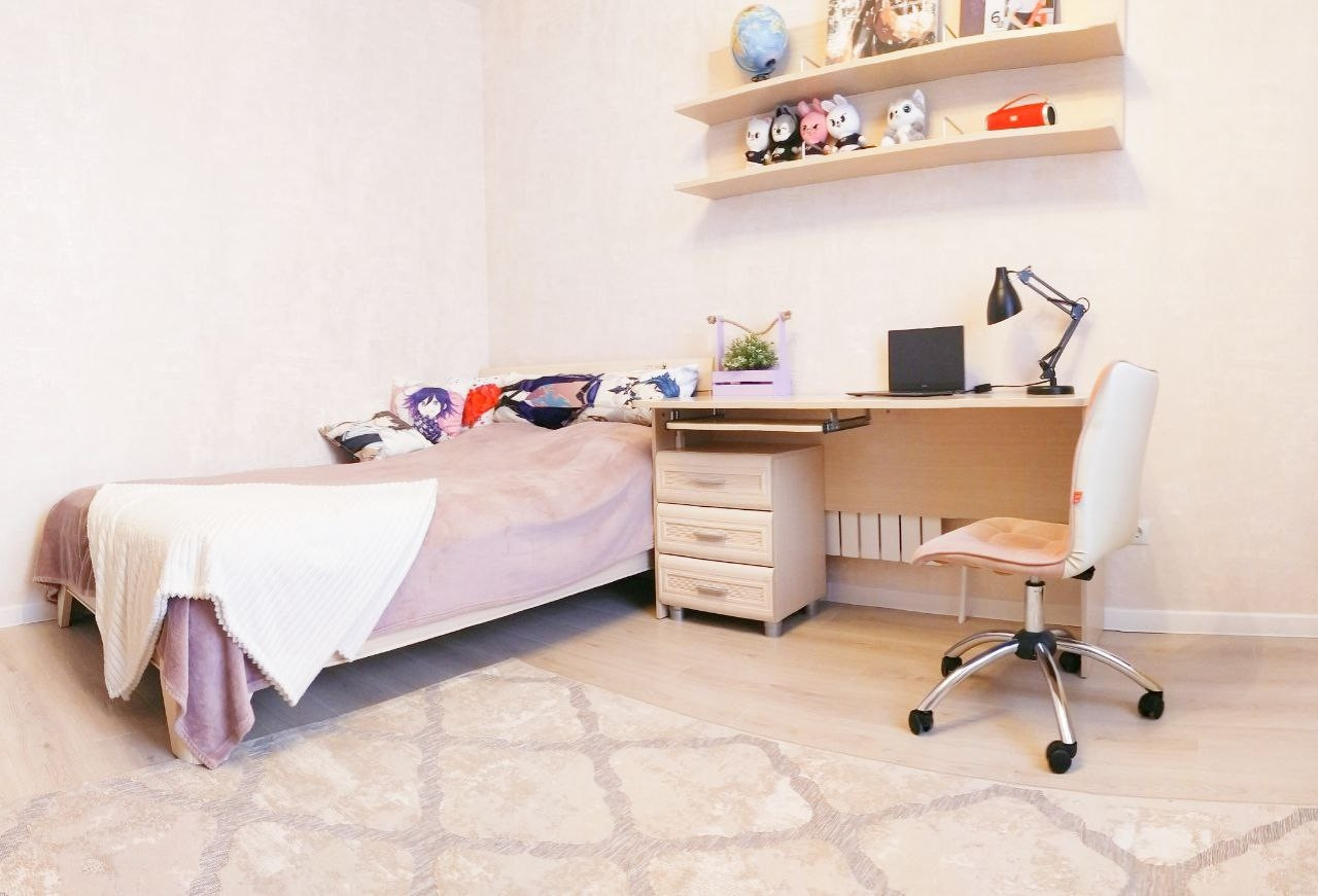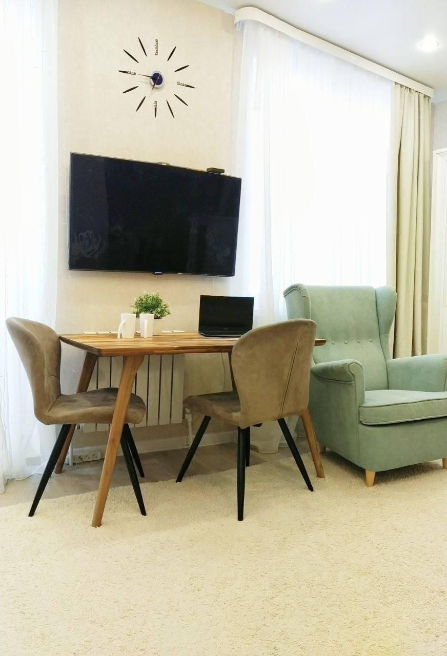 Кухня-гостиная 19 кв.м. с двумя окнами и панорамным остеклением, с выходом на балкон.  Из окон открывается вид на площадь Богоявления, Успенский кафедральный собор. Спальня 15 кв.м. и детская 14 кв.м. Санузел совмещённый 4 кв. м.