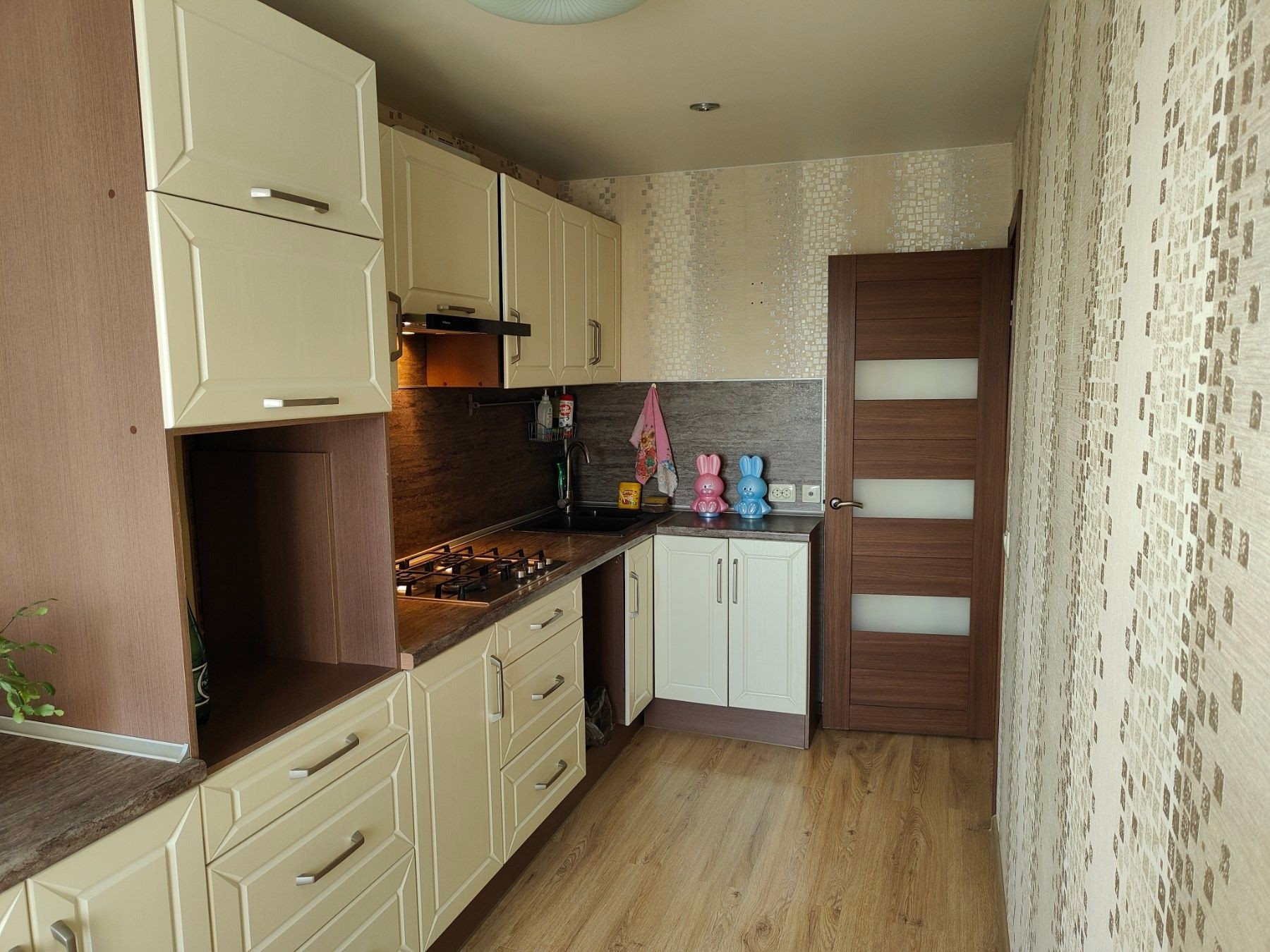 На кухне остаётся кухонный гарнитур со встроенной варочной поверхностью и вытяжкой.