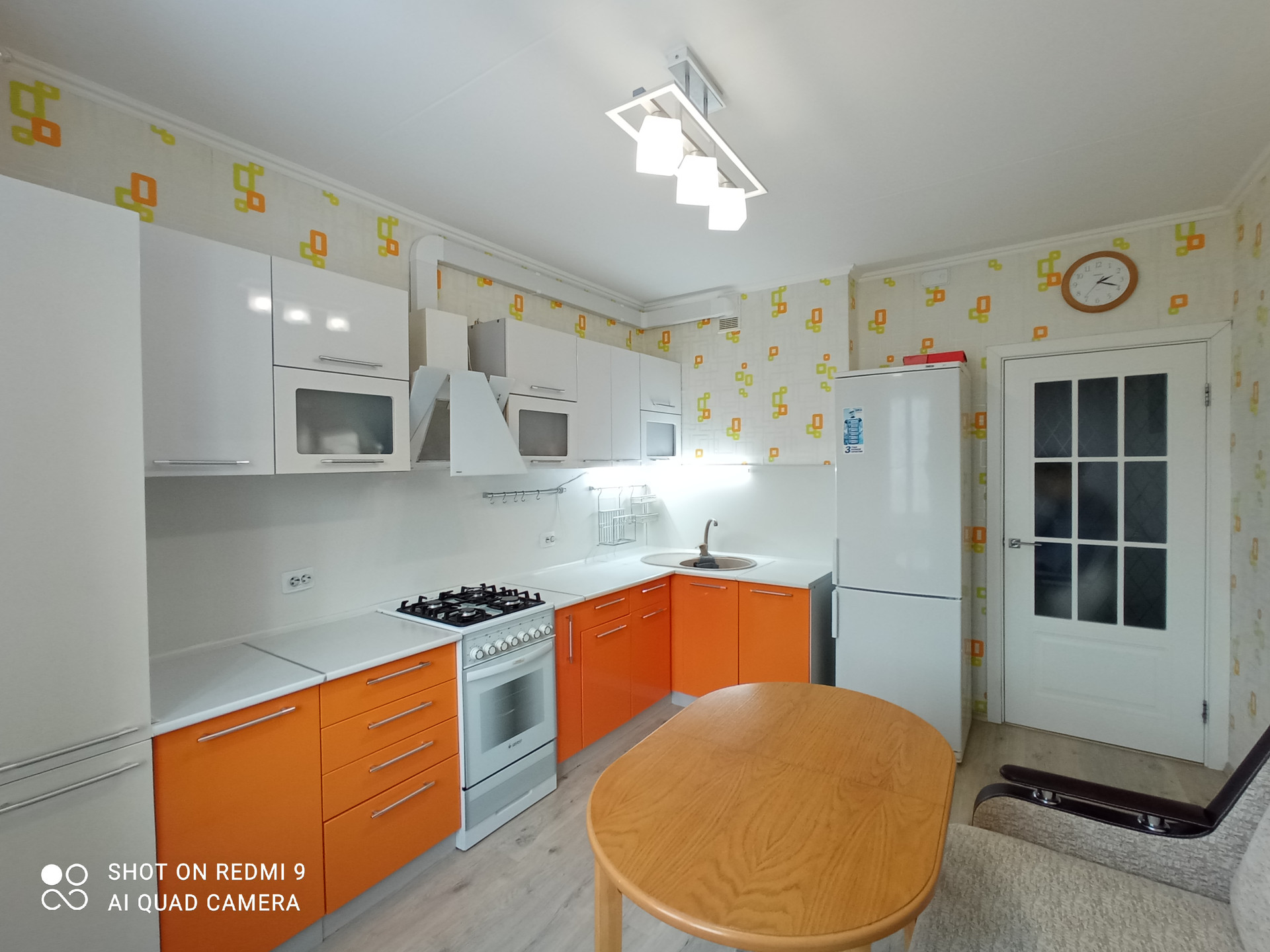 на кухне - холодильник, морозильная камера, сушильная машина , кухонный гарнитур, шкаф