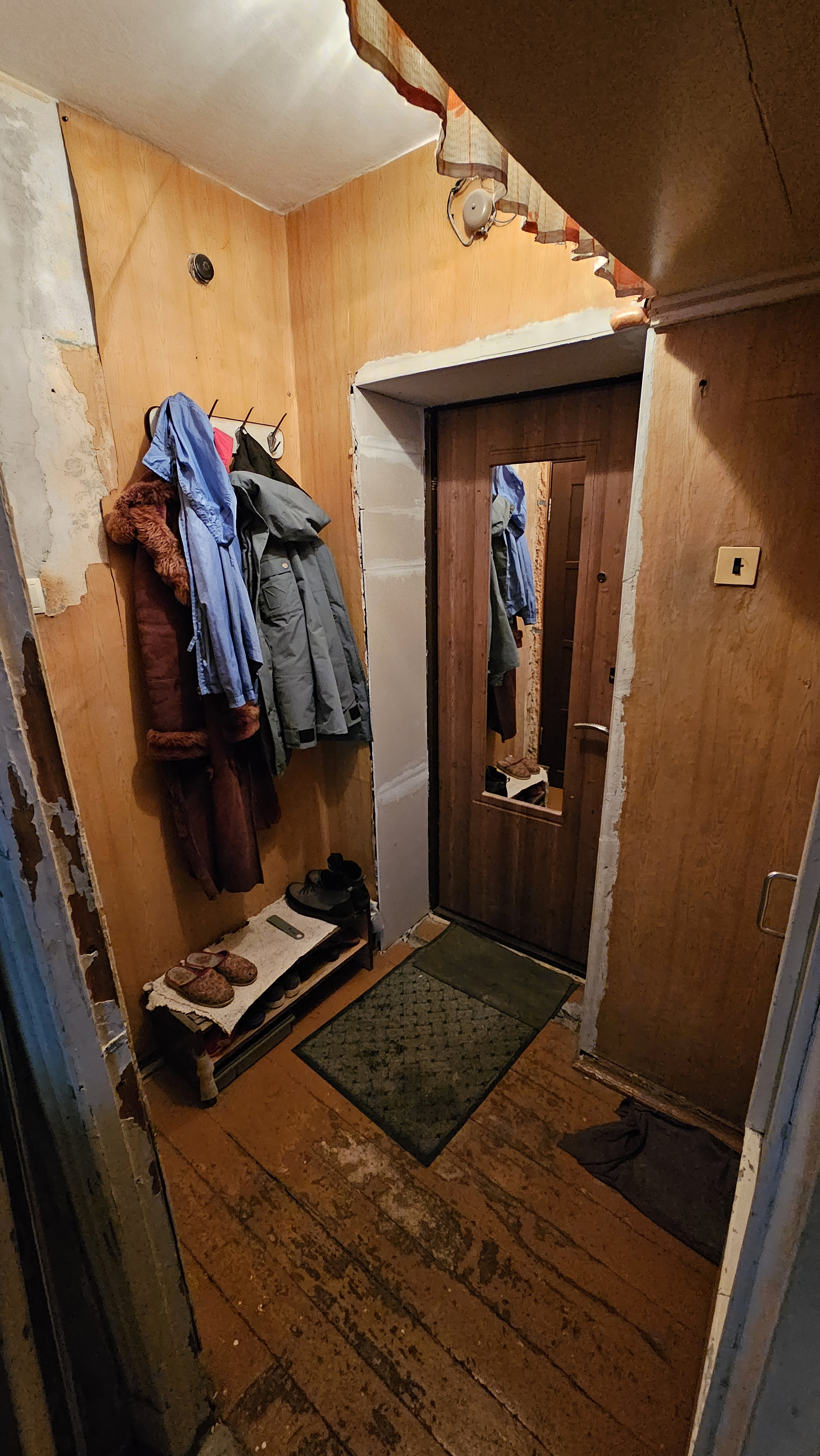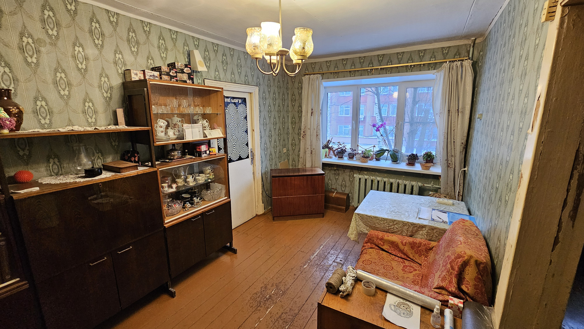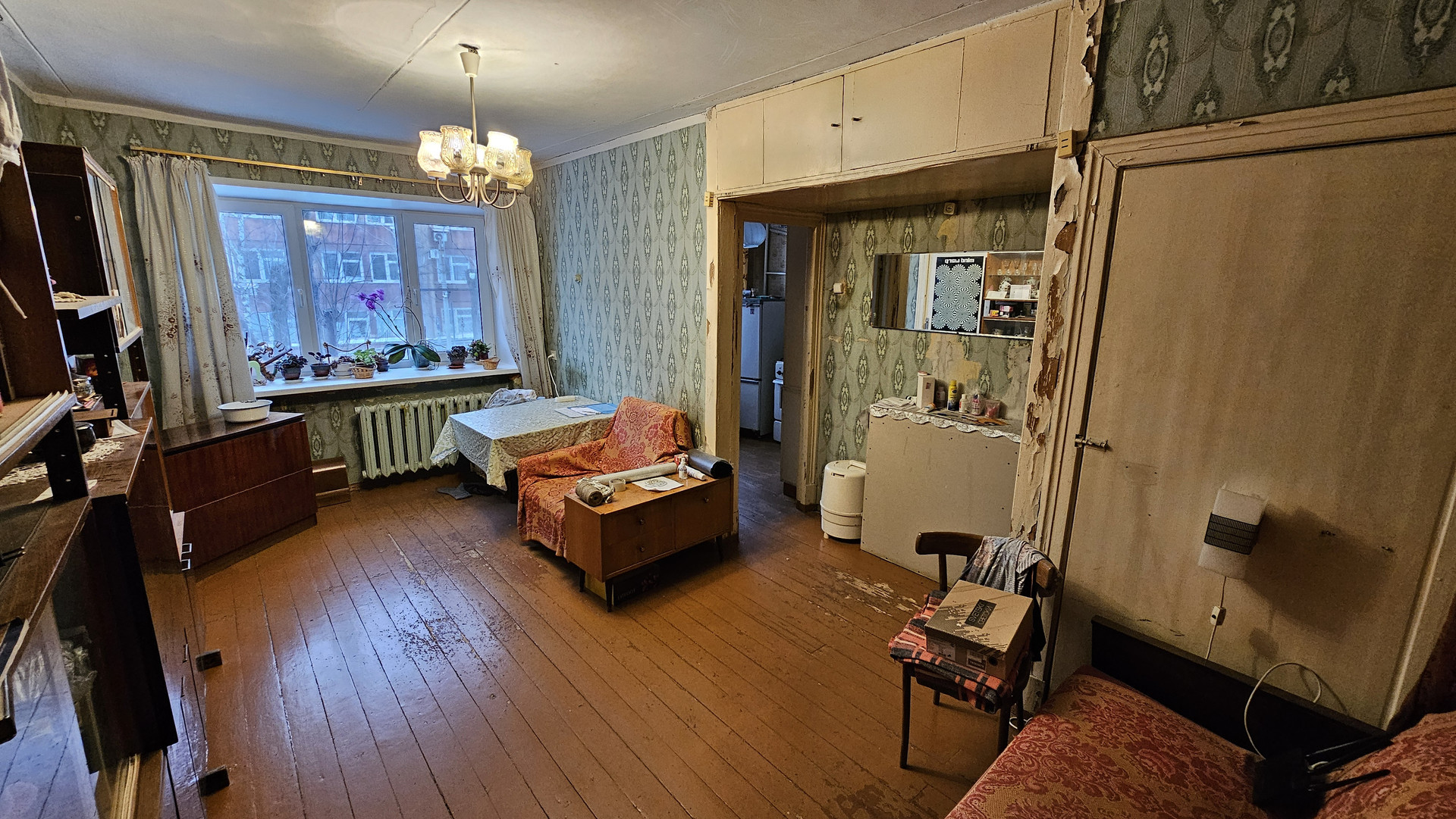 В квартире добротная входная дверь с зеркалом, хорошие пластиковые окна с обеими открывающимися створками.