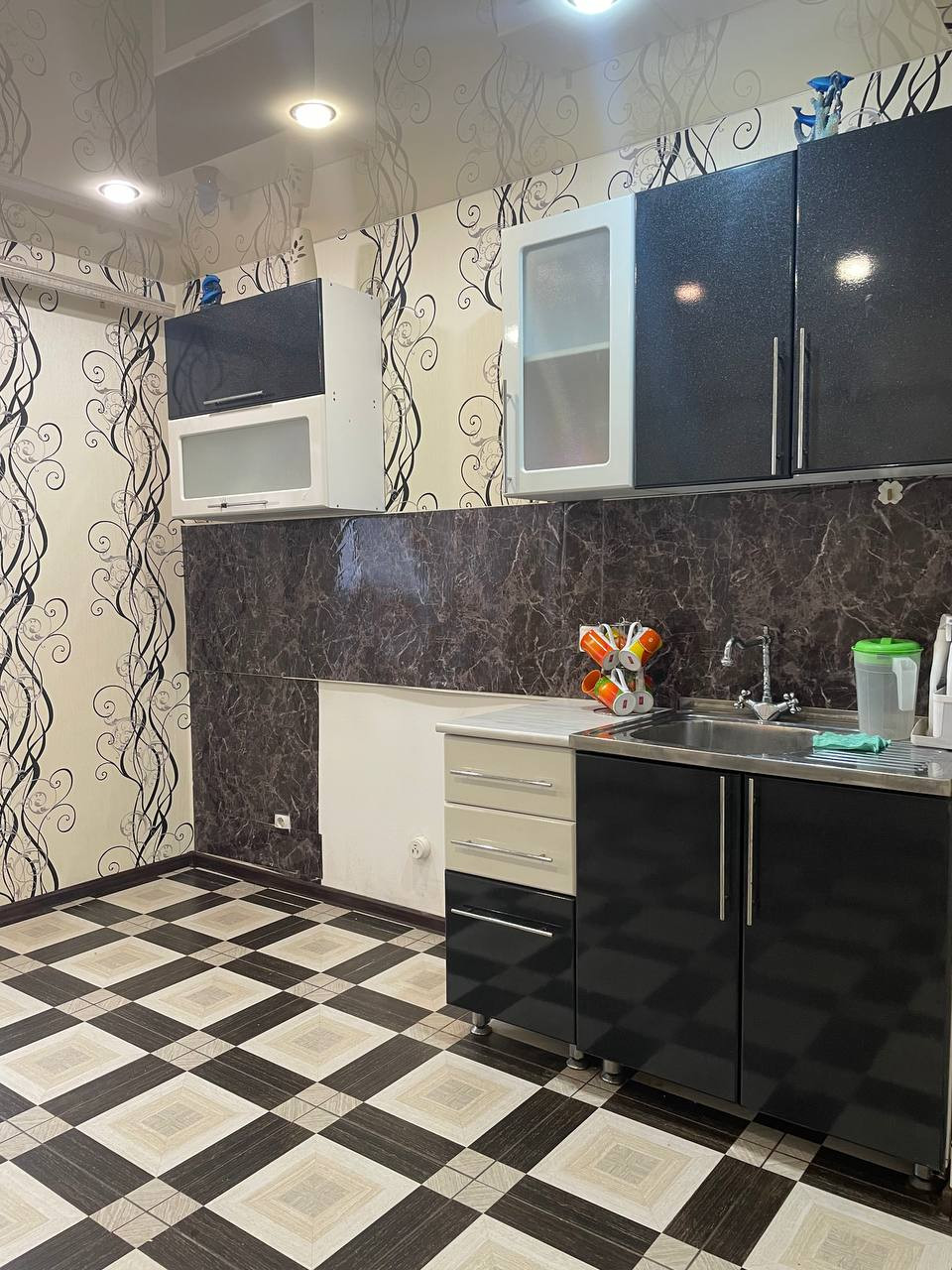 - кухня 10,7 кв.м., оставляем кухонный гарнитур.Потолок натяжной с точечными светильниками, пол выложен керамической плиткой.