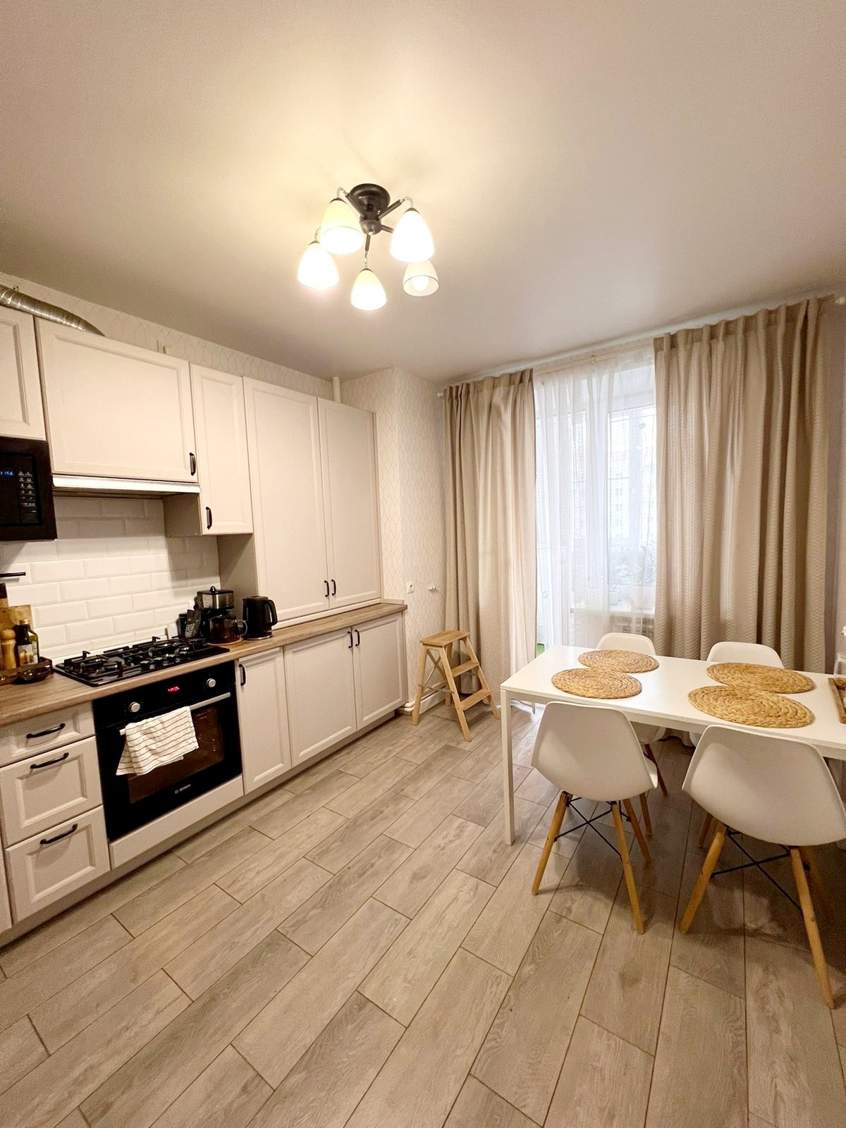 Просторная кухня с кухонным  гарнитуром, который остаётся новым владельцам.