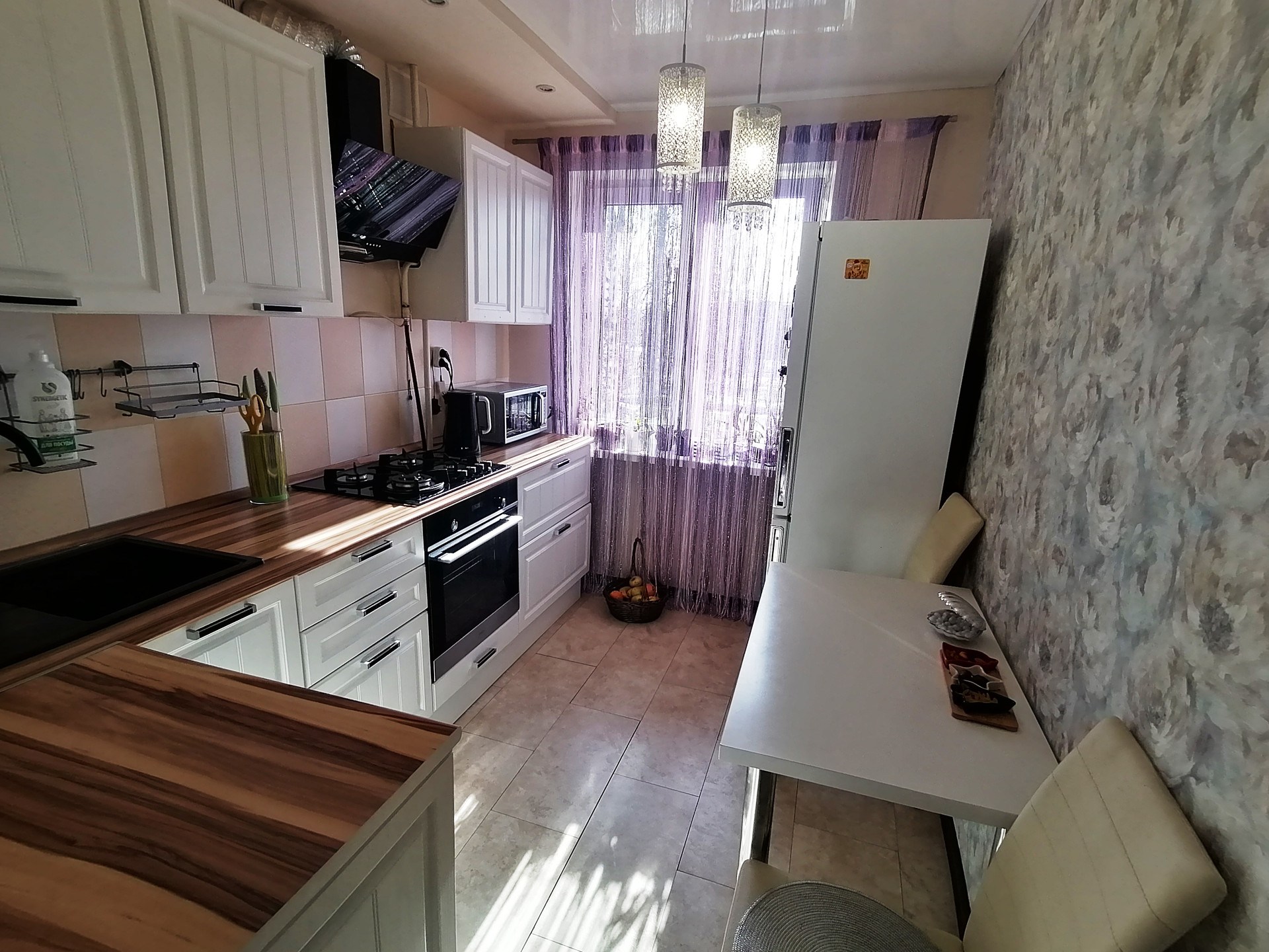 -с ремонтом , натяжные потолки, в комнатах ламинат, кухня, санузел и коридор в плитке.  Частично с мебелью
