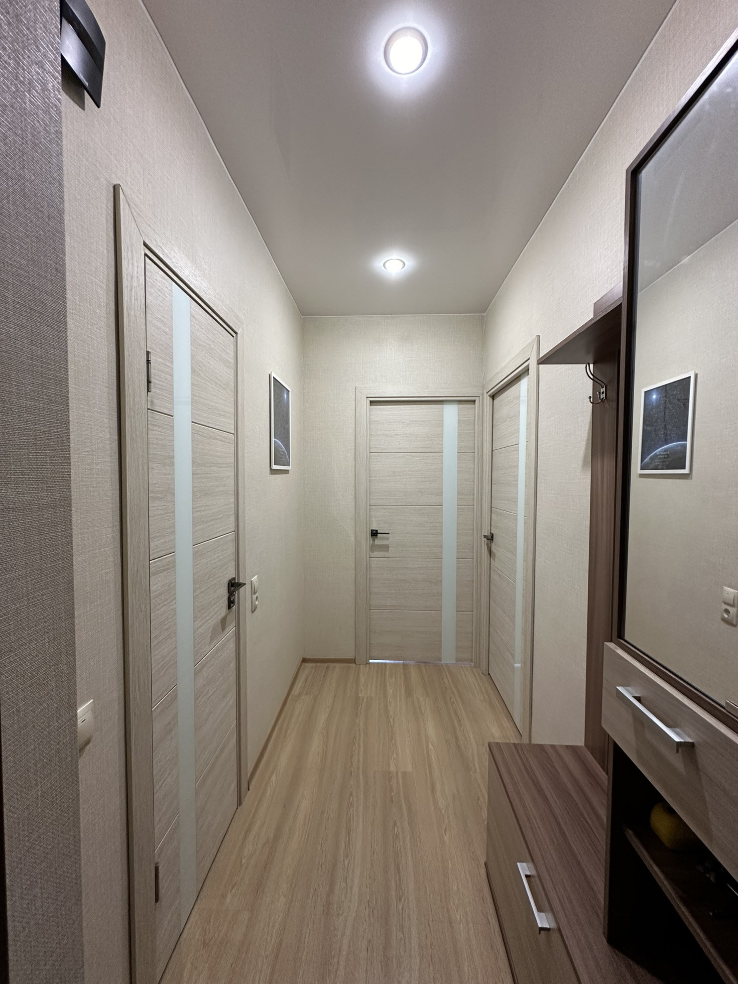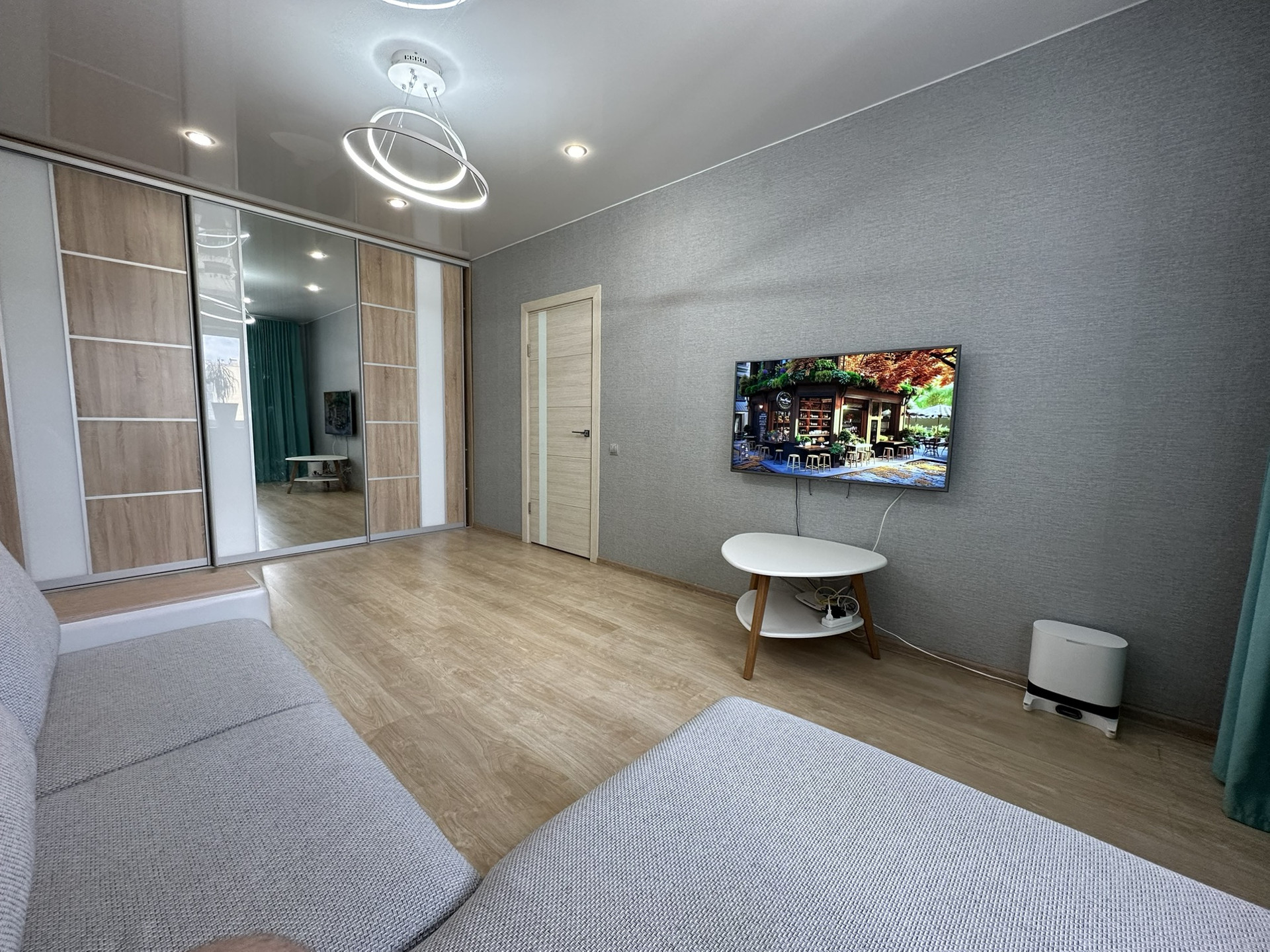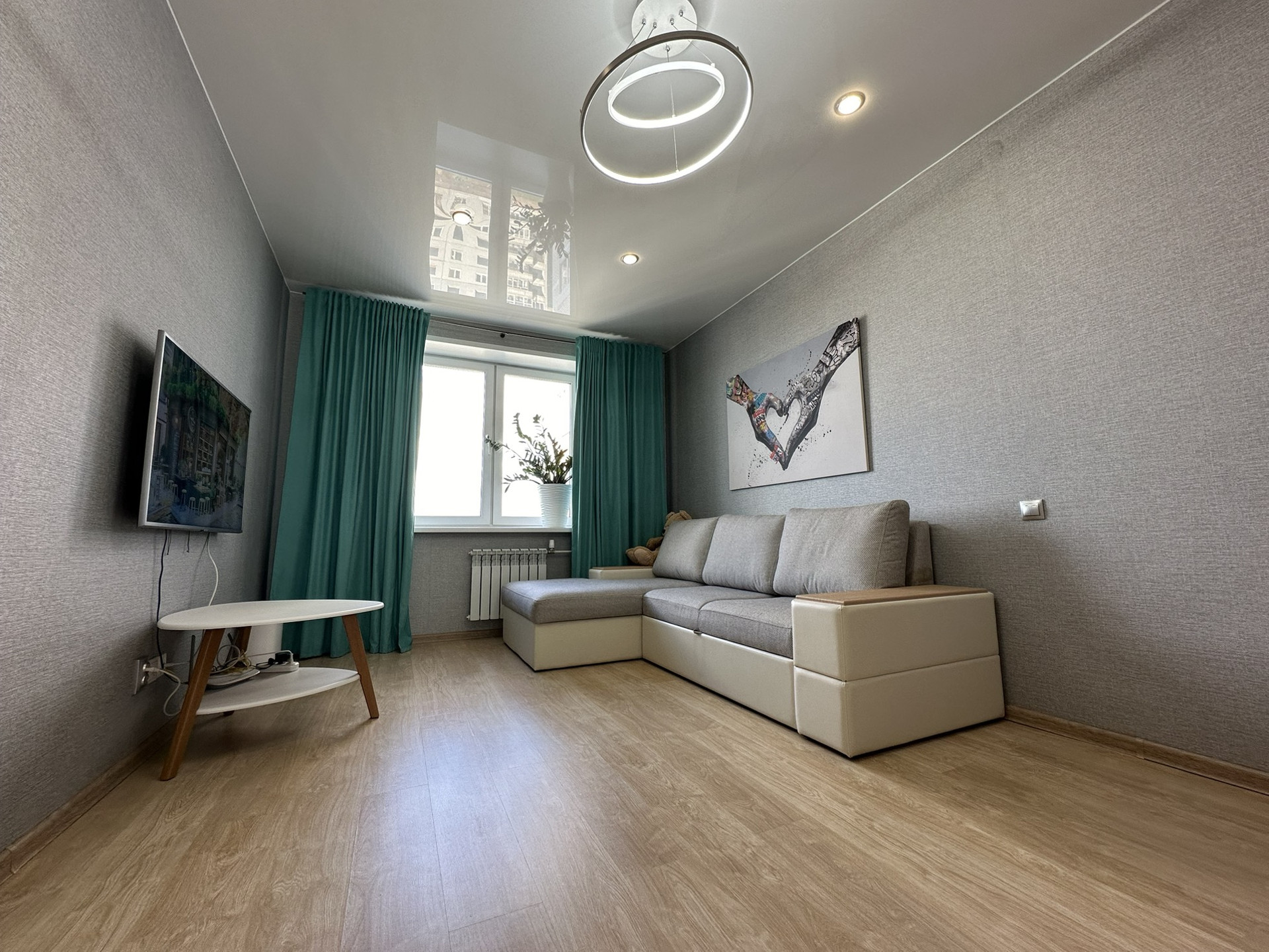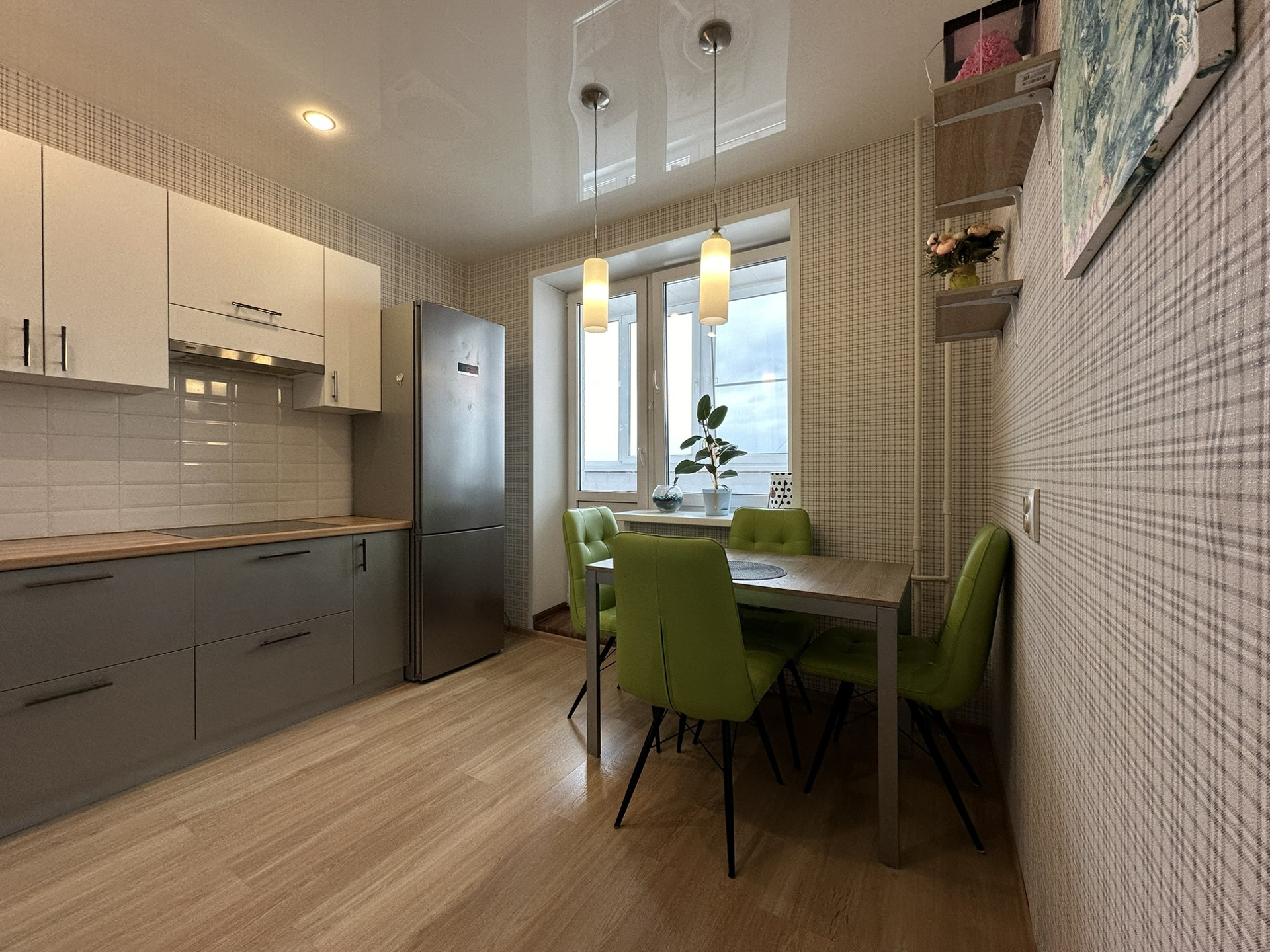 ламинат, натяжные потолки с точечным освещением и подвесными светильниками, ПВХ окна, застекленный балкон, ванная в плитке.
