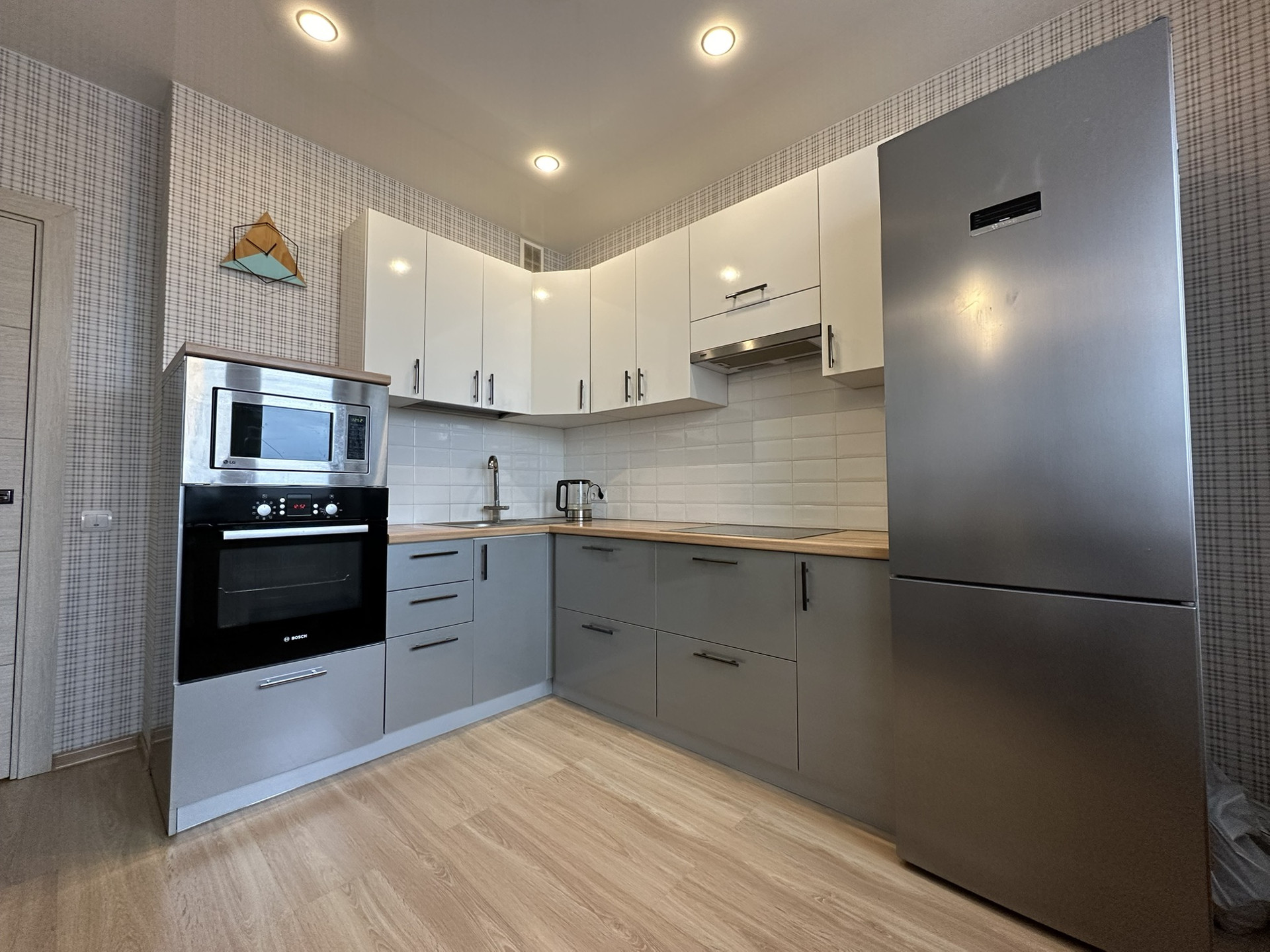 Квартира полностью оборудована мебелью и техникой: кухонный гарнитур с бытовой техникой Bosh (холодильник, индукционная плита, духовой шкаф, вытяжка, встраиваемая микроволновая печь), мягкая мебель, встроенный шкаф.
