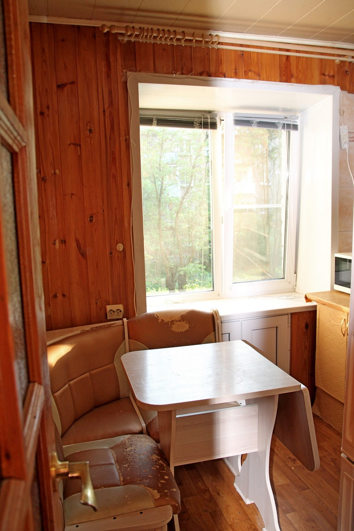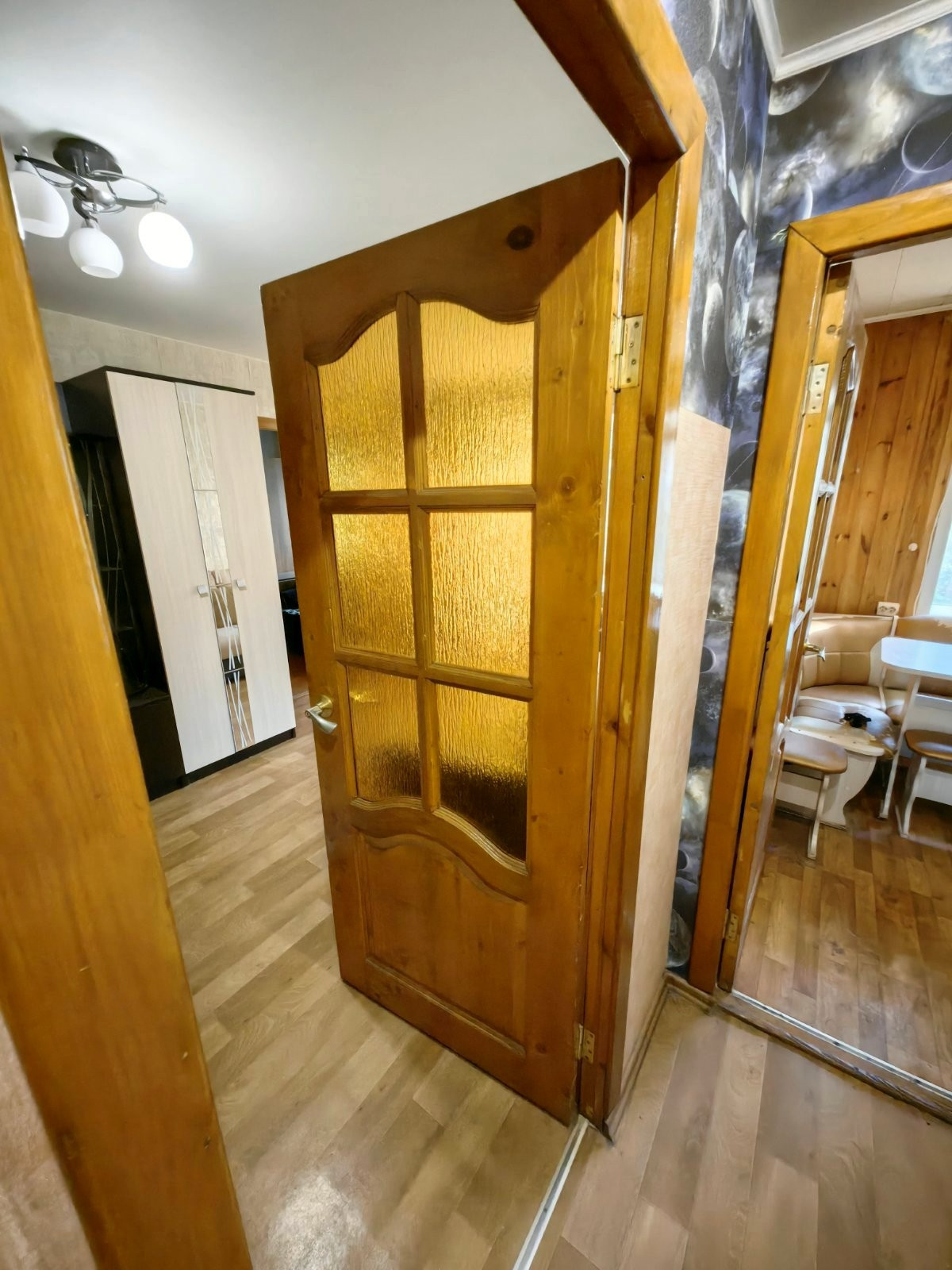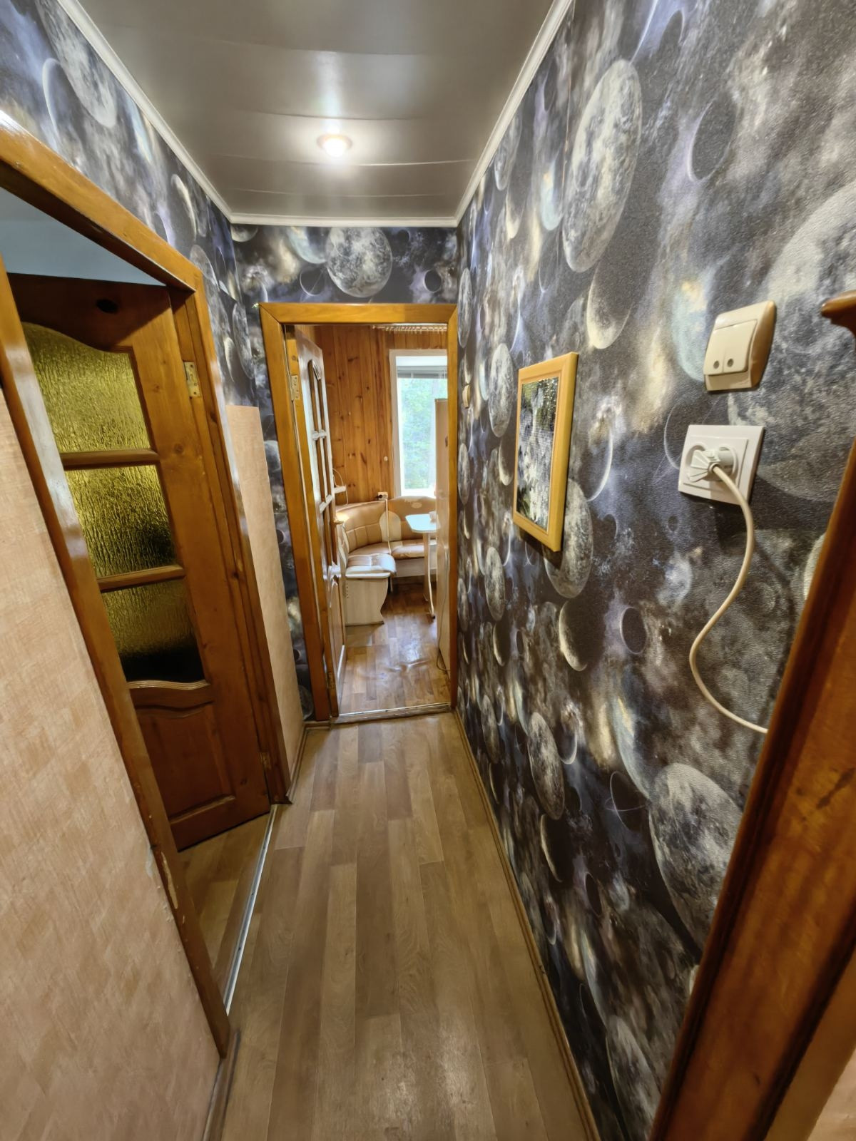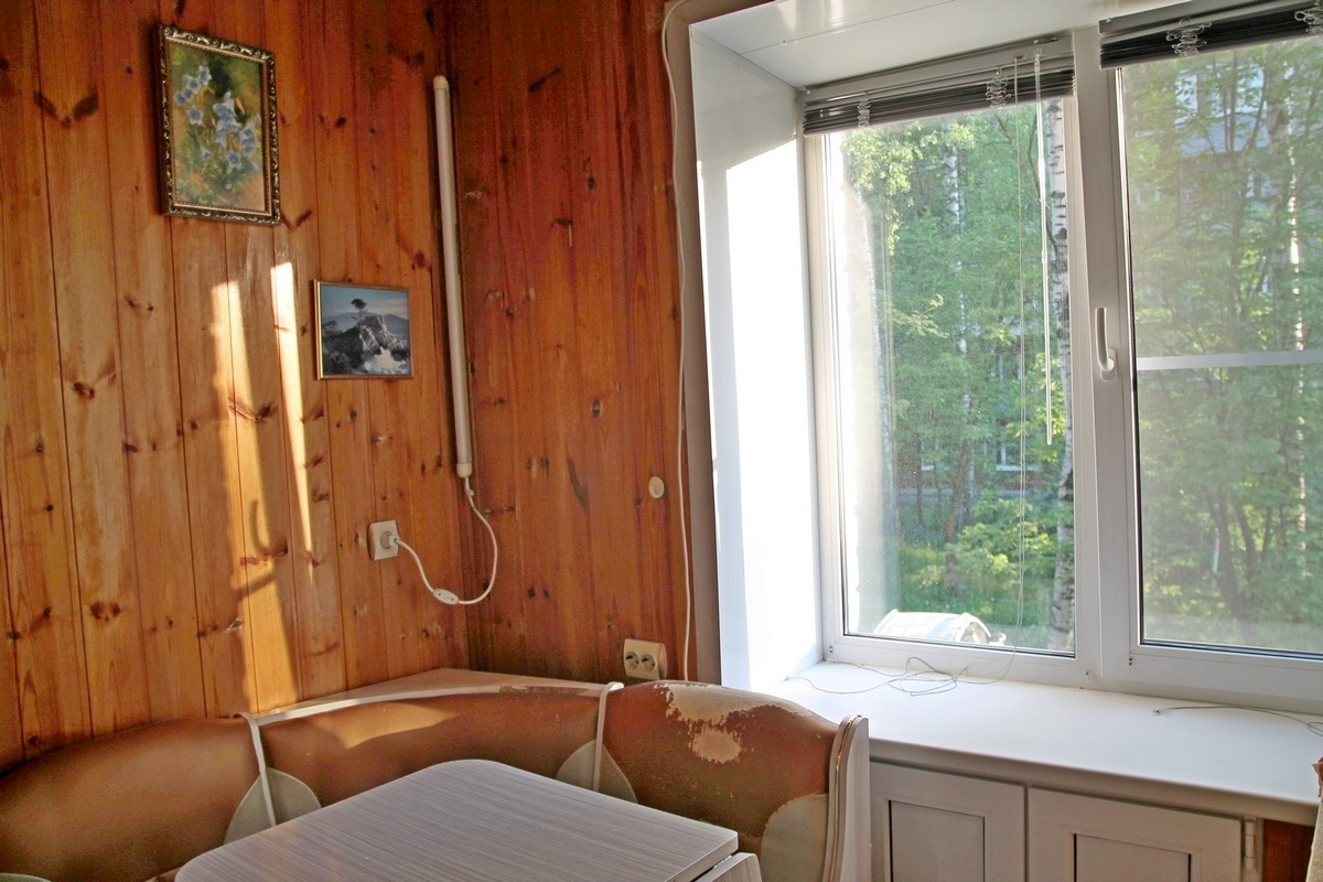 Все окна в квартире пластиковые. Потолки в комнате натяжные, в кухне и санузле - панели, межкомнатные двери деревянные.