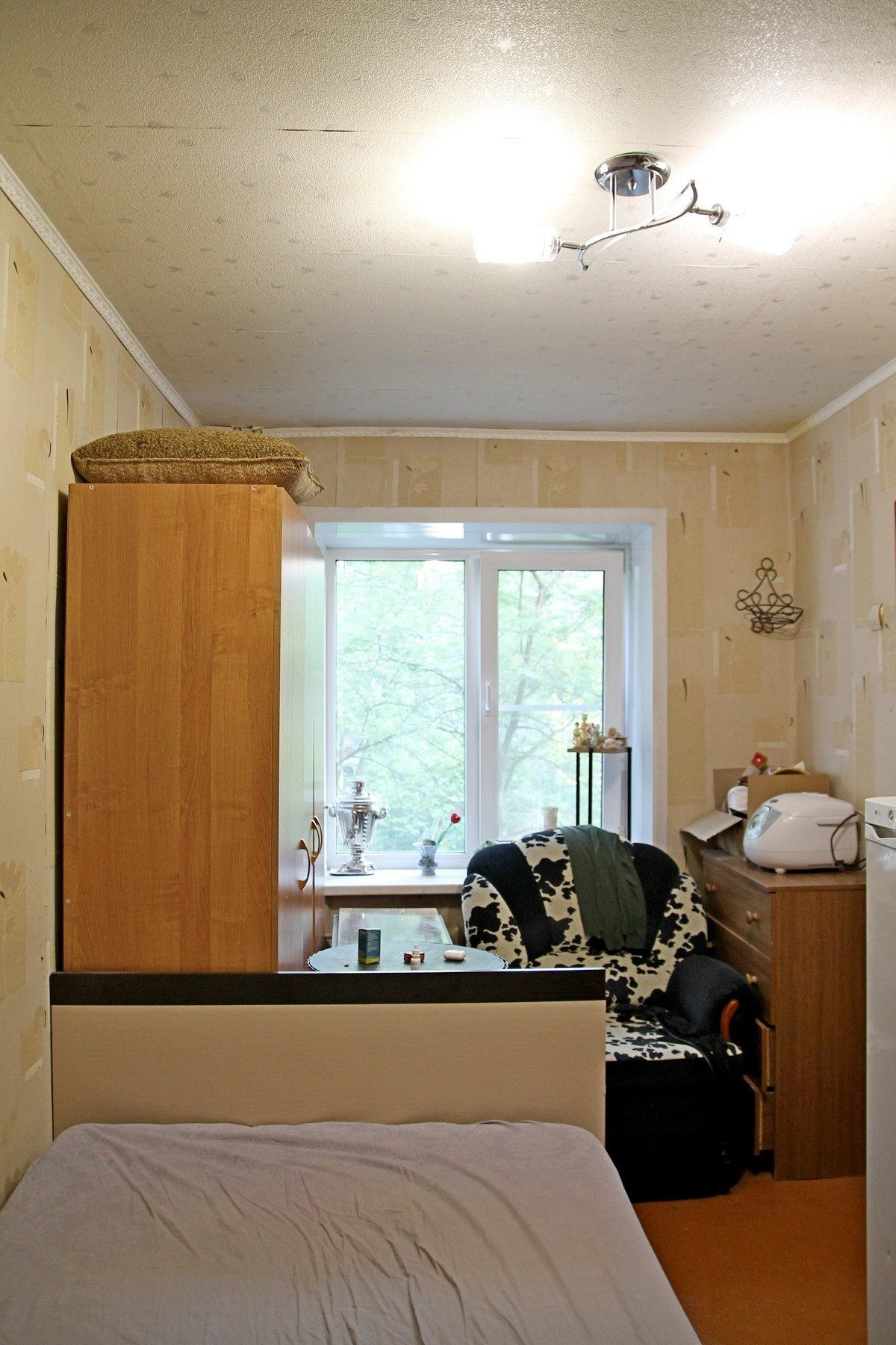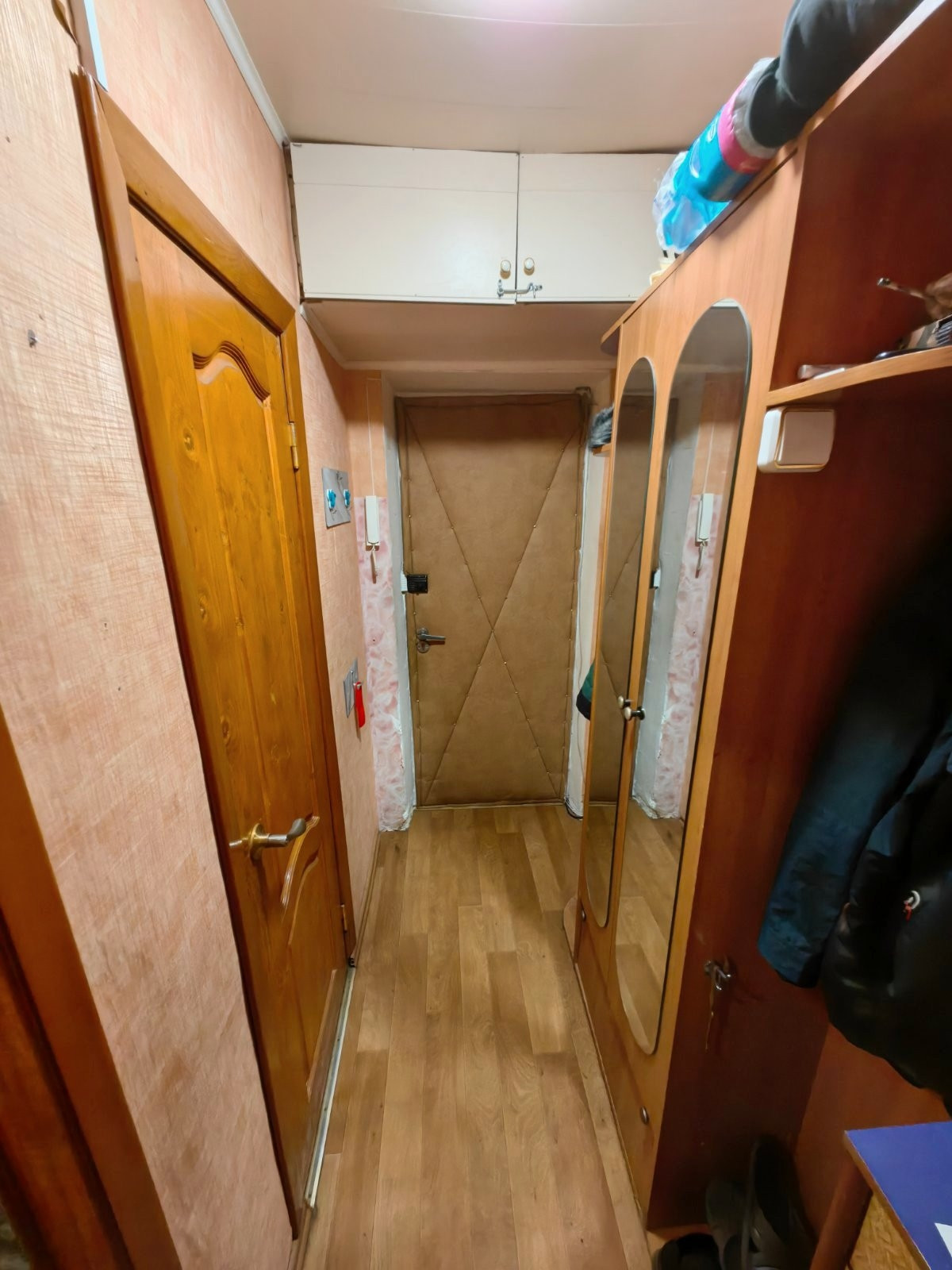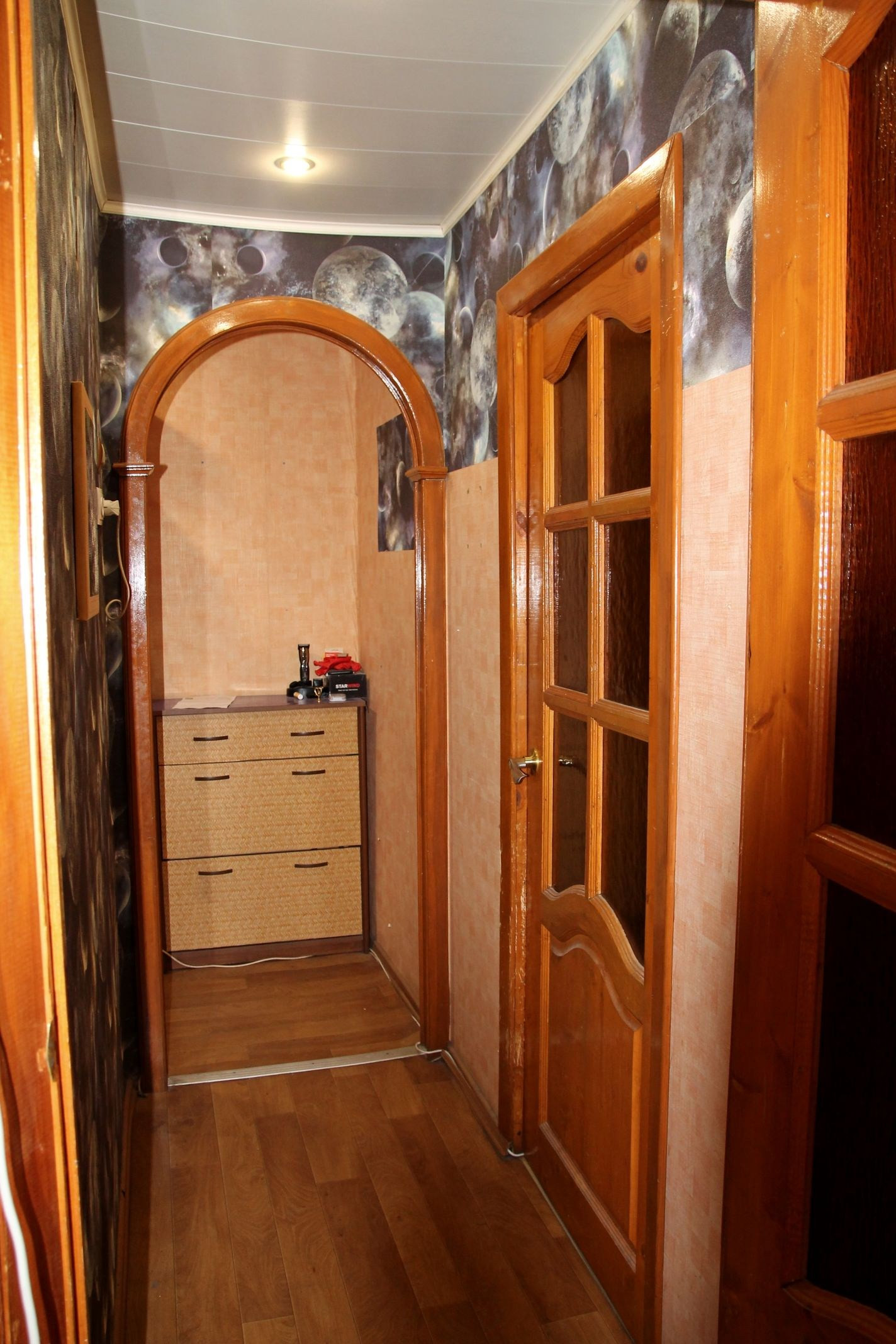 Все окна в квартире пластиковые. Потолки в комнате натяжные, в кухне и санузле - панели, межкомнатные двери деревянные.