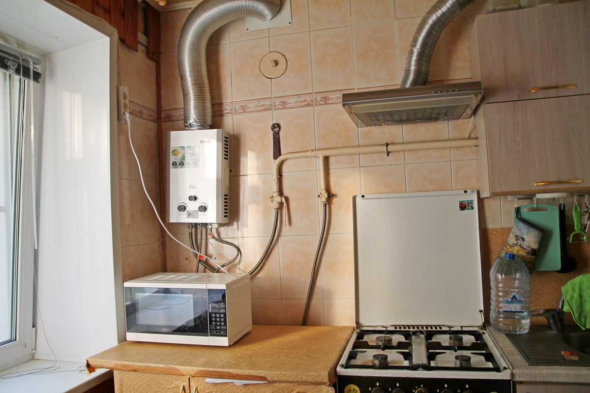 В кухне установлена газовая плита и новая колонка, отделка стен вагонкой и кафелем.